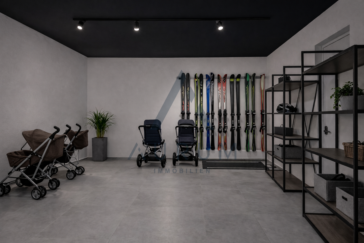 Die hochwertige Ausstattung umfasst Eichenparkett in Landhausdielenoptik, Fußbodenheizung, großformatige Fliesen in Bad und WC, elektrische Raffstores sowie große Fensterflächen für helle, freundliche Räume. Ergänzt wird das Angebot durch eine Tiefgarage, Fahrrad- und Skiräume sowie praktische Nebenflächen.