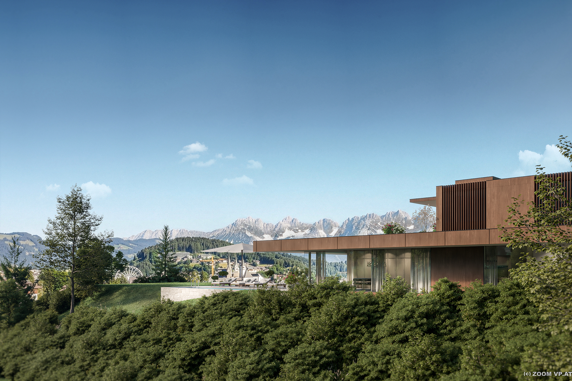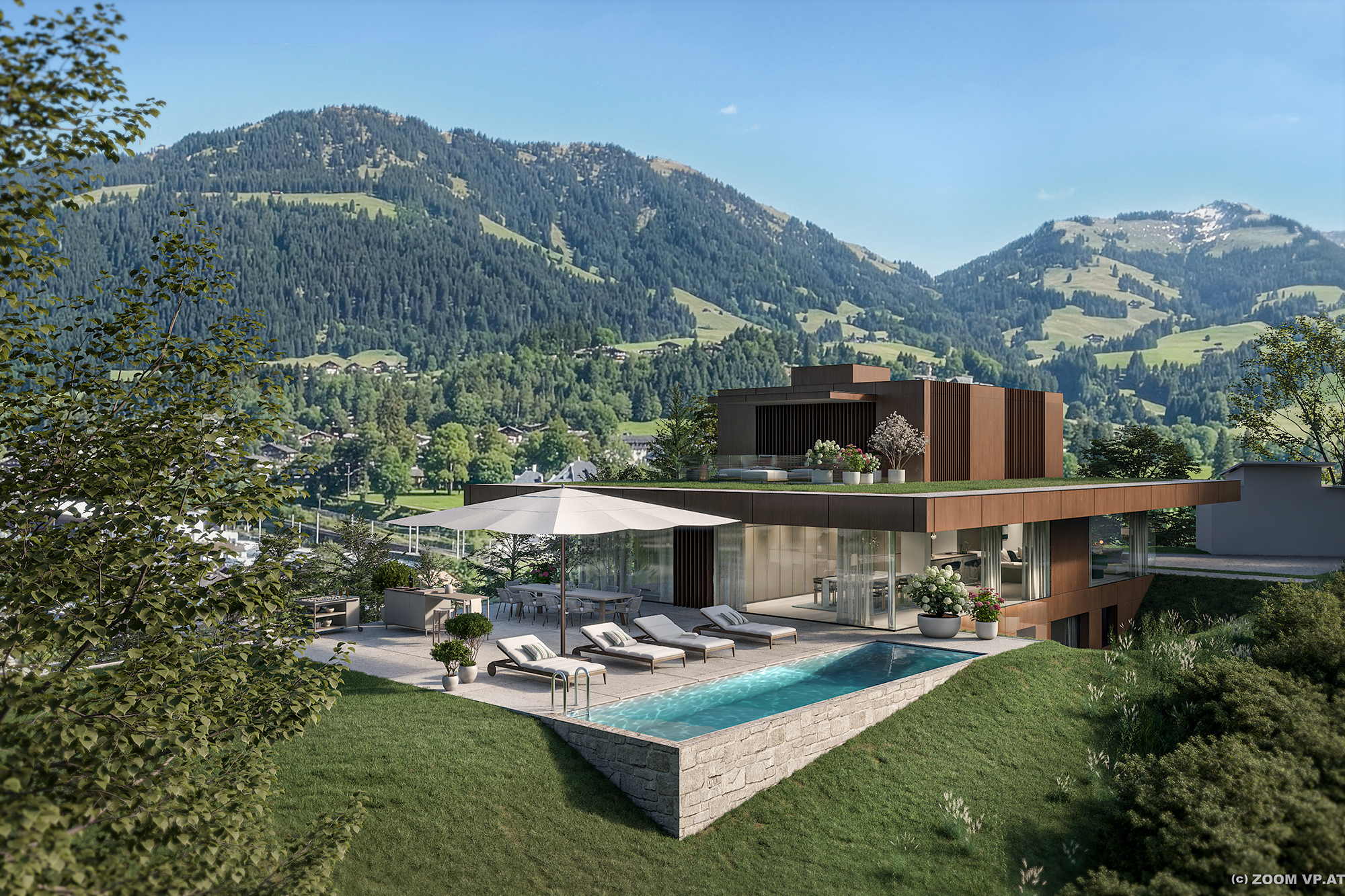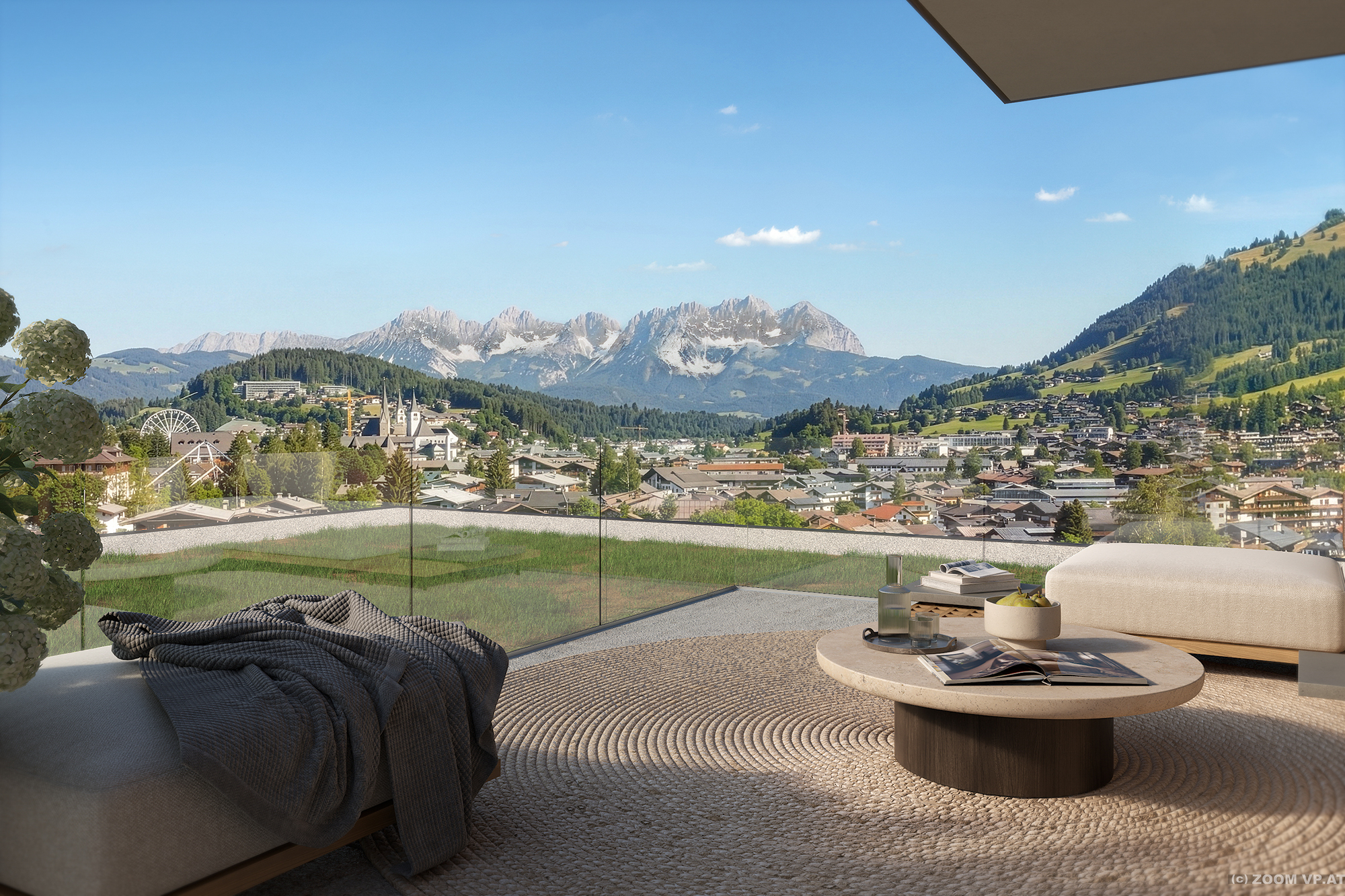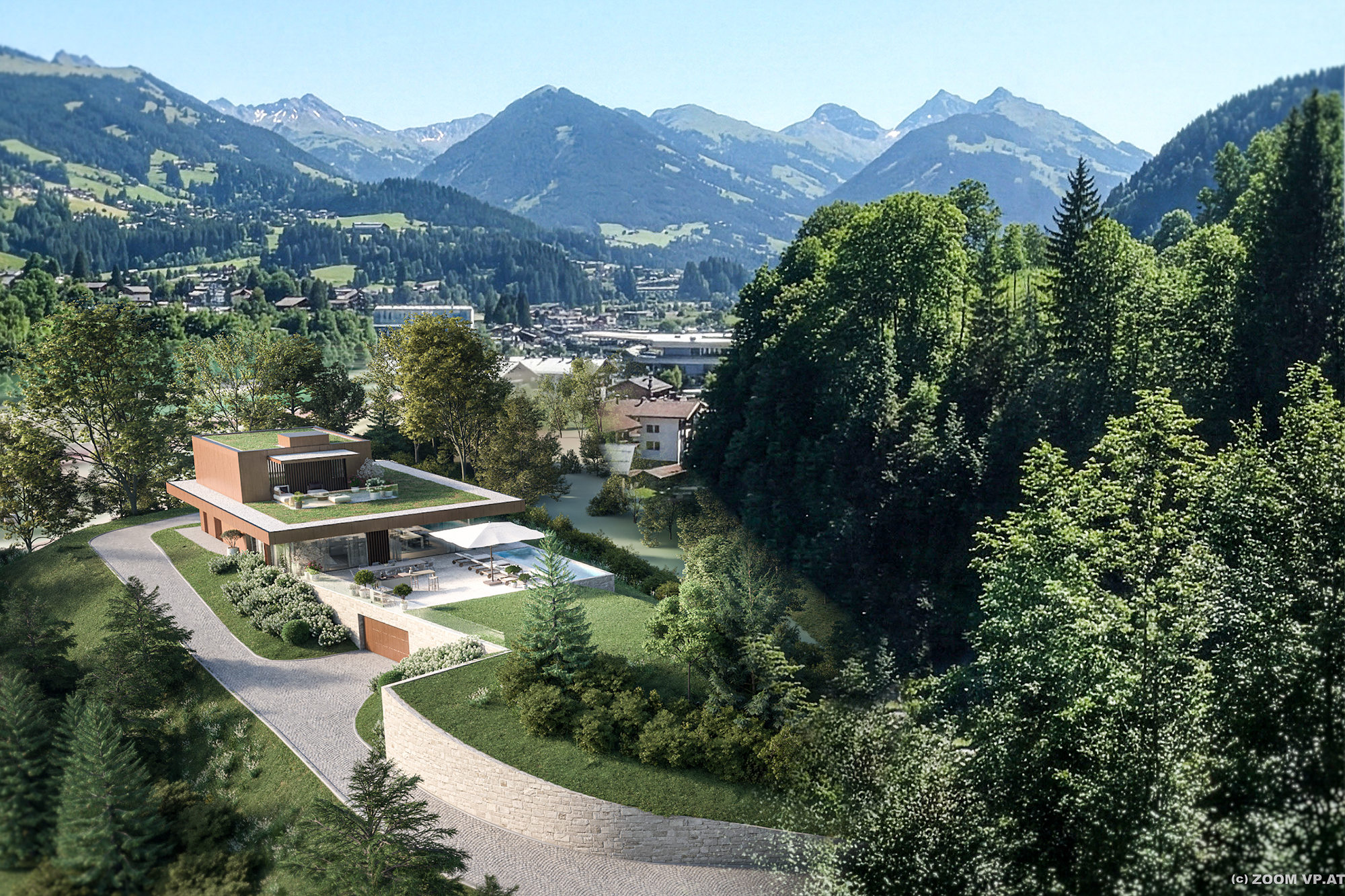 Die Lage bietet maximale Privatsphäre, Zentrumsnähe und einen beeindruckenden Panoramablick auf den Hahnenkamm, Wilden Kaiser und die Kitzbüheler Alpen.