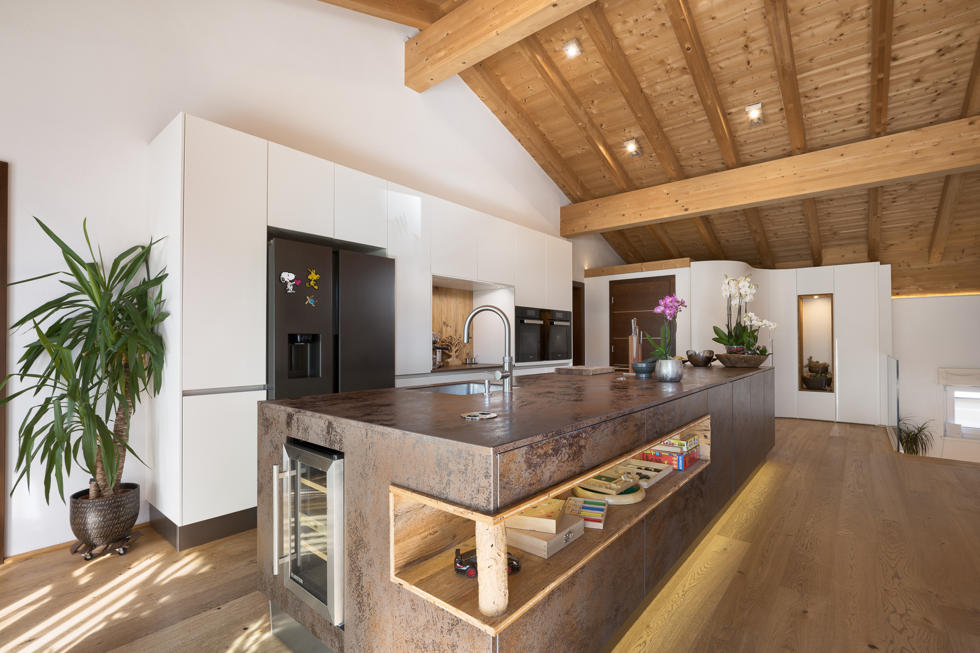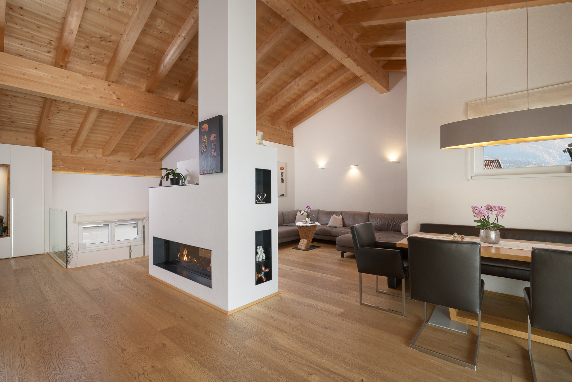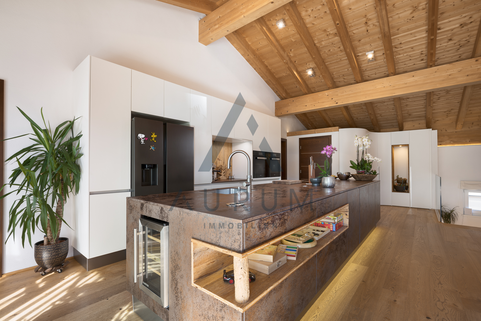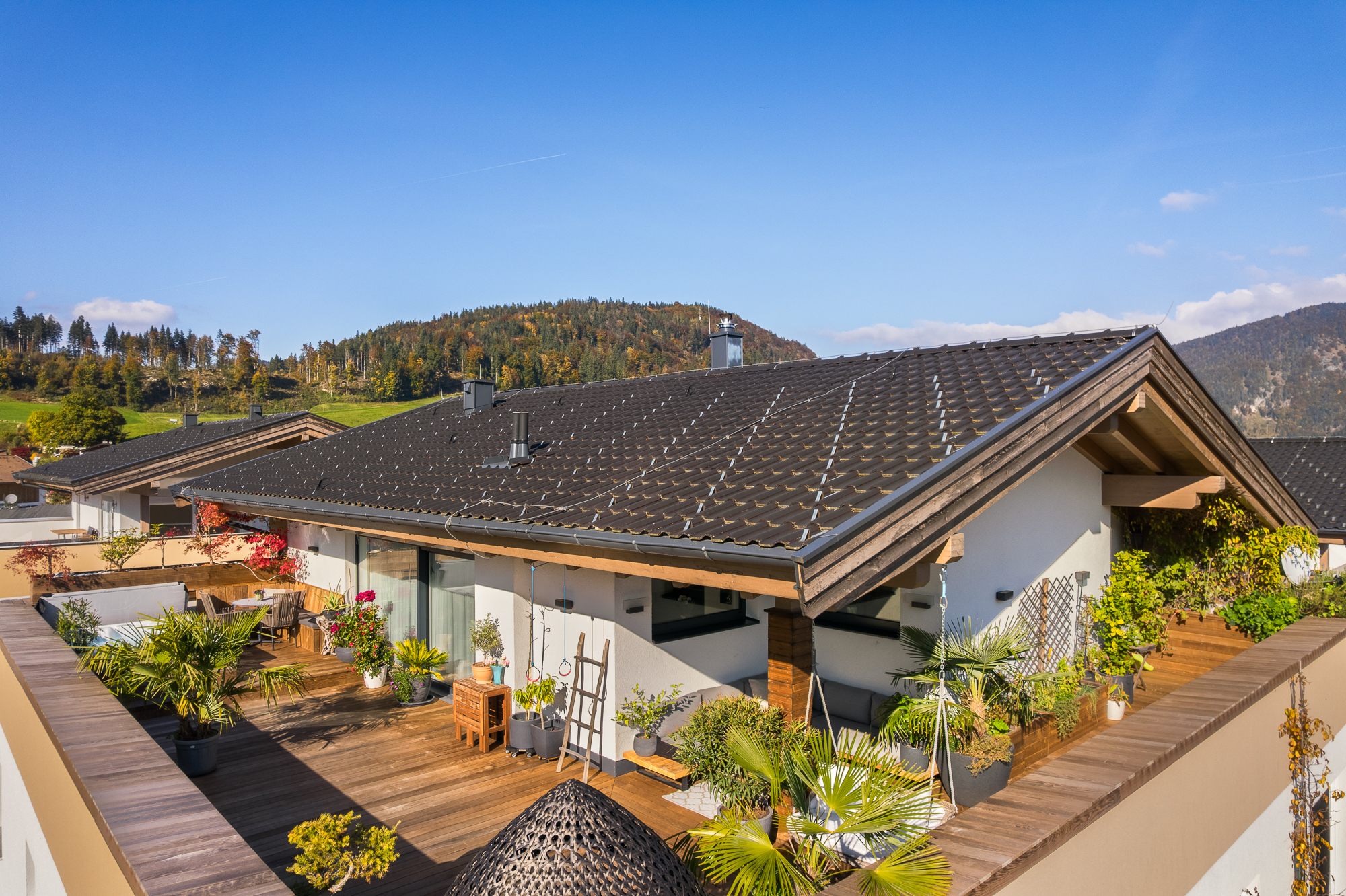 Die großräumige und lichtdurchflutete Wohnküche, ein Abstellraum / Speisekammer, sowie ein Büroraum (bzw. Möglichkeit eines dritten Schlafzimmers) und ein separates Gäste-WC befinden sich im Dachgeschoss. Die Raumhöhen, der offene Sichtdachstuhl, der Kamin sowie die edle Designerküche verleihen dem Obergeschoss ein besonderes Flair. Das absolute Highlight ist die umlaufende und uneinsichtige Dachterrasse mit Sitzecke, Lounge & Ruhebereich und Whirlpool.