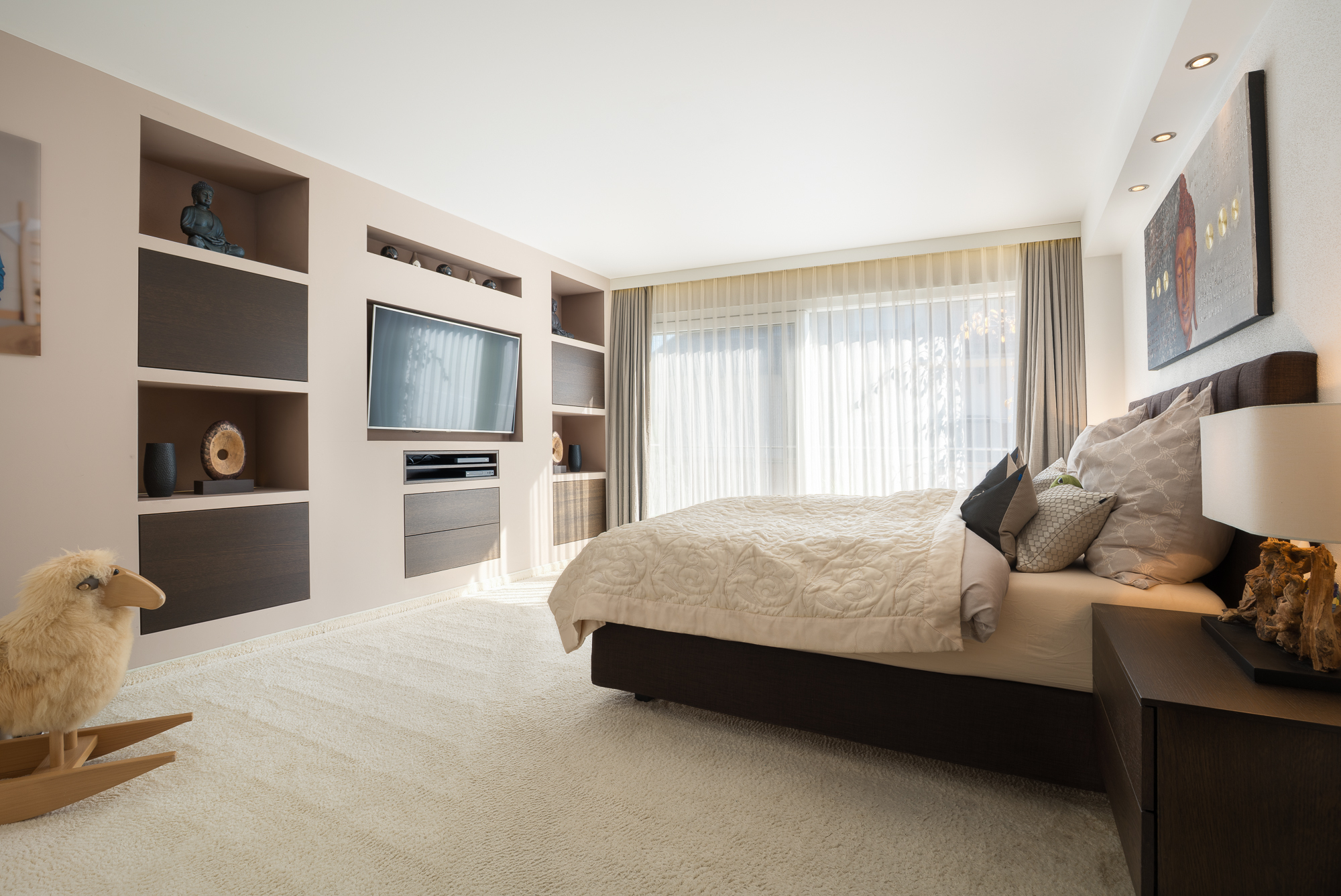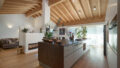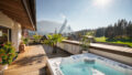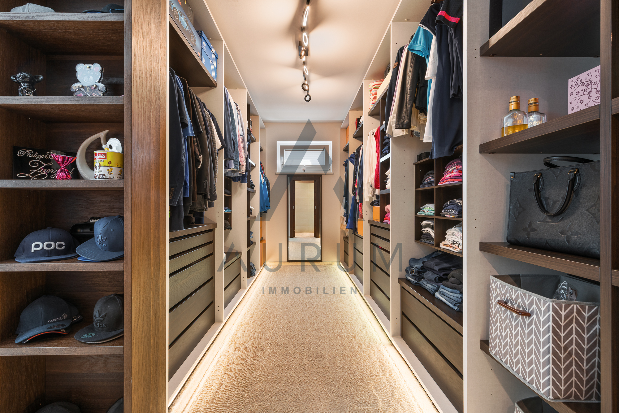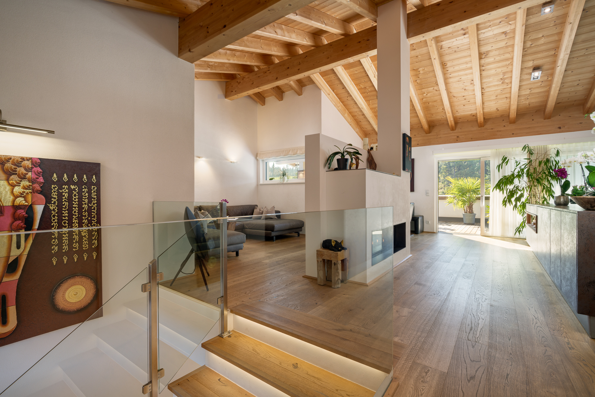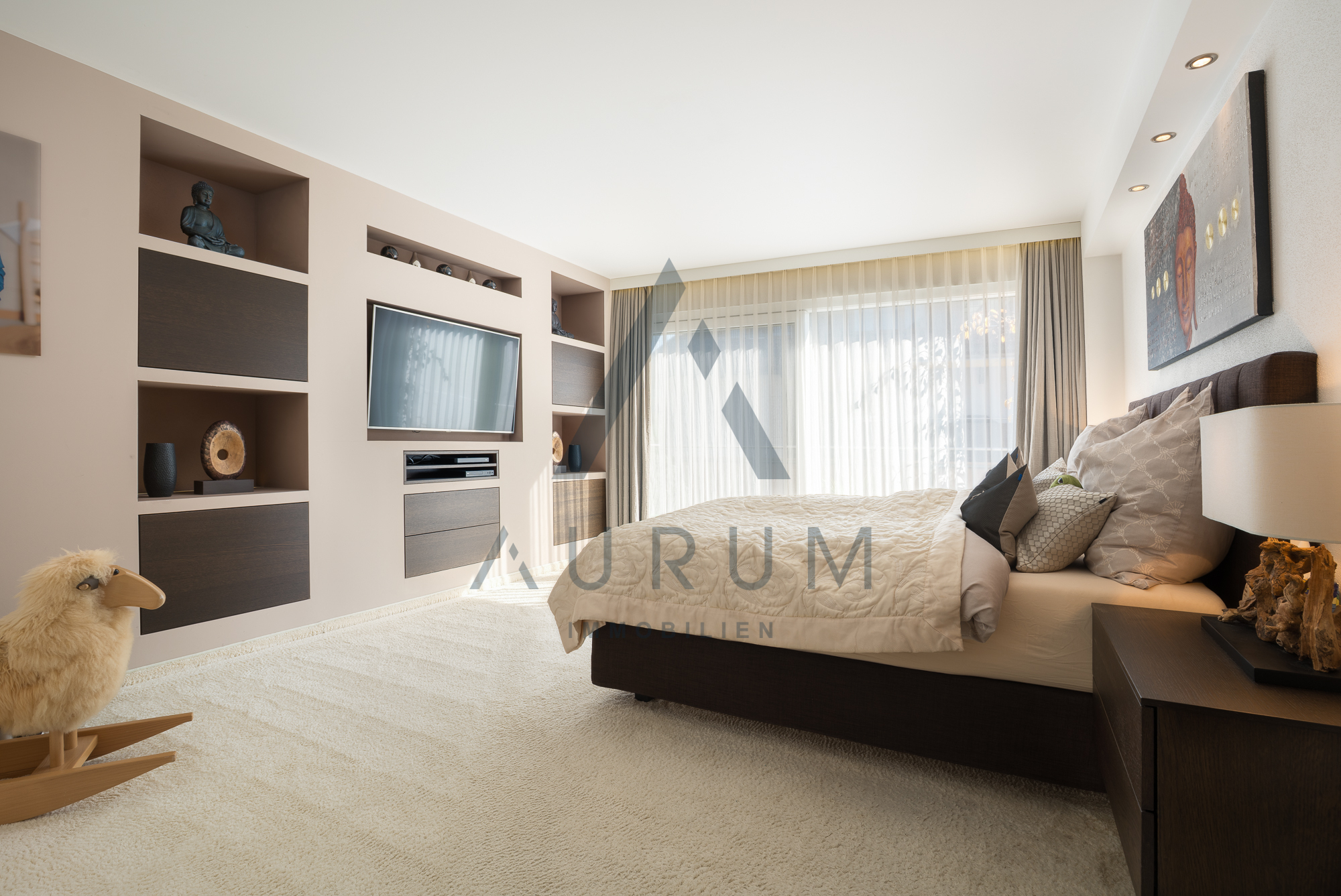 Die großräumige und lichtdurchflutete Wohnküche, ein Abstellraum / Speisekammer, sowie ein Büroraum (bzw. Möglichkeit eines dritten Schlafzimmers) und ein separates Gäste-WC befinden sich im Dachgeschoss. Die Raumhöhen, der offene Sichtdachstuhl, der Kamin sowie die edle Designerküche verleihen dem Obergeschoss ein besonderes Flair. Das absolute Highlight ist die umlaufende und uneinsichtige Dachterrasse mit Sitzecke, Lounge & Ruhebereich und Whirlpool.