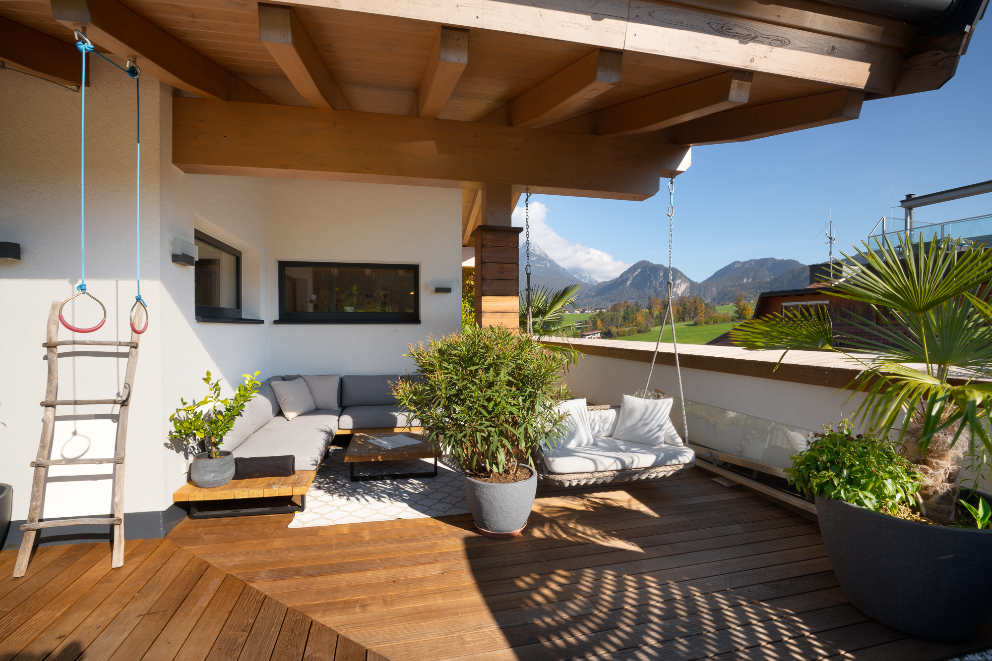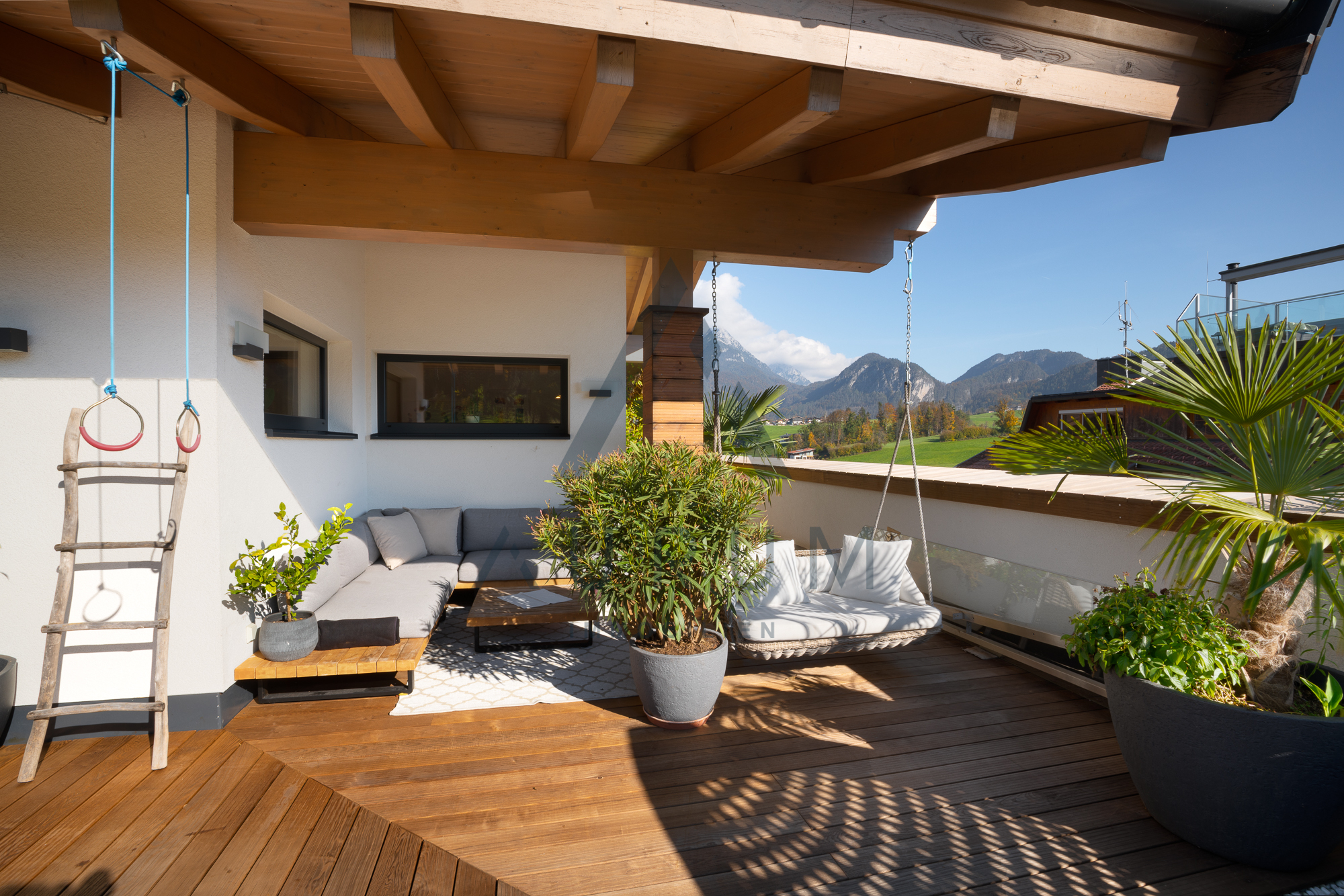 Neben dem spektakulären Blick auf die Bergwelt kann man hier aufgrund der Süd- und Westausrichtung zahlreiche Sonnenstunden genießen.