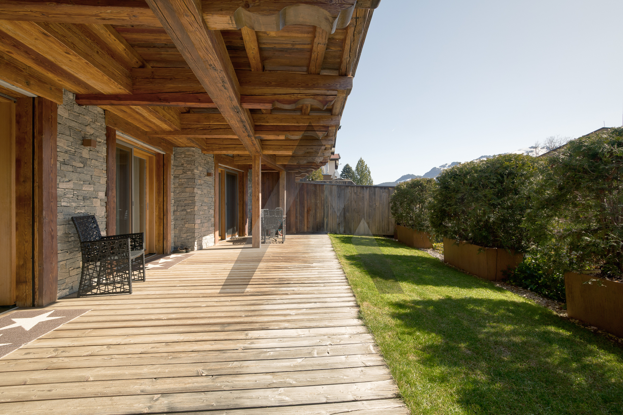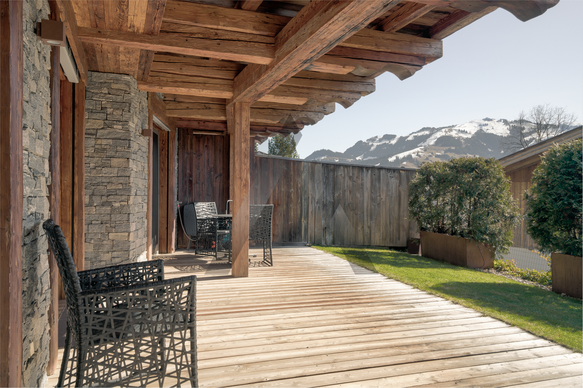 Die großzügige Sonnenterrasse mit traumhaften Blick in die Bergwelt ist teils überdacht.