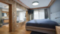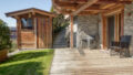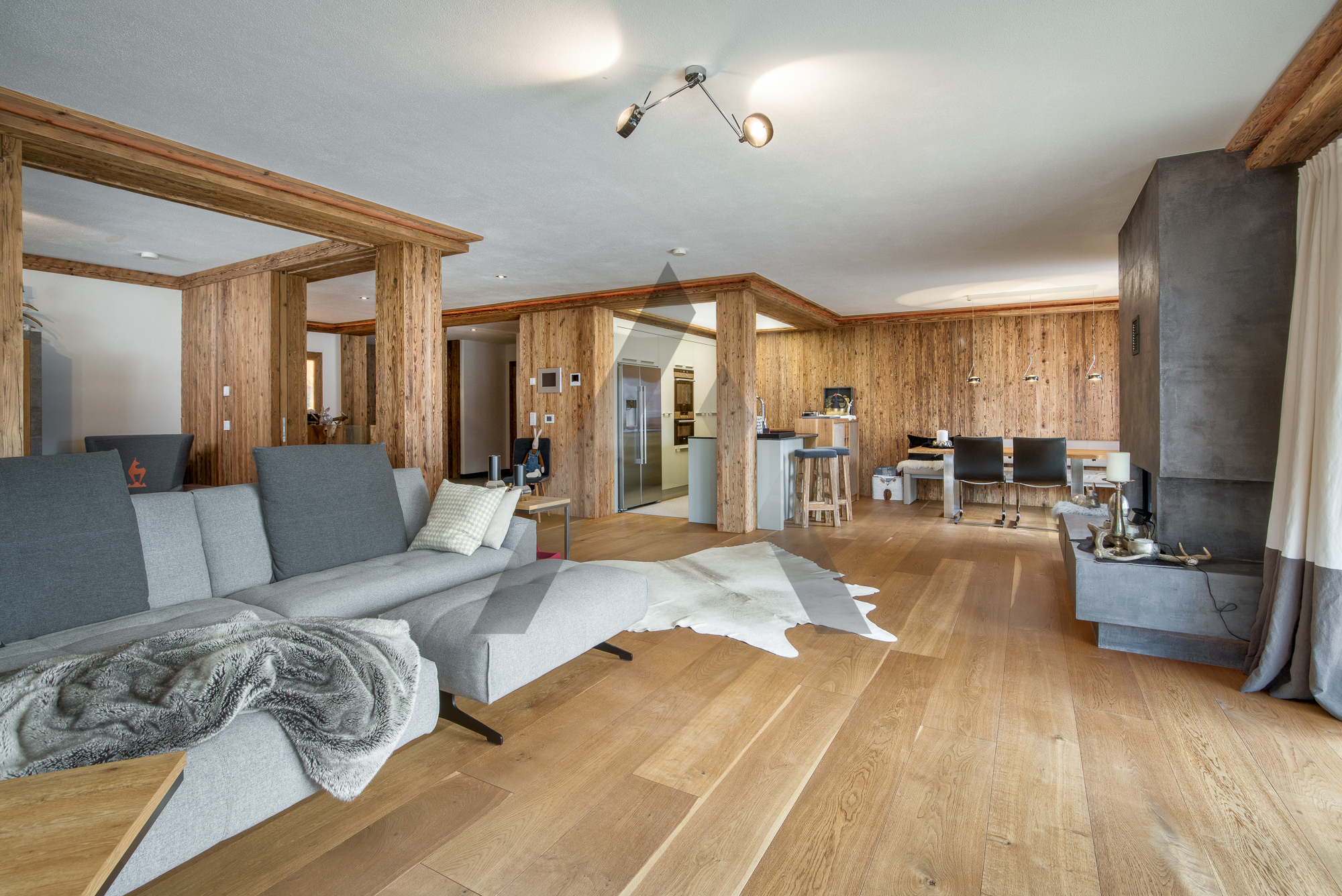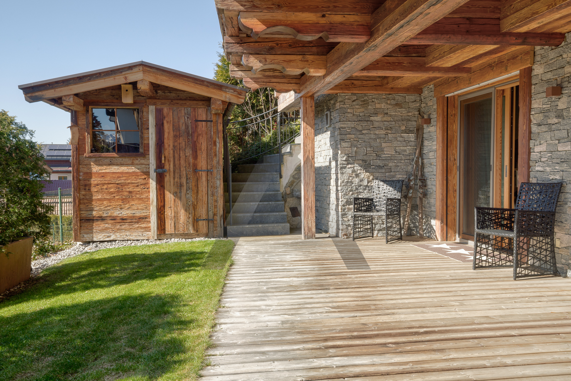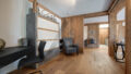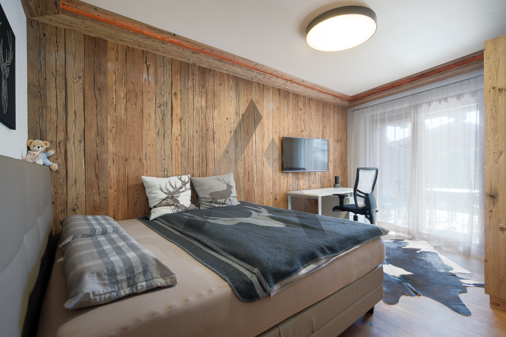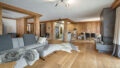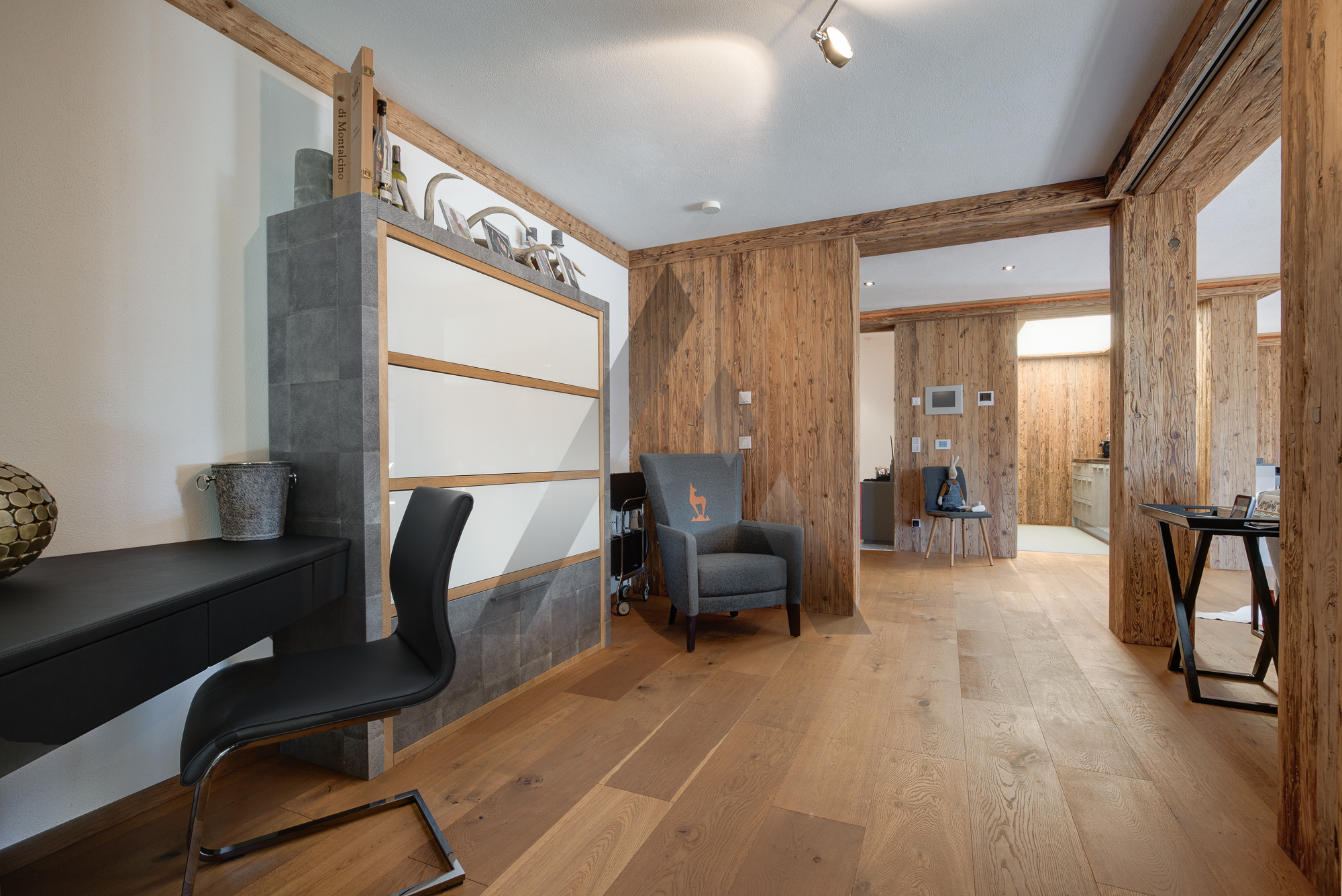 Der Wohnbereich ist hochwertig in Altholz mit indirekter Beleuchtung, Gaskamin nach Innen und Außen, und moderner Möblierung ausgestattet. Das optisch getrennte Zimmer kann mit Schiebeelementen in ein weiteres Schlafzimmer umgestaltet werden.