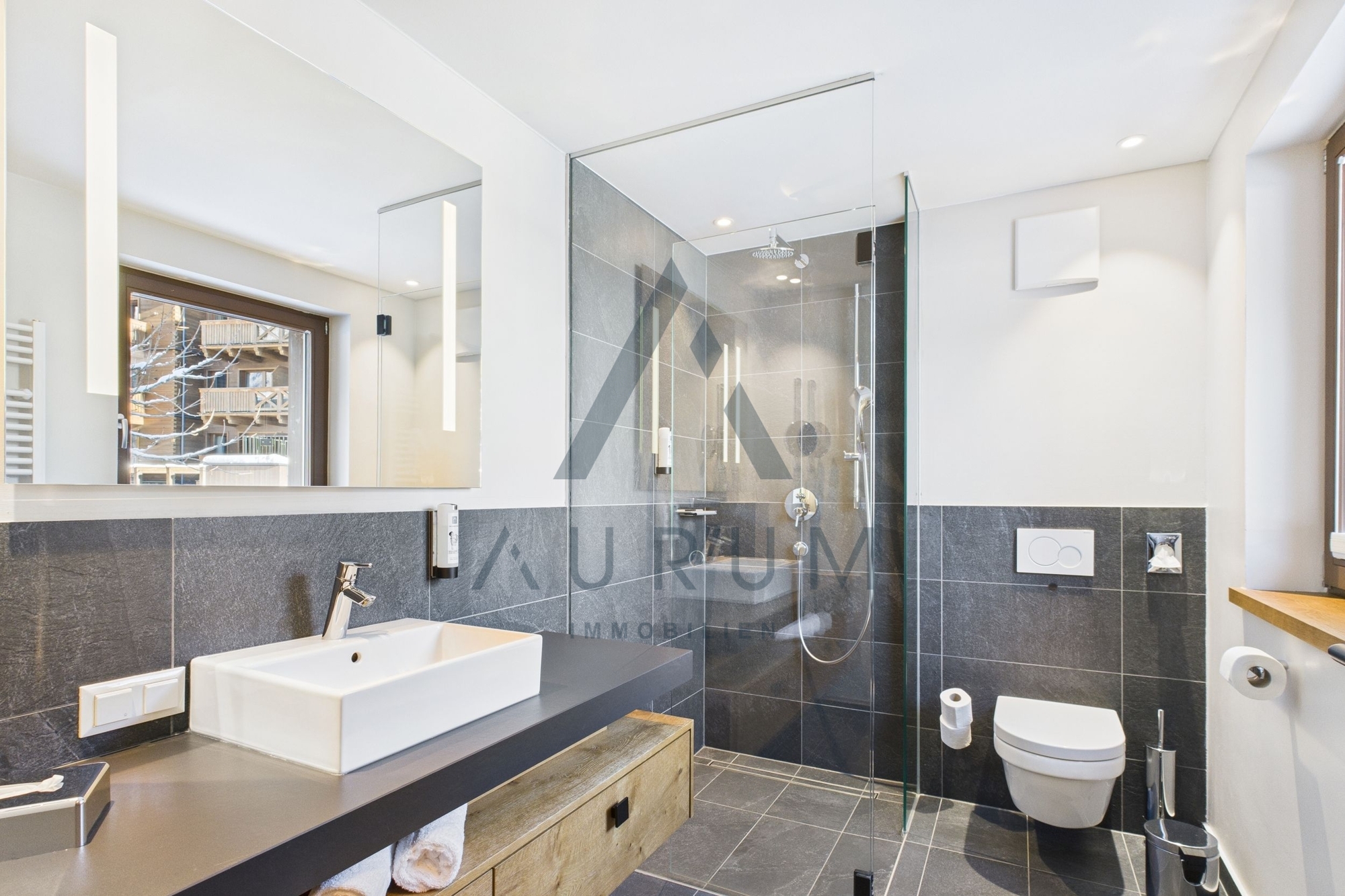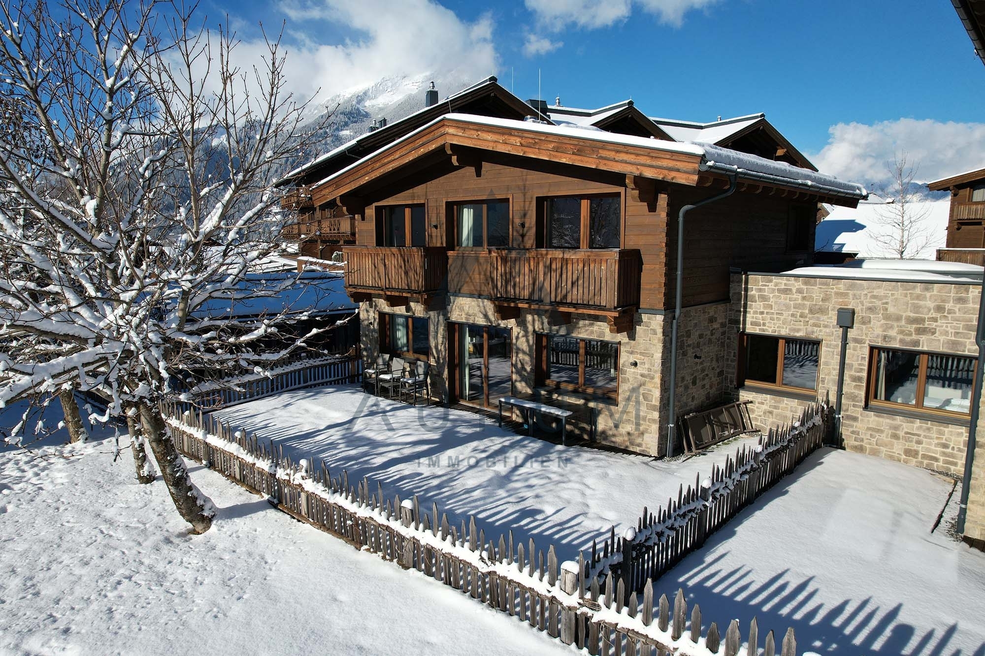 Das Obergeschoss verfügt über drei weitere Schlafzimmer, zwei davon mit Bad en suite, sowie zwei Balkone, die zusätzlichen Wohnkomfort bieten. Eichenparkett in den Wohnbereichen und Feinsteinzeug in den Bädern unterstreichen den alpinen Charakter der Immobilie. Drei Tiefgaragenstellplätze sind dem Chalet zugeordnet und nicht im Kaufpreis enthalten; der Kaufpreis für die Stellplätze beträgt € 52.000,– (netto).