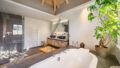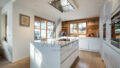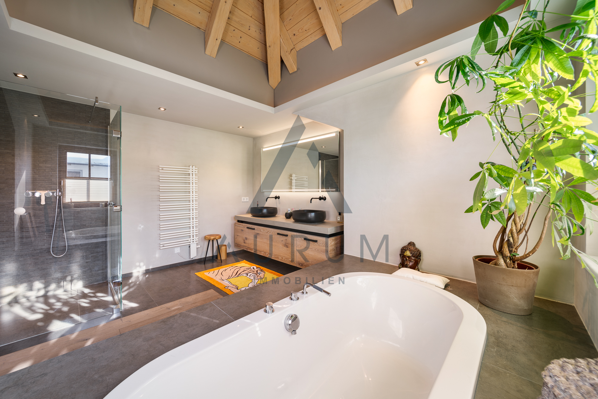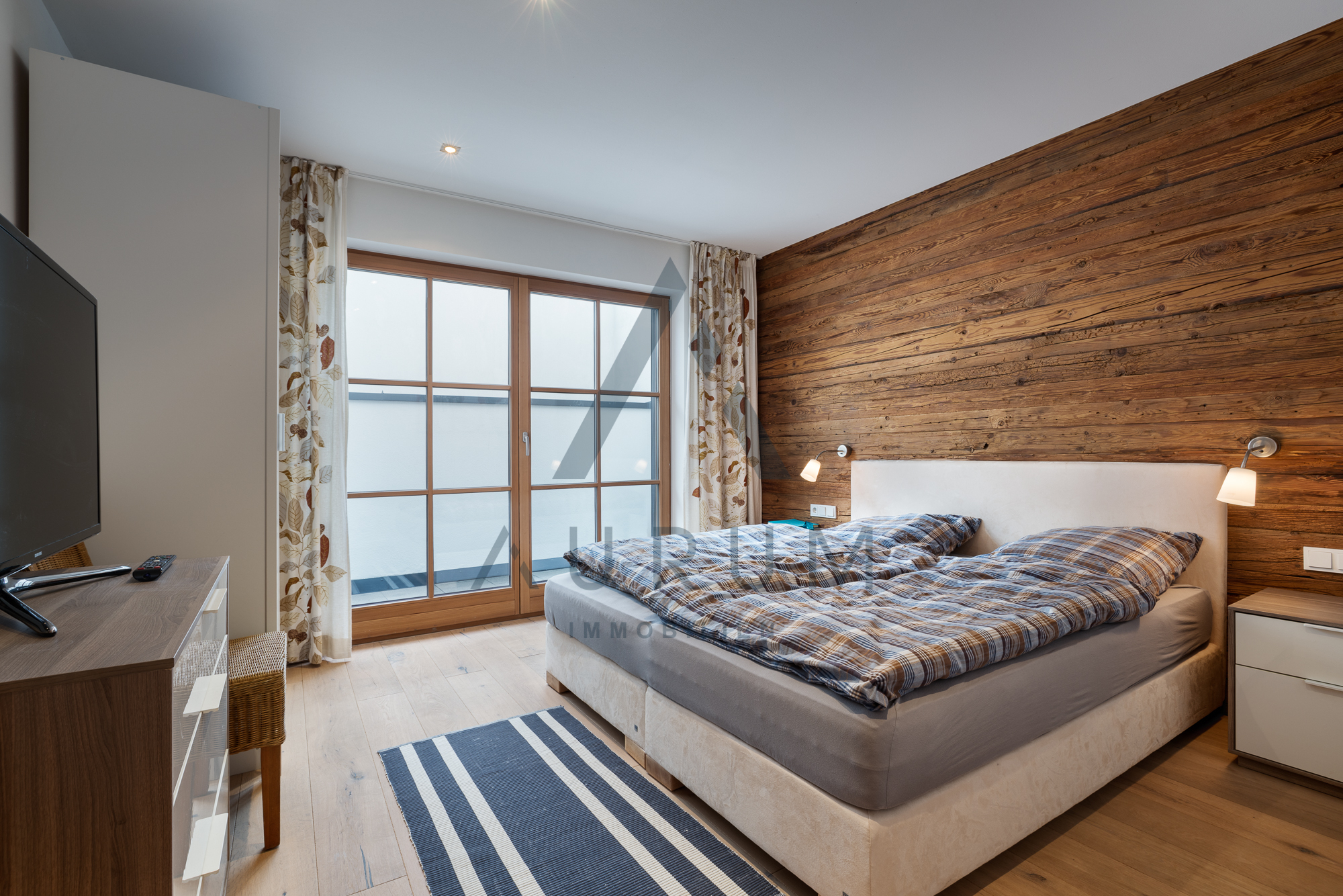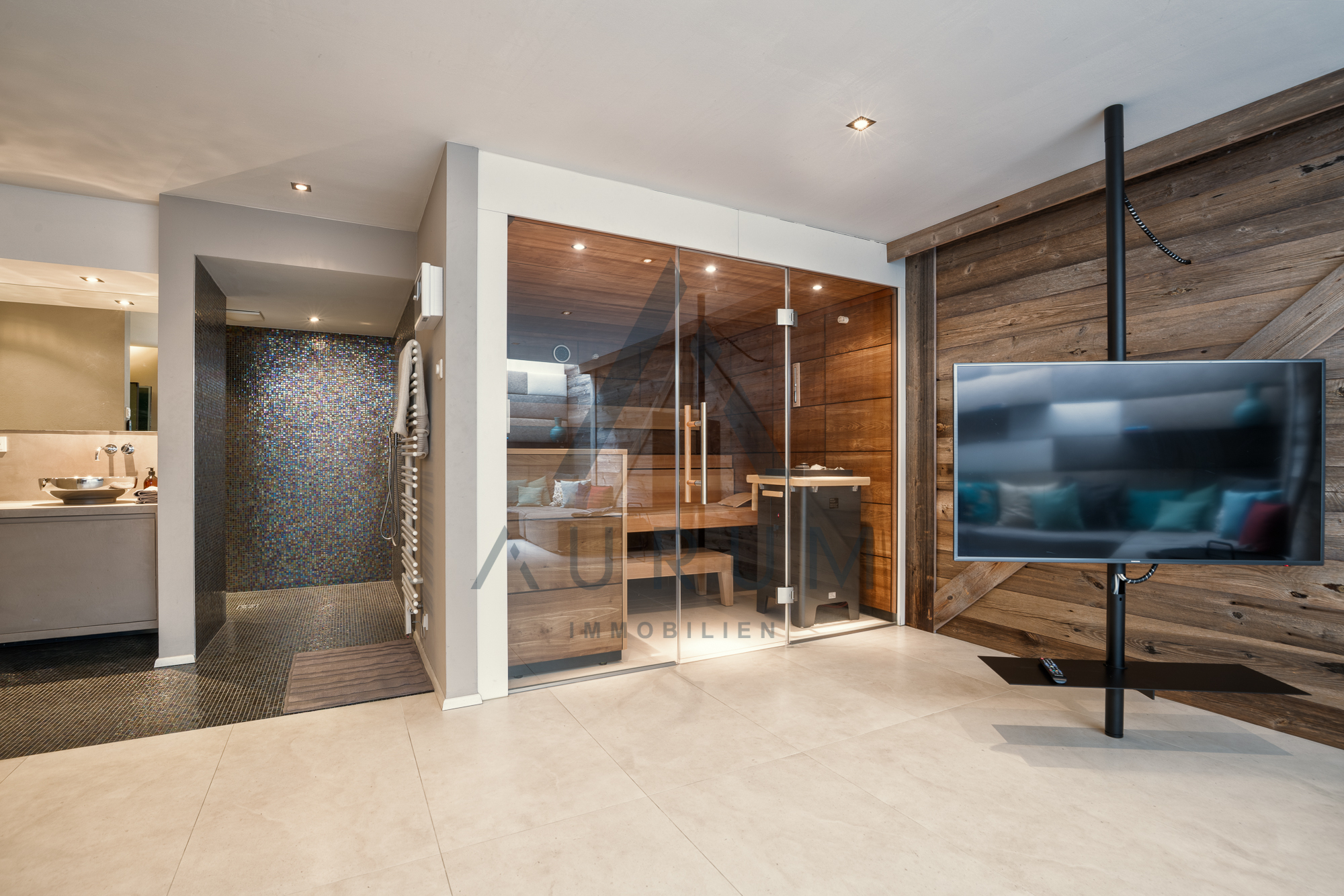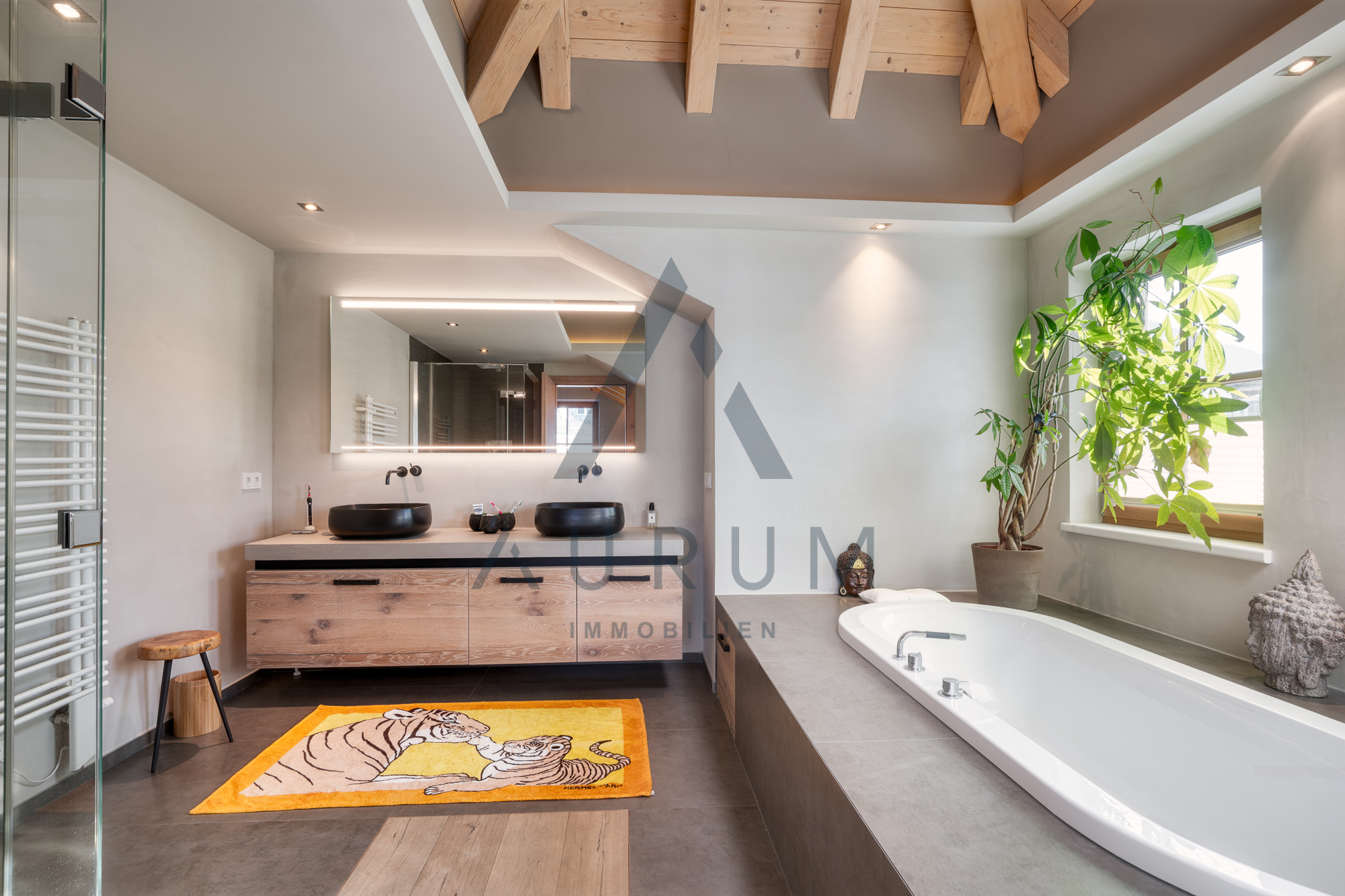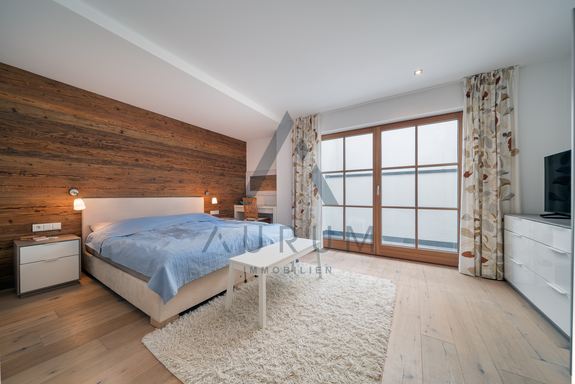Die mehrgeschossige Raumstruktur bietet fünf Schlafzimmer, zwei Badezimmer, zwei separate WCs und einen luxuriösen Wellnessbereich. Charaktervolle Materialien wie Altholz, Naturstein und großzügige Verglasungen prägen die Architektur und sorgen für ein stimmiges Zusammenspiel.