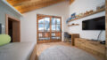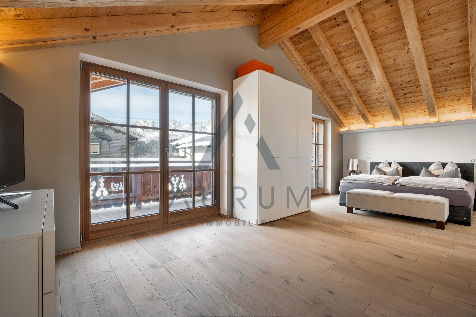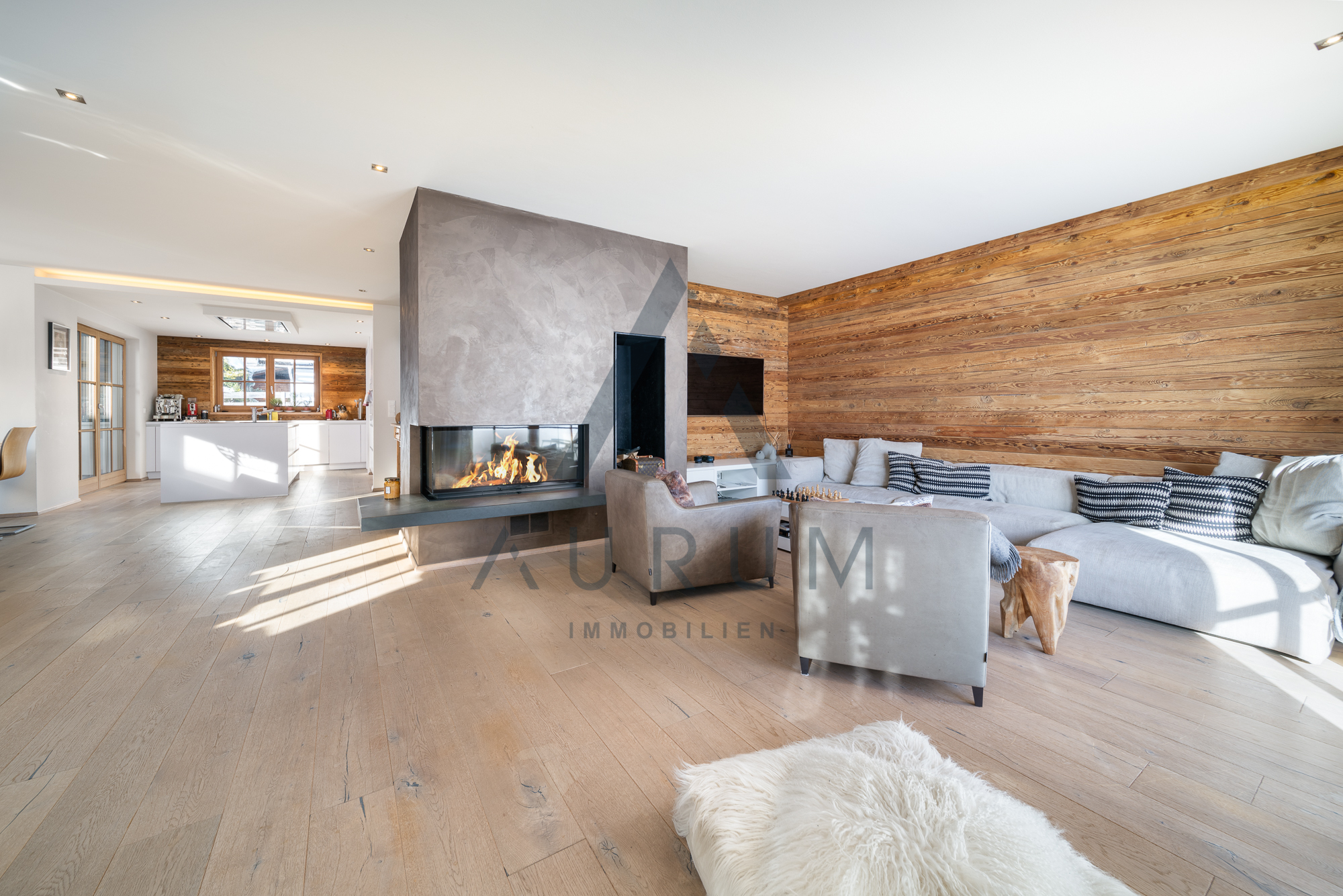 Im Erdgeschoss befindet sich ein großzügig gestalteter Wohn- und Essbereich mit offen integrierter, voll ausgestatteter Küche. Von hier aus gelangt man unmittelbar zum überdachten Freisitz mit Grill und großem Esstisch. Der Wohnbereich bietet einen offenen Kamin und liebevolle Altholzdetails. Direkt anschließend öffnet sich die sonnige Terrasse mit atemberaubendem Panoramablick über die umliegende Berglandschaft, inklusive Blick auf das Kitzbüheler Horn.