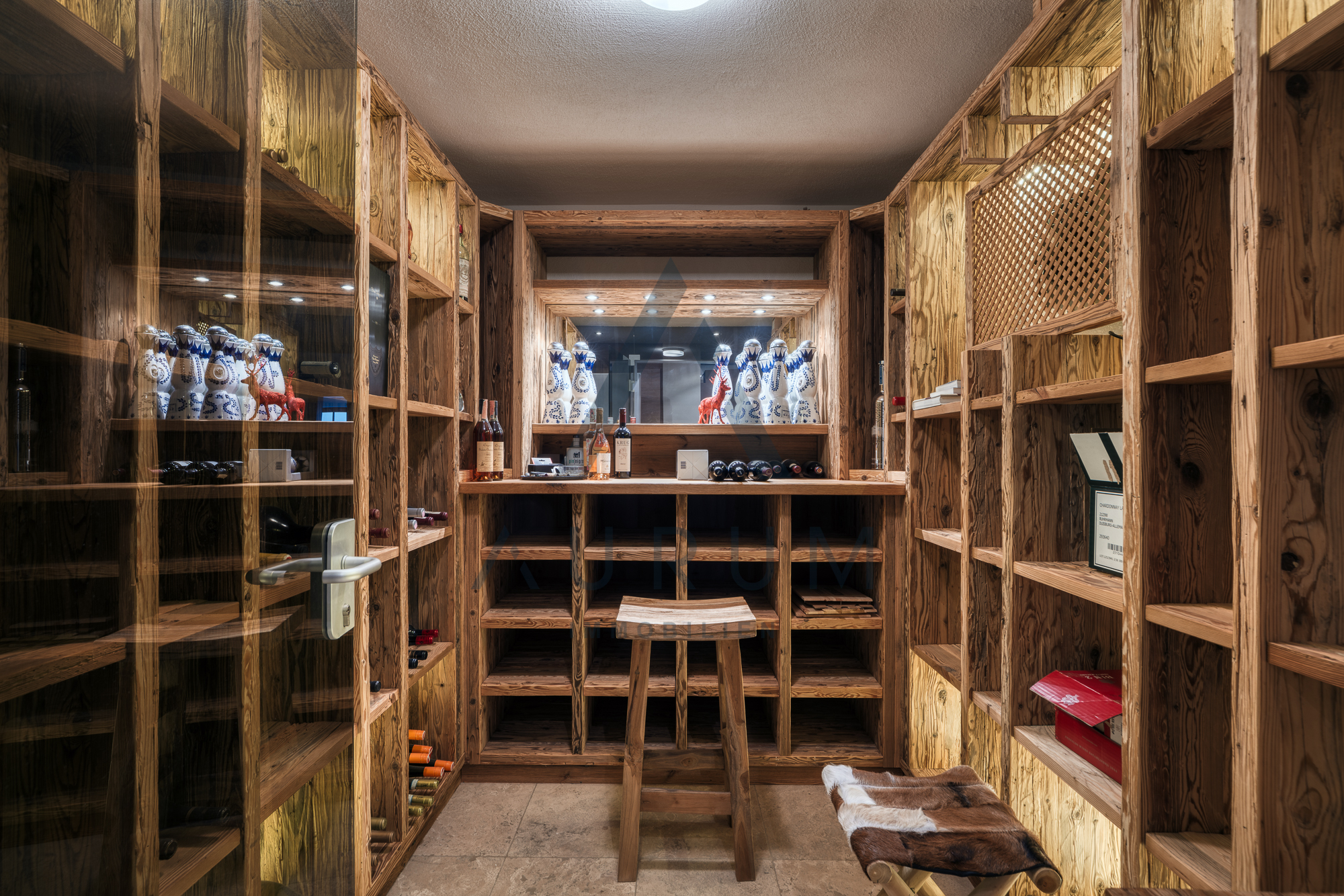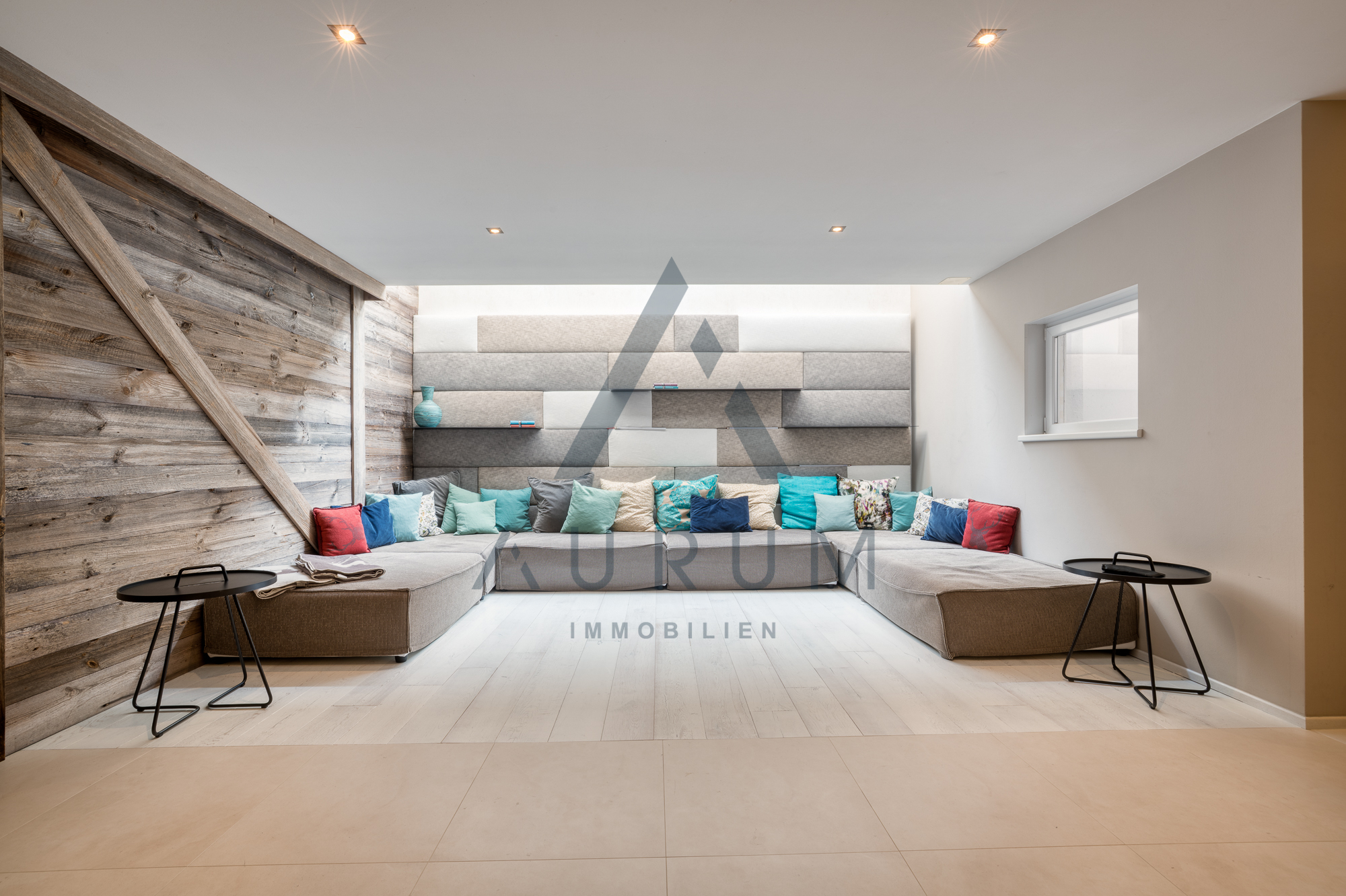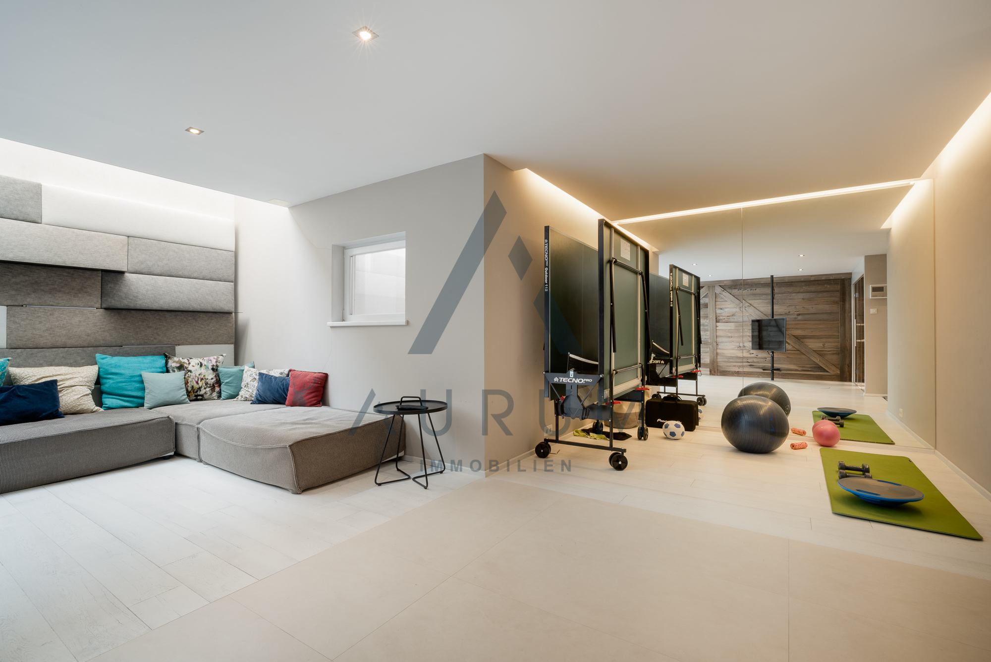 Das Untergeschoss beherbergt einen geschmackvoll gestalteten Weinkeller sowie eine private Spa-Oase mit Sauna, Relax-Day-Bed und großzügiger Regendusche. Ergänzt wird diese Ebene durch zwei weitere Schlafzimmer und ein separates Bad, die komfortable Rückzugsmöglichkeiten für Familie oder Besucher bieten.