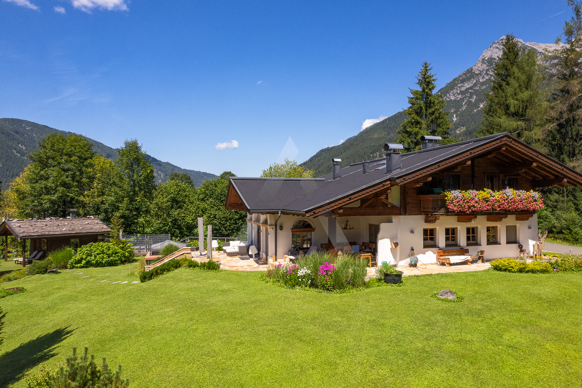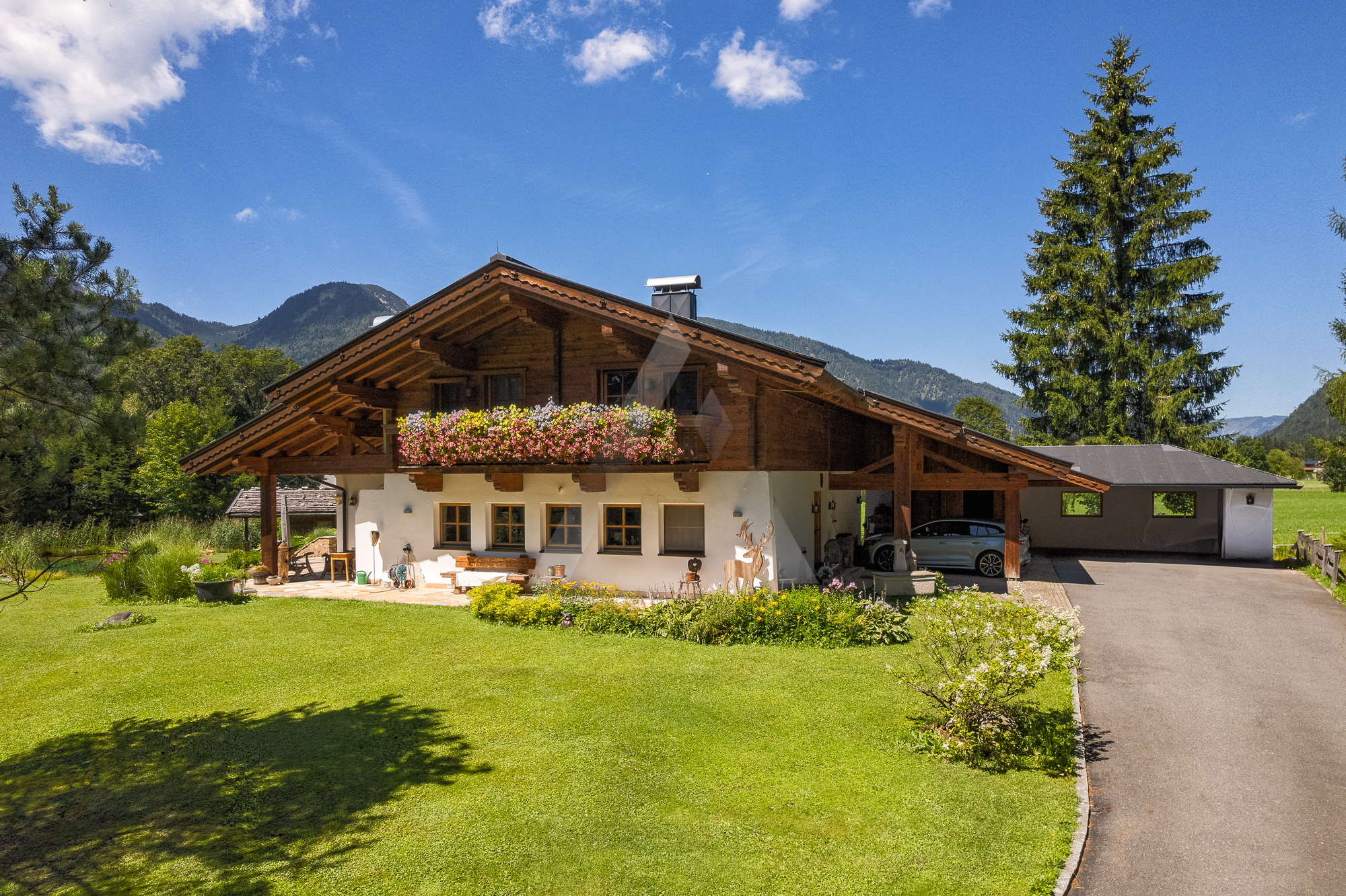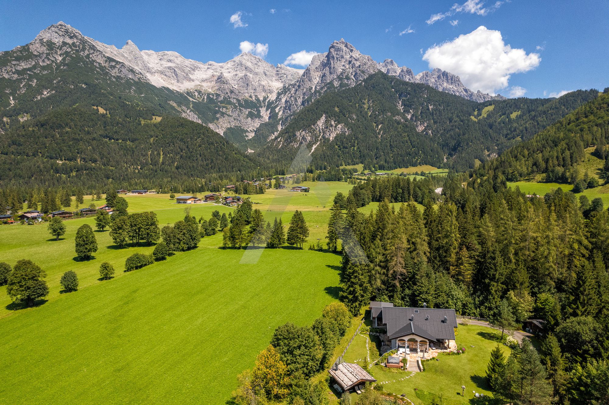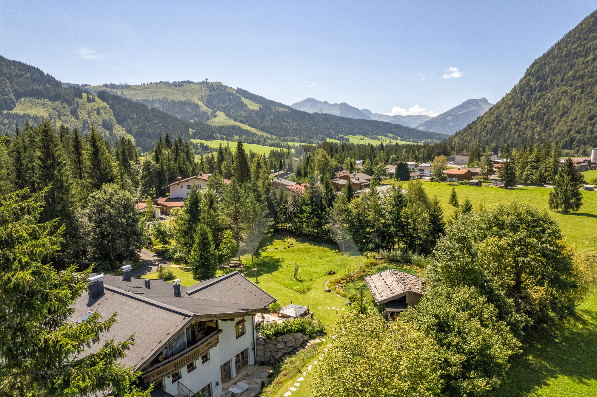 In absoluter Naturlage umgeben von Wiesen und Wäldern befindet sich diese Liegenschaft auf einem ca. 3.620 m² großen Grundstück. Der Blick reicht von der Buchensteinwand über den Hochgründberg bis zum Massiv der Loferer Steinberge.