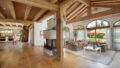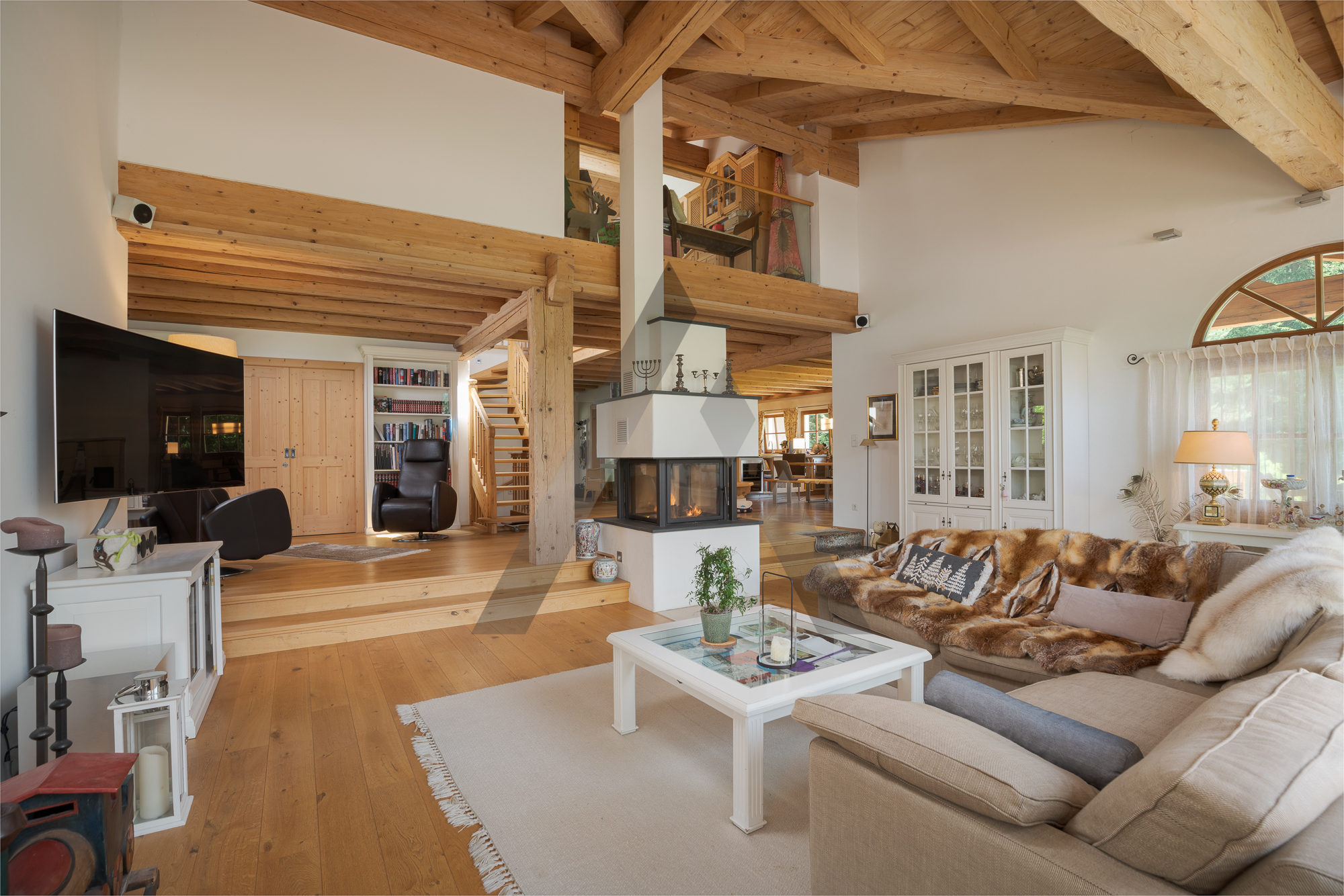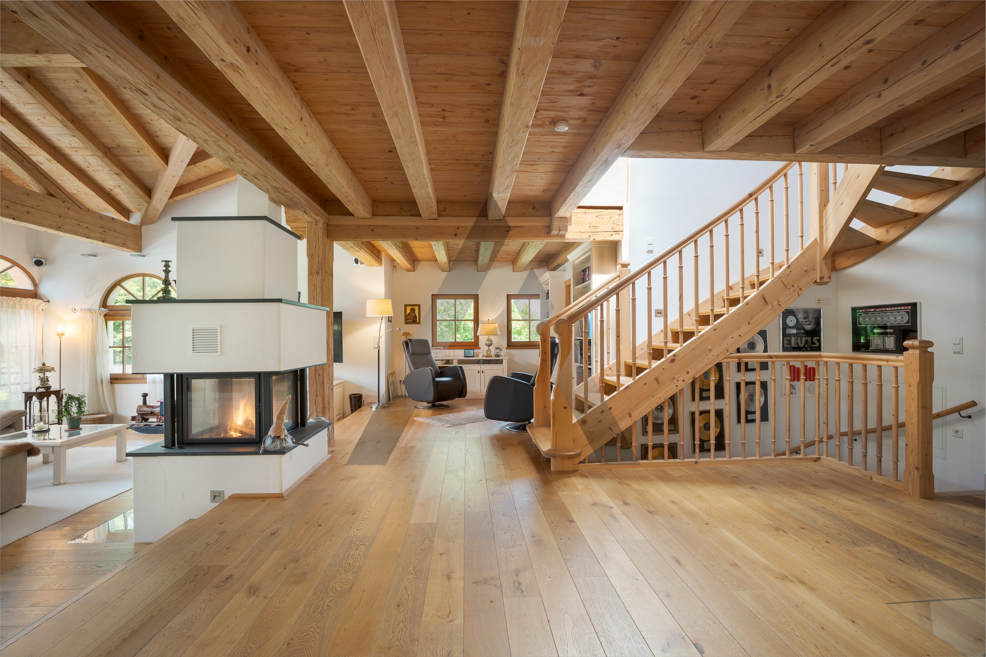 Das Haupthaus erstreckt sich über drei Etagen. Im Erdgeschoss befindet sich der Küchen-Essbereich mit großer Tafel, Kachelofen und direkten Zugang in den Garten mit großzügigem Freisitz, welcher mit einem gemauerten Außengrill sowie einer Heizung ausgestattet ist. Angrenzend befindet sich der Wohnbereich mit offenen Kamin, Sichtdachstuhl, großen Fensterfronten und wiederum direkten Zugang auf die Südterrasse und zum Pool. Auf dieser Ebene befinden sich ebenfalls ein Büro mit ensuite Badezimmer, welches auch als Gästezimmer genutzt werden kann, sowie ein großzügiger Eingangsbereich mit Garderobe.