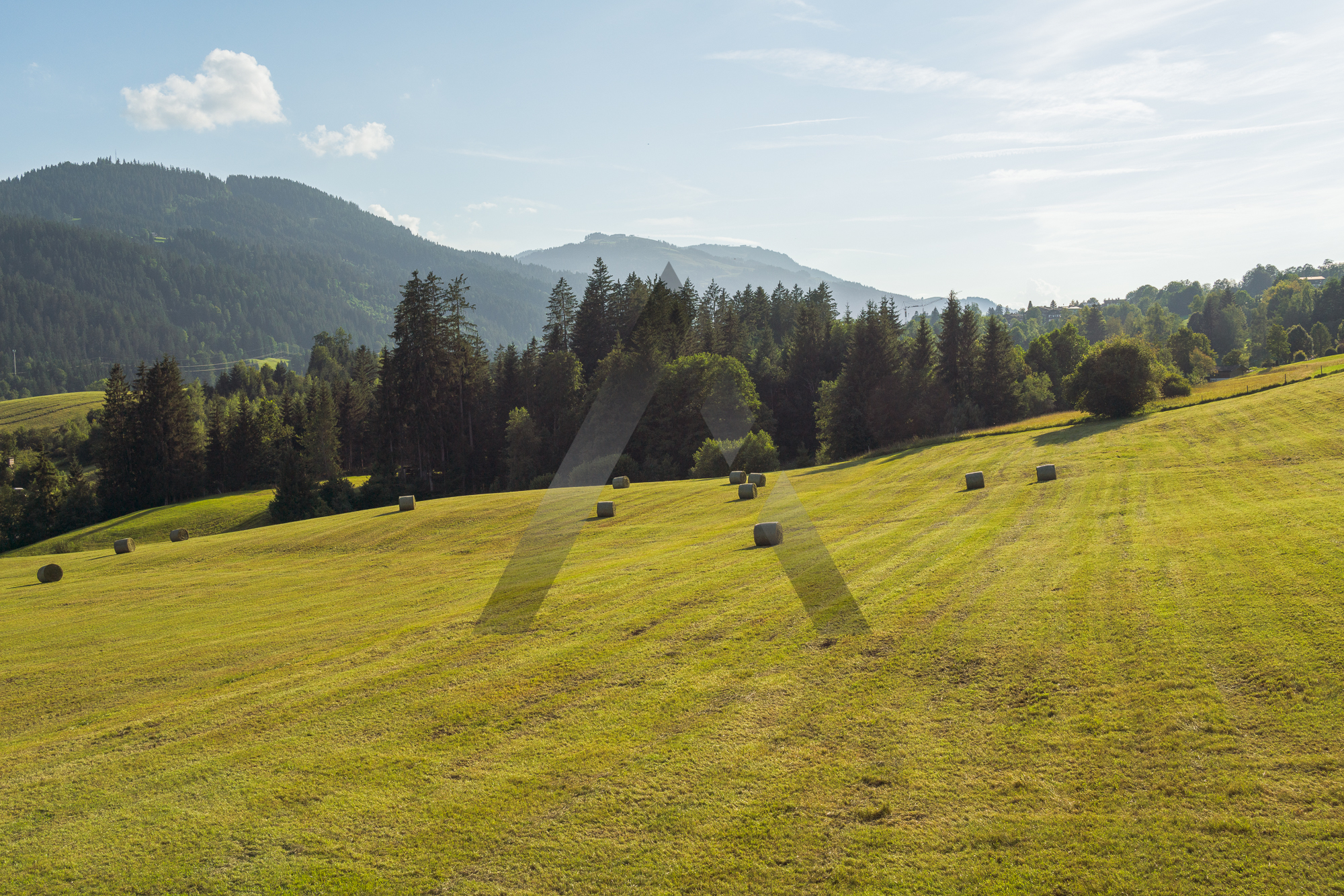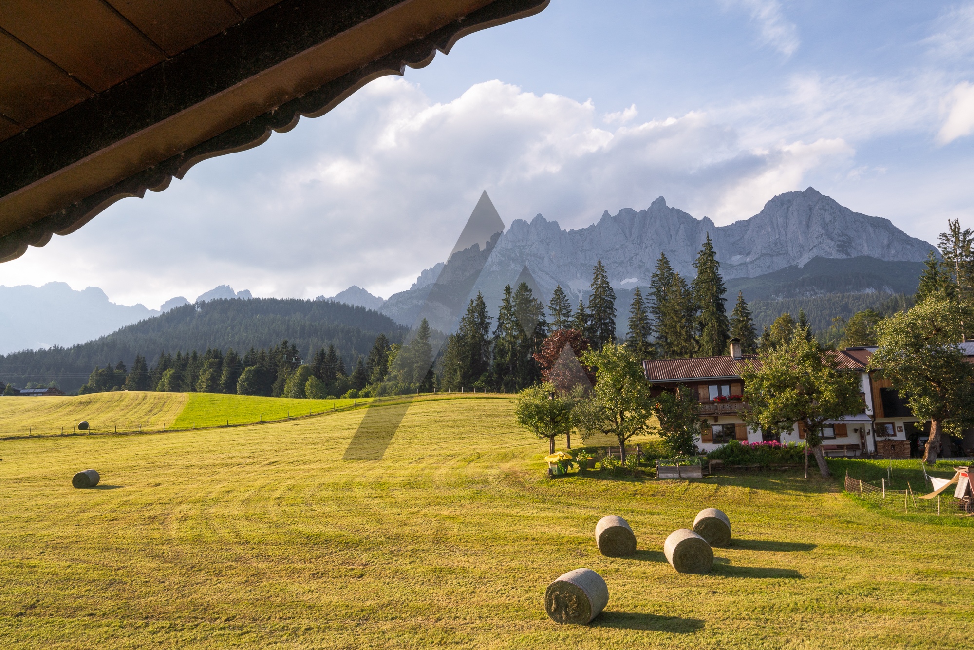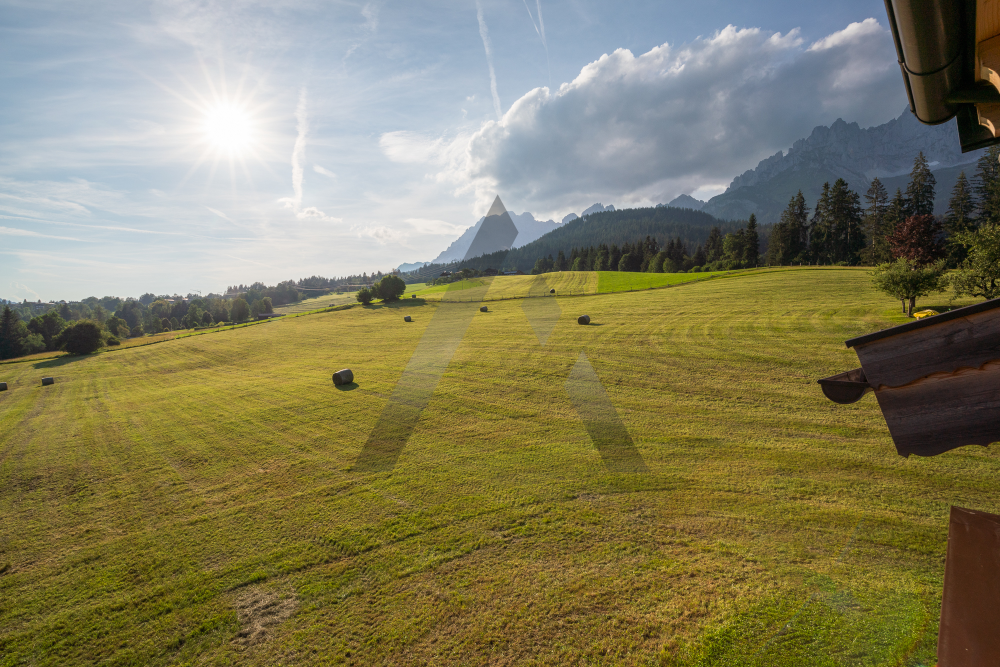 Das Haus ist umgeben von Wiesen in alle Himmelsrichtungen. Der Blick zum Wilden Kaiser, auf das Kitzbüheler Horn und auf die umliegende Bergwelt ist atemberaubend.