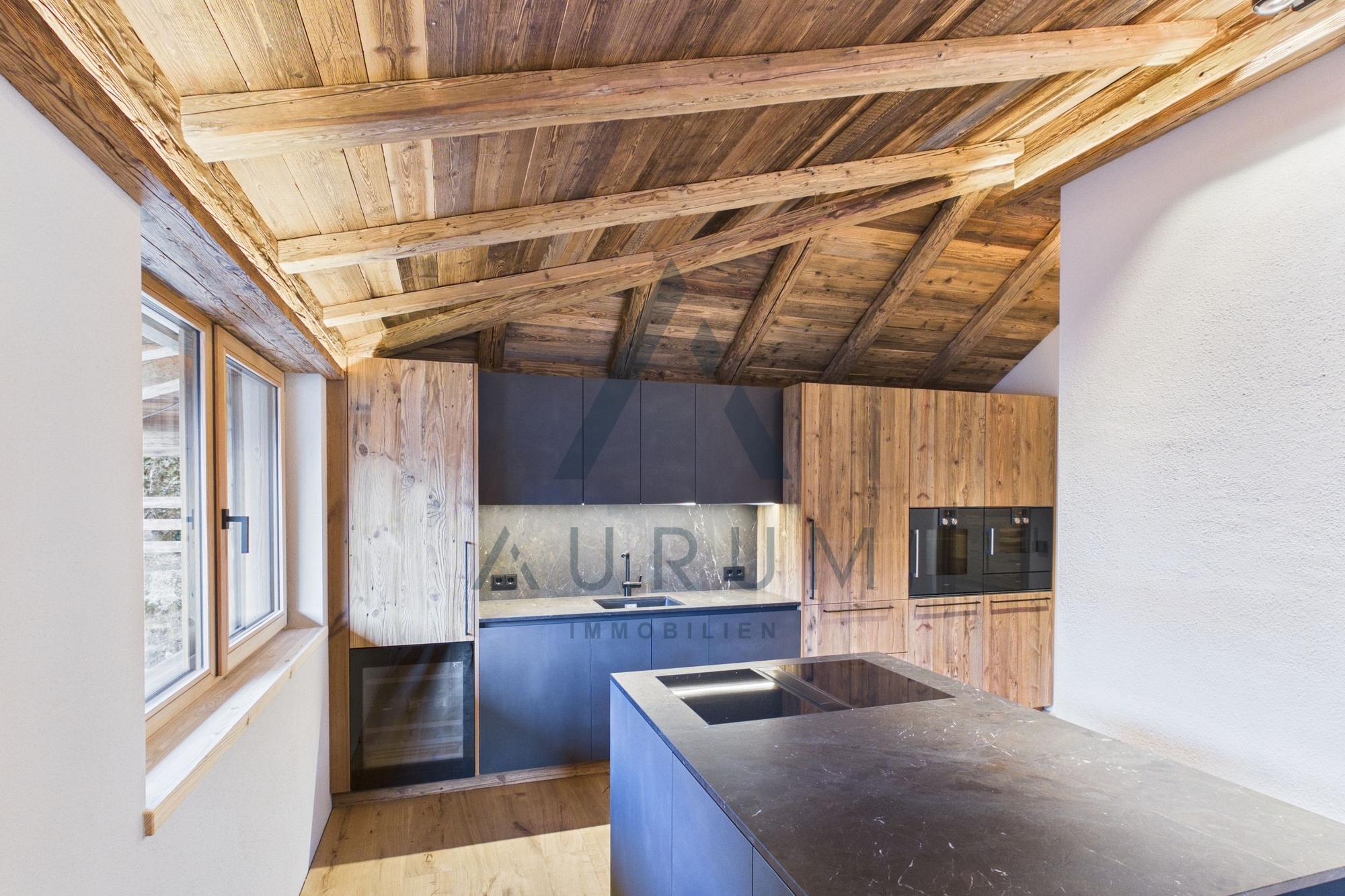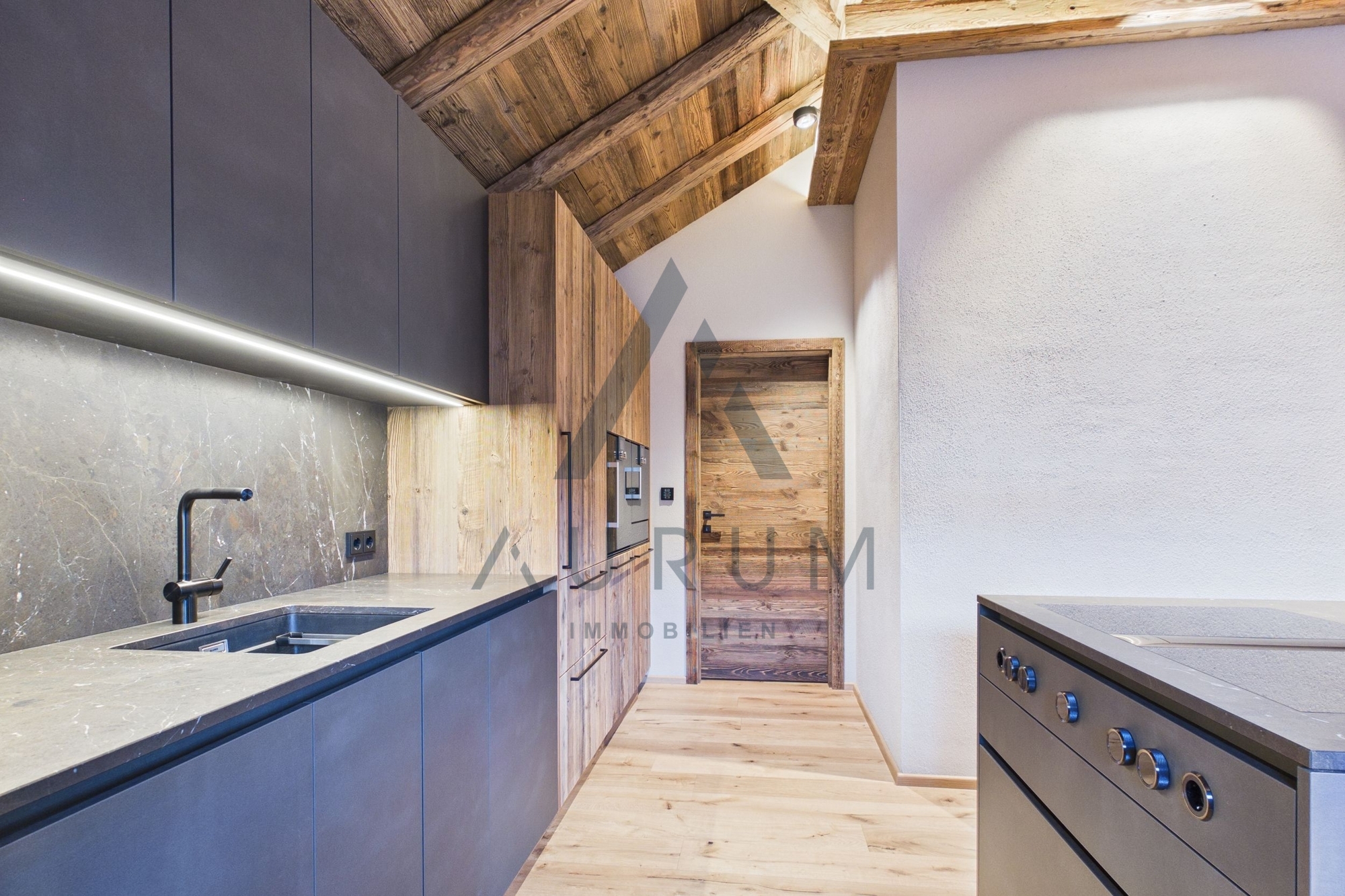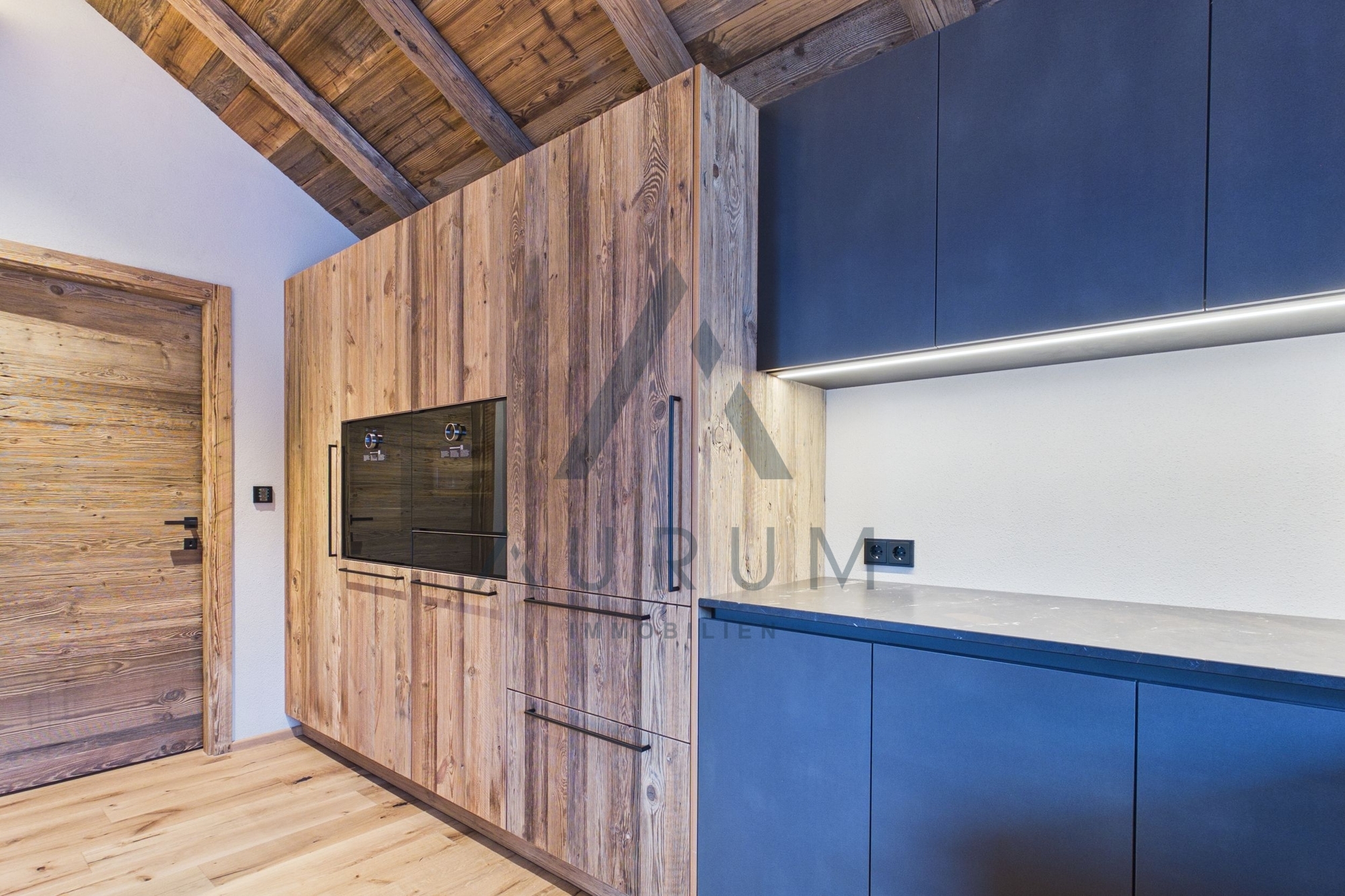 Bei der Ausstattung wird größter Wert auf qualitative Hochwertigkeit gelegt und ausschließlich Materialien, wie Altholz, Naturstein, Vollholztüren in Altholz, edle Armaturen und Fließen verwendet sowie ein BUS-System, elektrische Raffstores und ein Beleuchtungskonzept von Occhio verbaut.
