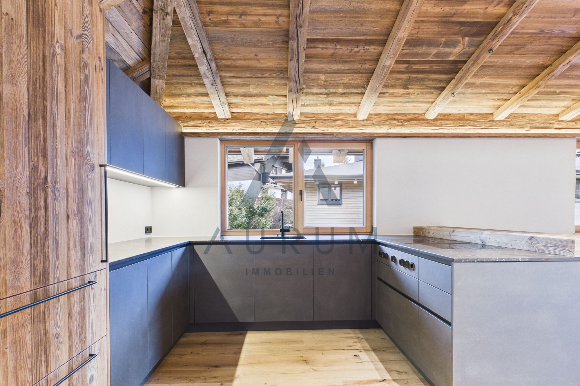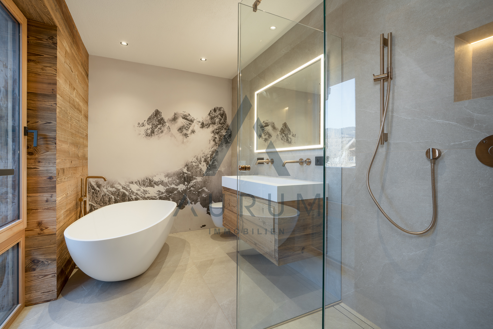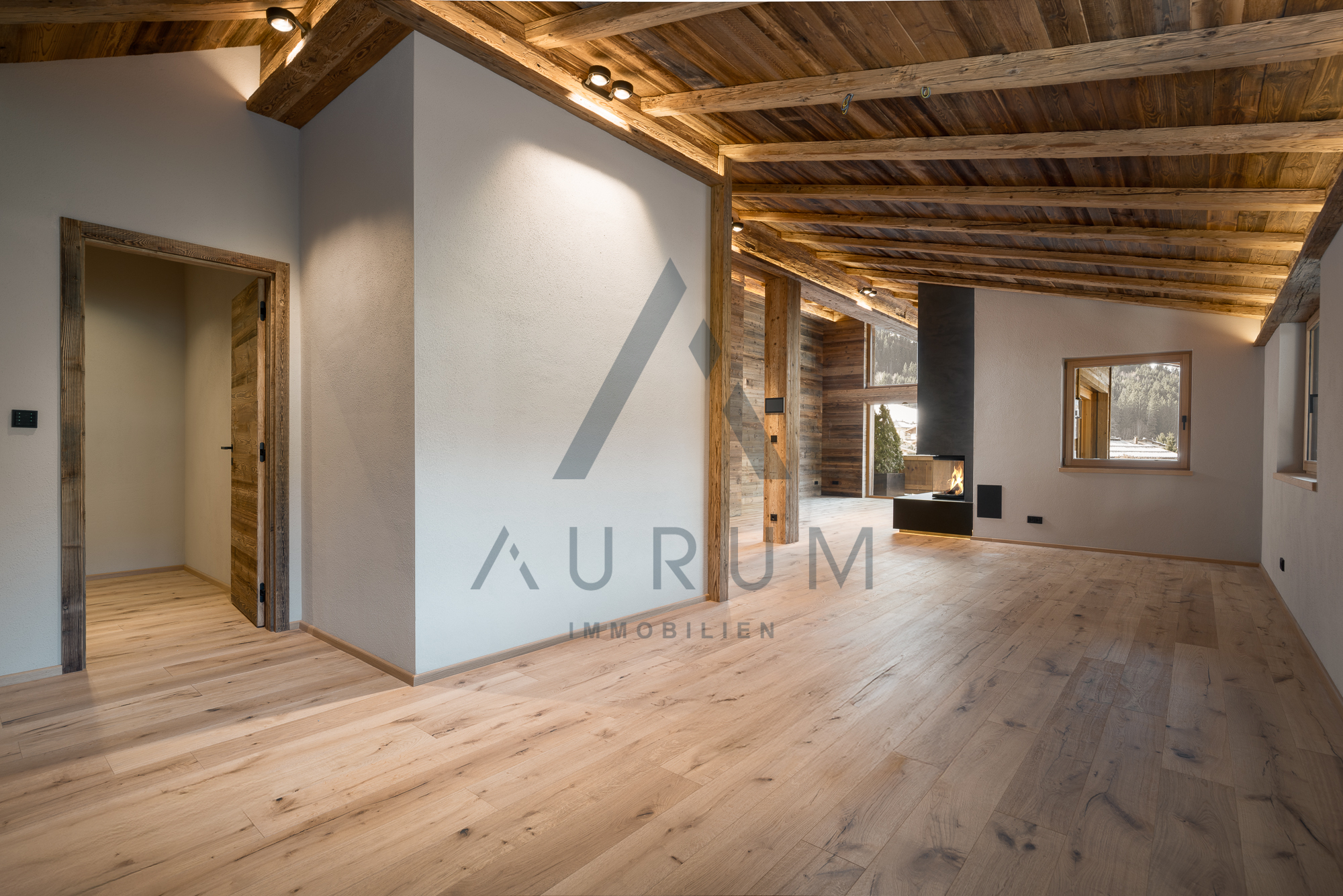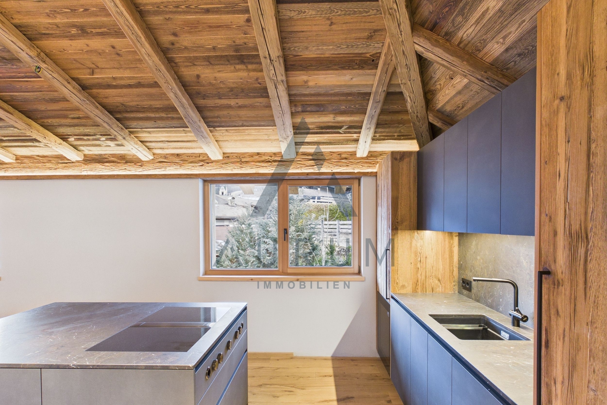 Bei der Ausstattung wird größter Wert auf qualitative Hochwertigkeit gelegt und ausschließlich Materialien, wie Altholz, Naturstein, Vollholztüren in Altholz, edle Armaturen und Fließen verwendet sowie ein BUS-System, elektrische Raffstores und ein Beleuchtungskonzept von Occhio verbaut.