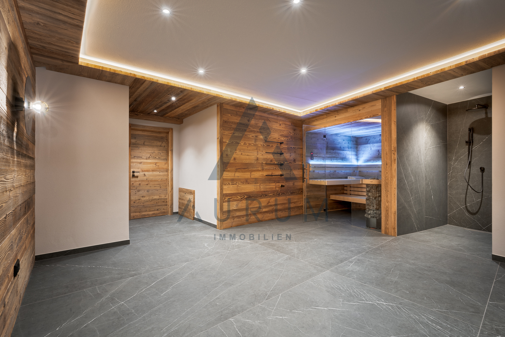 Den privaten Wellnessbereich des Penthouses, der sich im Untergeschoss der Liegenschaft befindet, erreicht man direkt mit dem privaten Lift oder über die repräsentative Treppe. Dieser Bereich ist mit einer Altholzsauna, Wellnessdusche, überdimensionalen, freistehenden Badewanne, Ruhezone und Gästetoilette ausgestattet. Im Untergeschoss befindet sich zudem der groß bemessene Lagerraum dieser Wohnung.