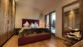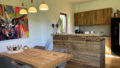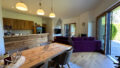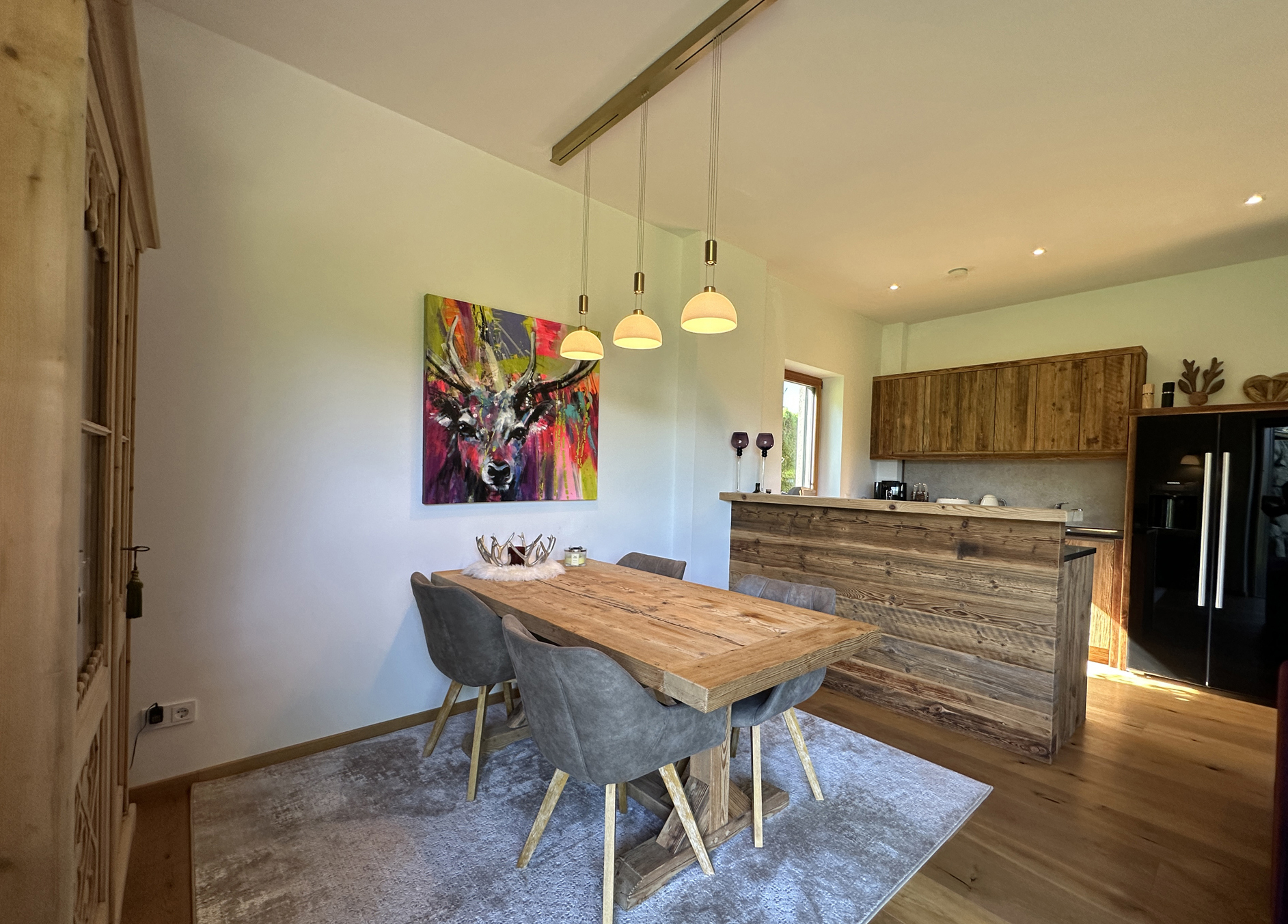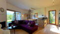 Die Wohnung bietet einen offen gestalteten Wohn-/Ess-/Kochbereich mit Altholzküche, Kamin und Zugang zur Terrasse mit großzügigem Gartenbereich, zwei Schlafzimmer, ein Badezimmer und ein separates WC. Beide Schlafzimmer verfügen über einen Terrassenzugang.