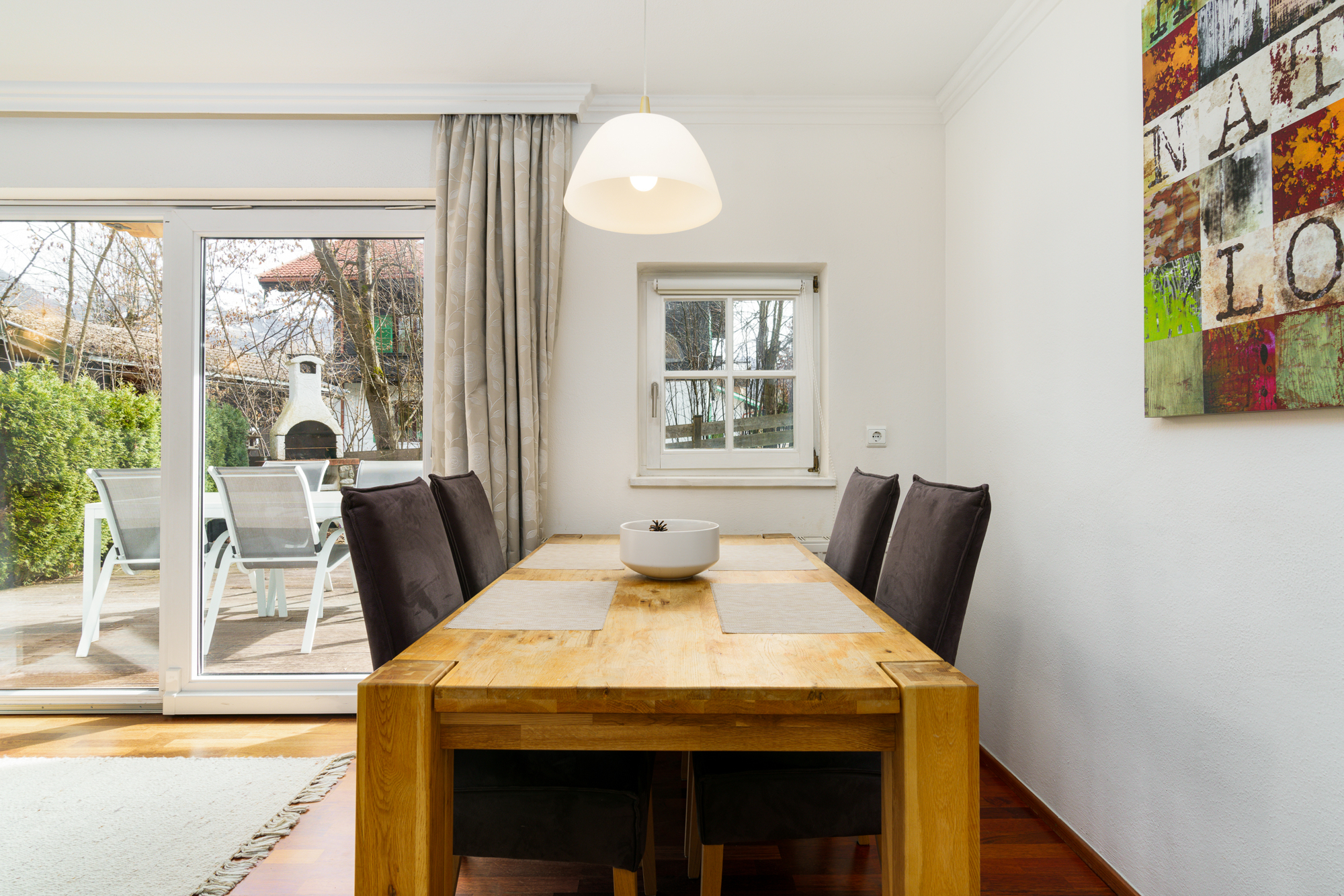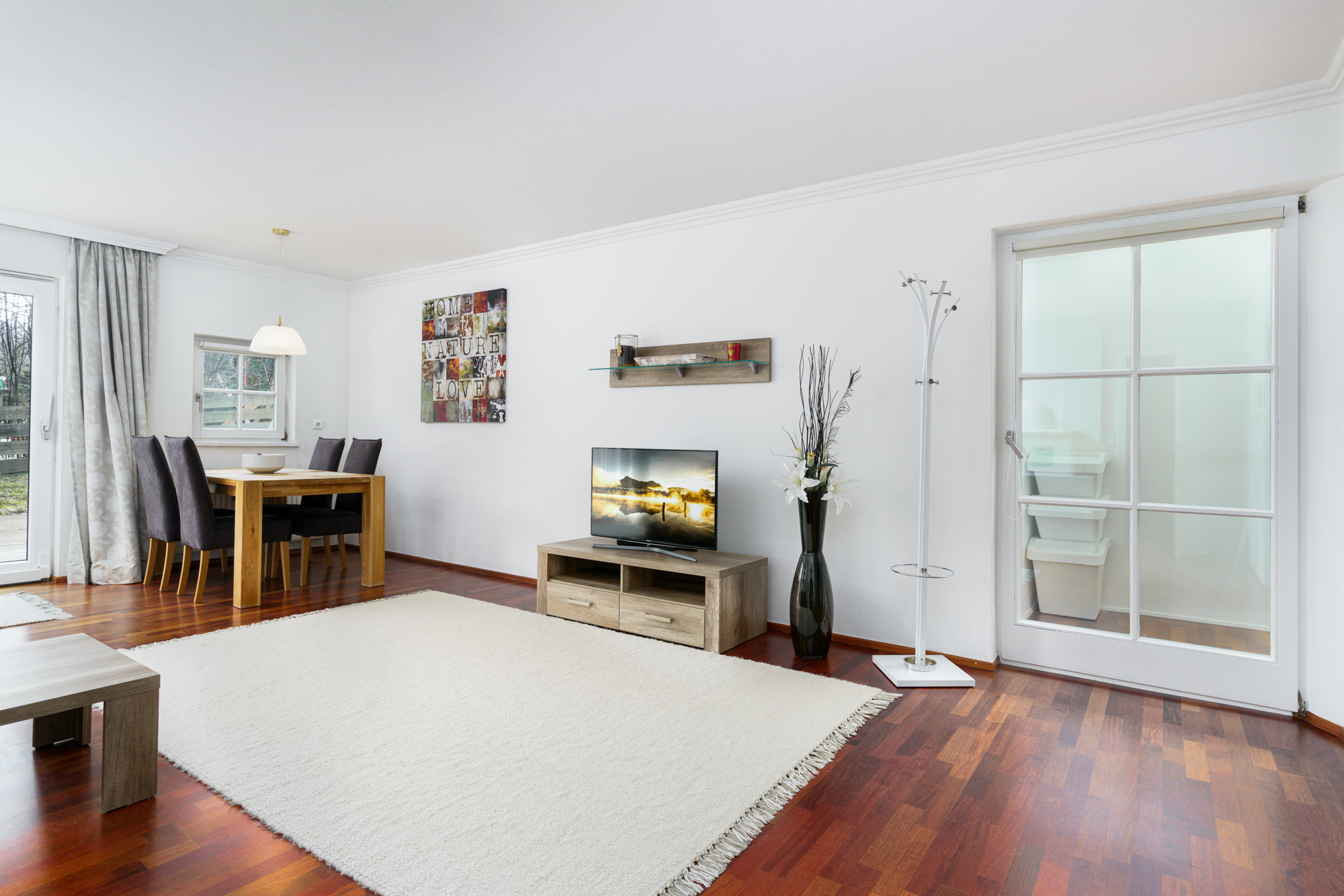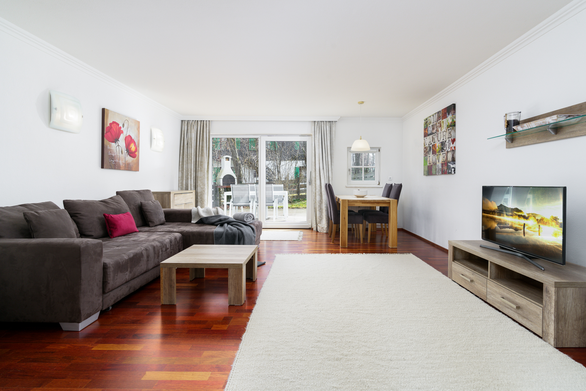 Die Gartenwohnung gliedert sich in einen offen gestalteten Wohn-/ Essbereich mit Einbauküche, Kachelofen, und Zugang zur Terrasse, sowie zwei Schlafzimmer, ein Badezimmer und einen Abstellraum.
