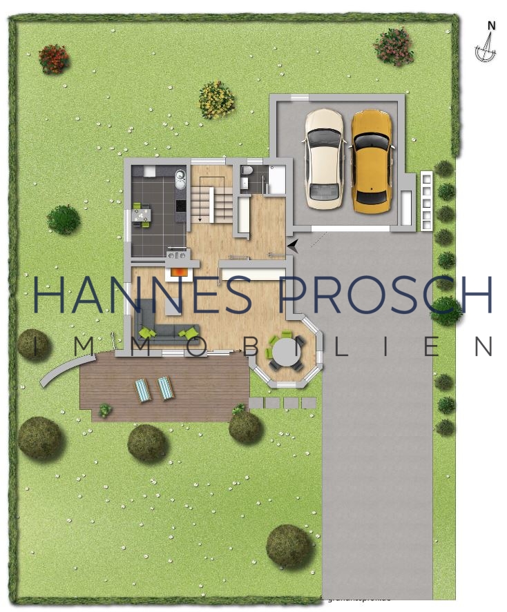 Derzeit ist es mit einem Kellergeschoss, einem Erdgeschoss und Obergeschoss bebaut. Auf der Ostseite befindet sich noch eine Doppelgarage die über die Südseitige Zufahrt erreichbar ist. 318798