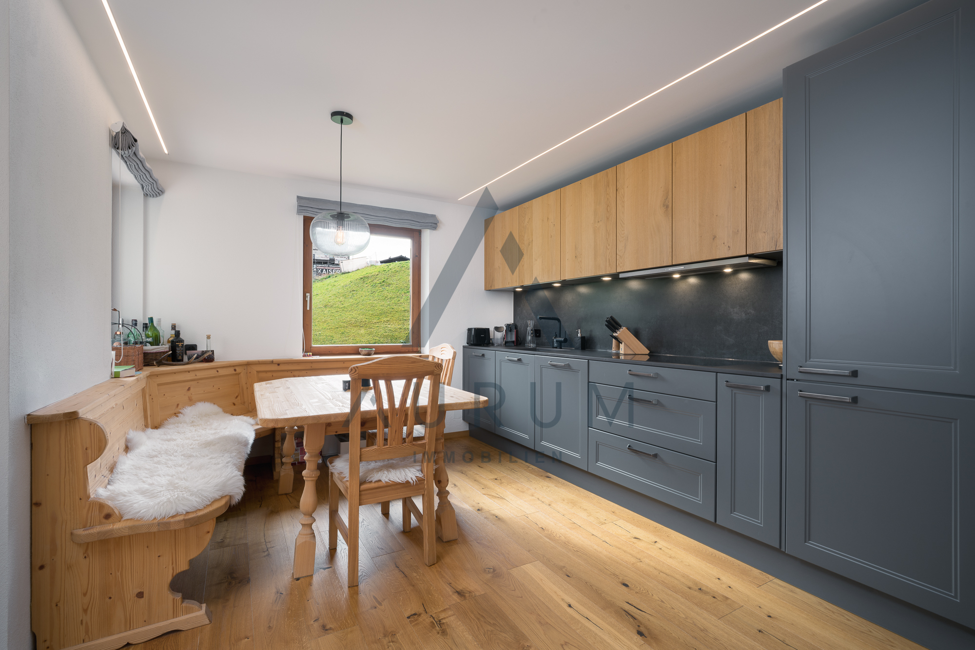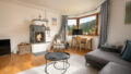Die Wohnung wurde mit hochwertigen Materialien im Jahre 2020 renoviert und verfügt über einen hellen Wohnbereich mit Kachelofen und optisch getrennter, voll ausgestatteter Profiküche mit Mielegeräten. Vom Wohnbereich gelangt man auf den Südbalkon mit Blick auf die Kirche und die umliegenden Wiesen.