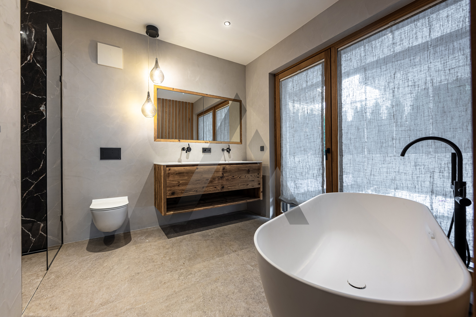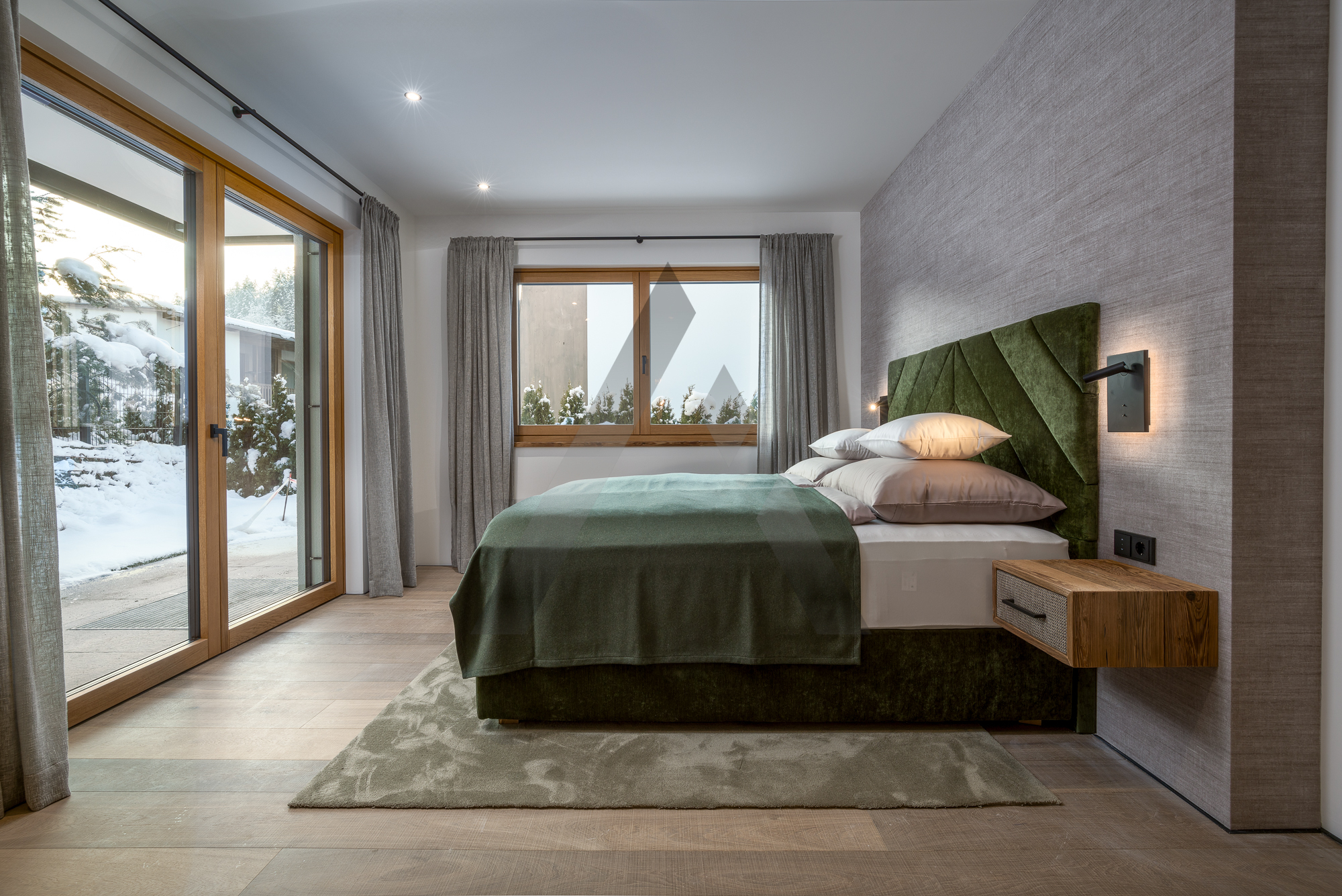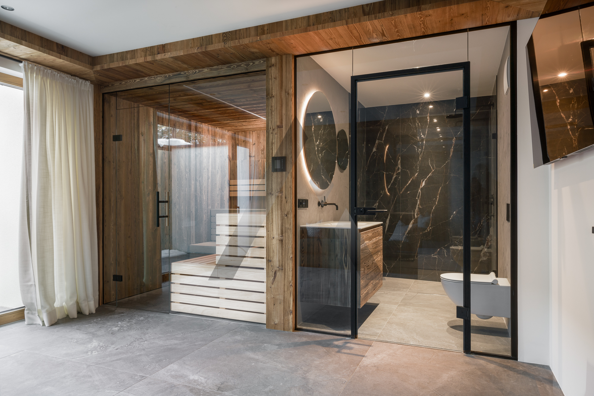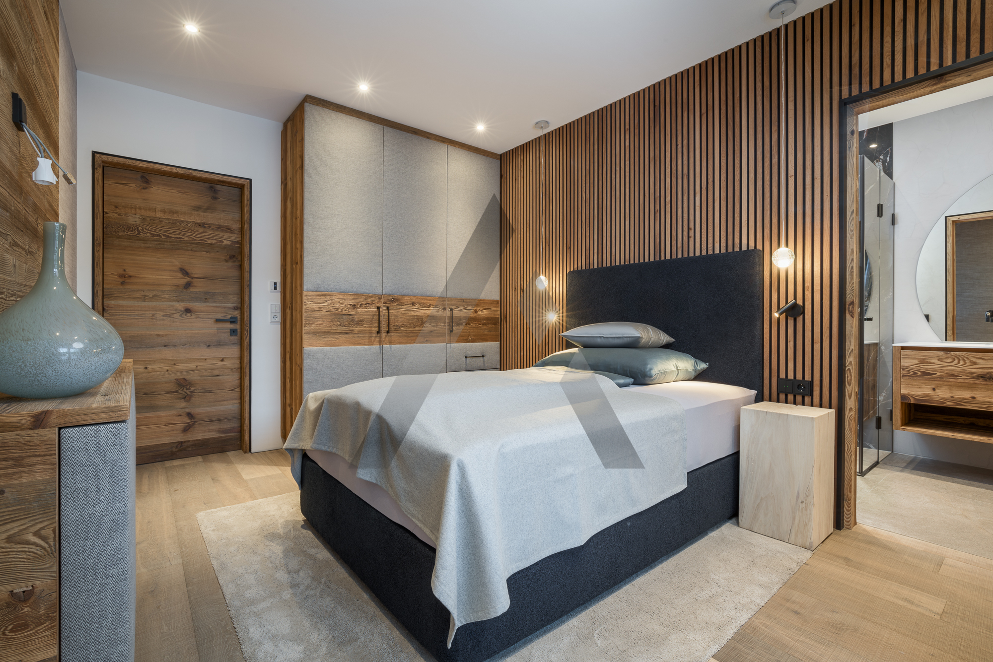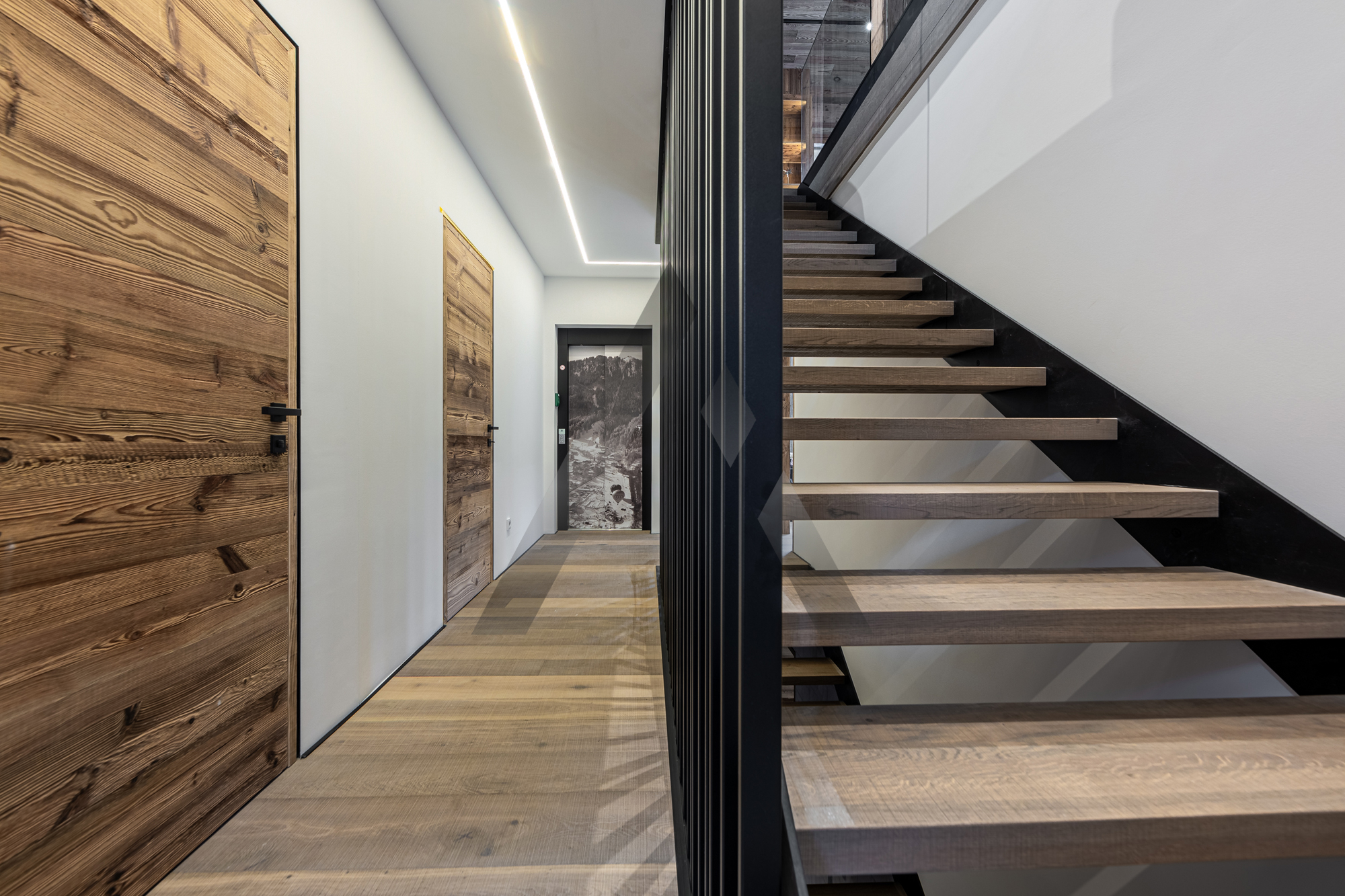 Auf drei Etagen erstrecken sich drei Schlafzimmer mit Bädern en suite, Wellnessbereich, Aufzug, offener Wohn- / Ess- und Kochbereich mit Altholz-Sichtdachstuhl, offener Kamin und Sonnenterrassen mit Blick in die Bergwelt.