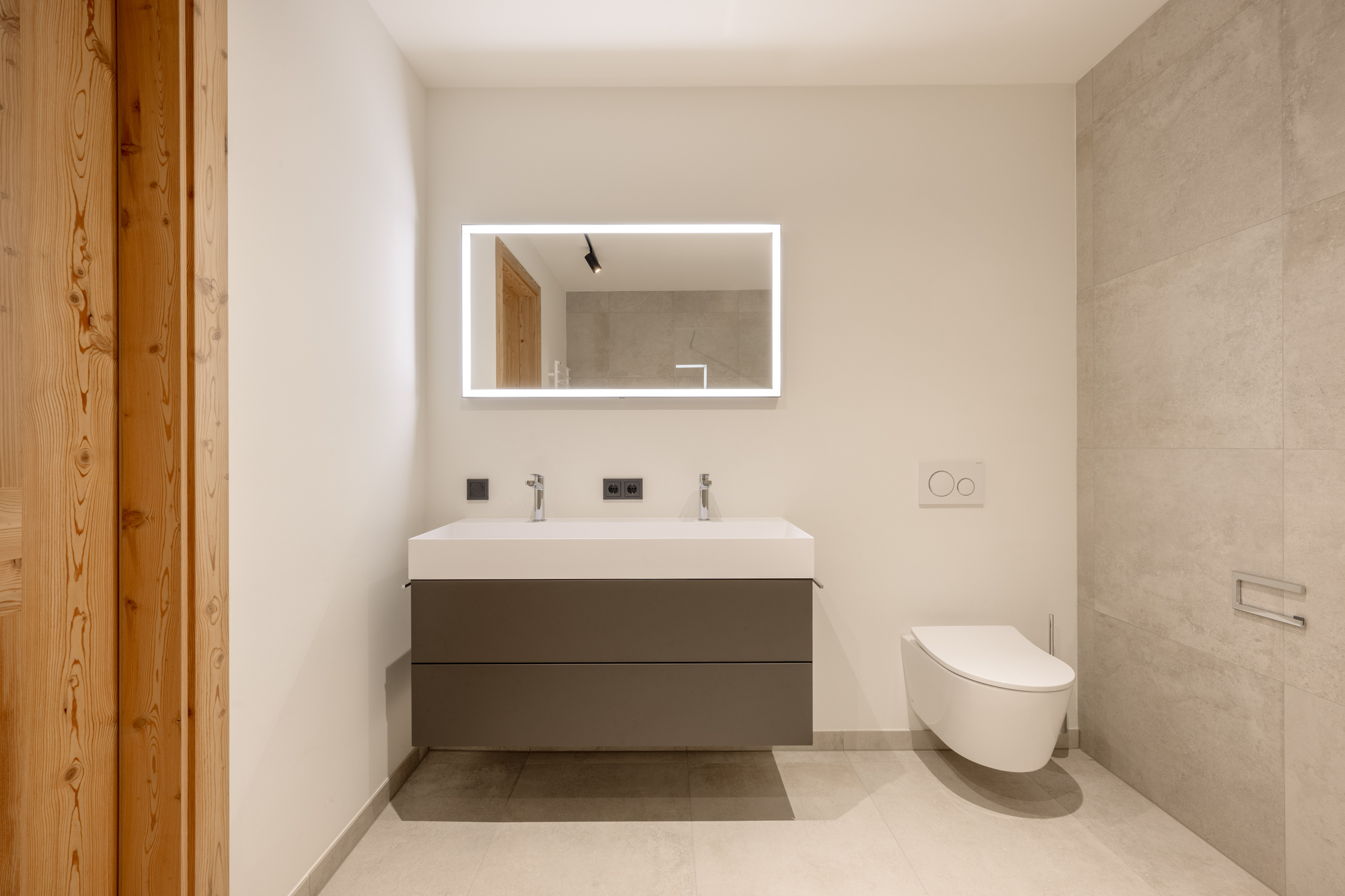 Im Untergeschoss befinden sich ein großzügiges Schlafzimmer mit Bad en suite, ein stilvoller Wellnessbereich mit integrierter Sauna sowie ein Technik- und Abstellraum. Zwei weitere Schlafzimmer, jeweils mit eigenem Bad, sind im Erdgeschoss untergebracht, das zusätzlich über einen praktischen Wirtschaftsraum verfügt.