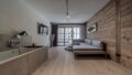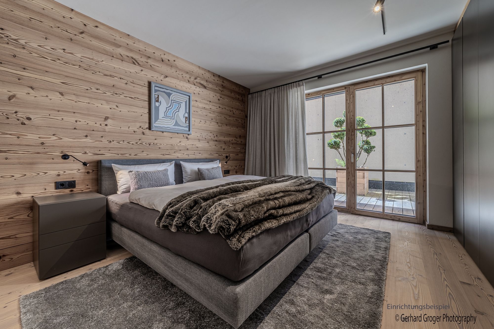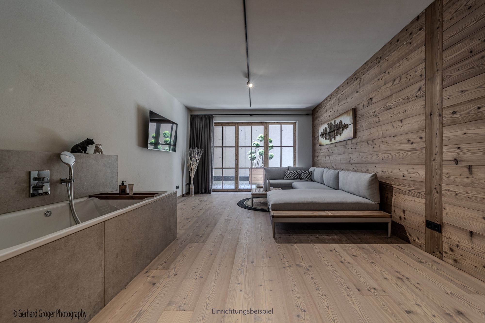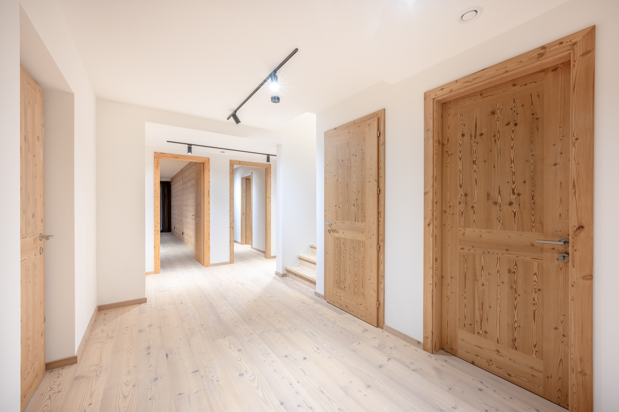 – edle Holzböden in Lärche sowie keramischen Fliesenbelag