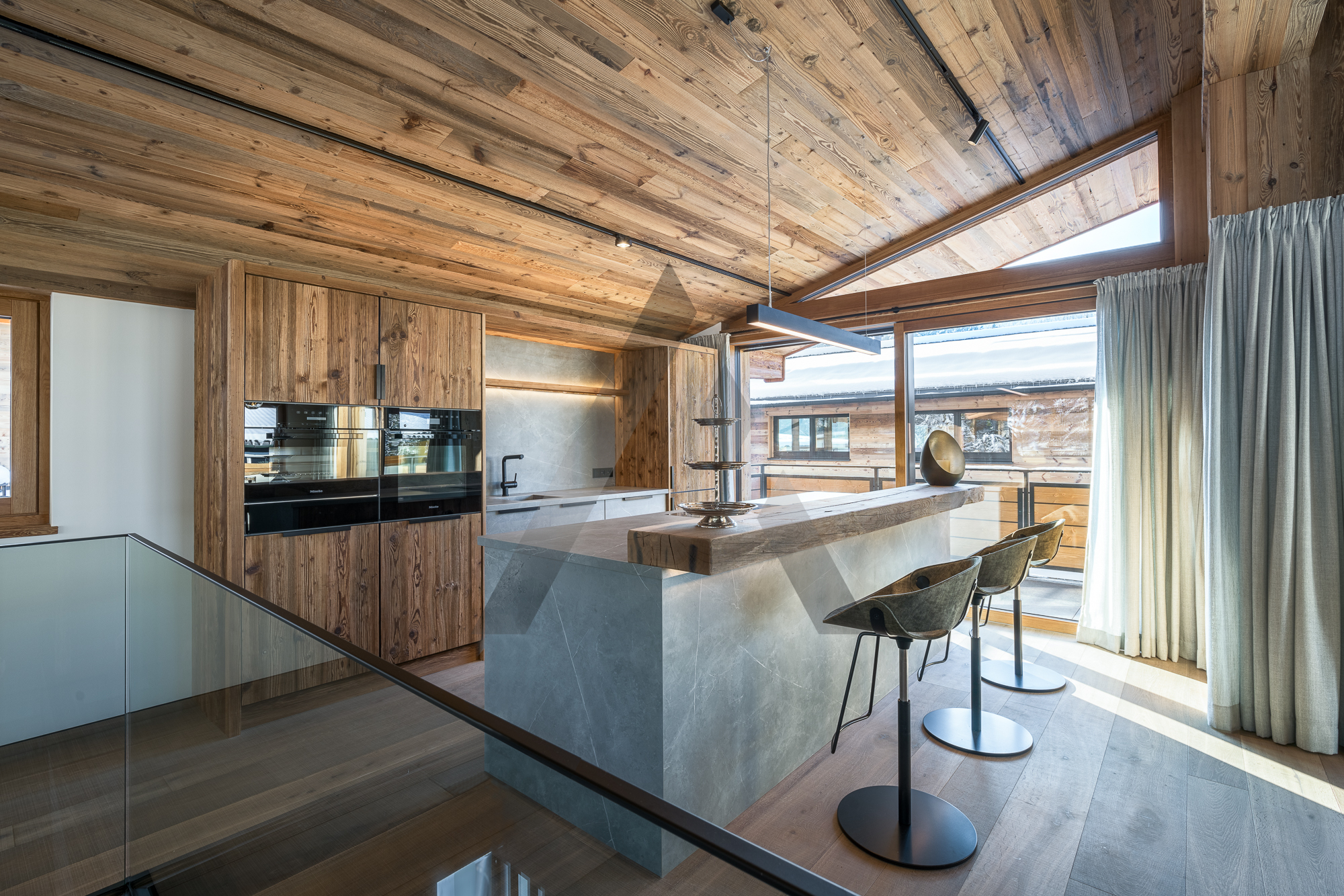 Auf drei Etagen erstrecken sich drei Schlafzimmer mit Bädern ensuite, Wellnessbereich, Aufzug, offener Wohn- / Ess- und Kochbereich mit Altholz-Sichtdachstuhl, offener Kamin und Sonnenterrassen mit Blick in die Bergwelt.