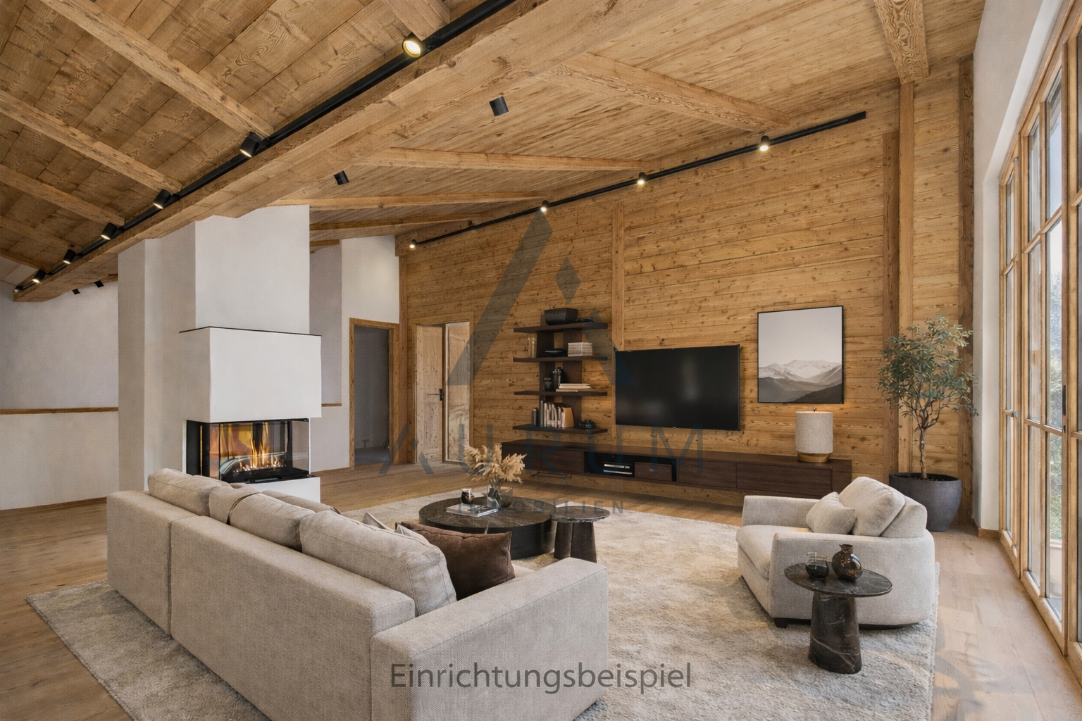 Auf zwei Ebenen erwartet Sie ein offener Wohn- und Essbereich, welcher durch seine großzügige Raumhöhe, edlen Lärchenholzboden und einen gemütlichen Kamin überzeugt.