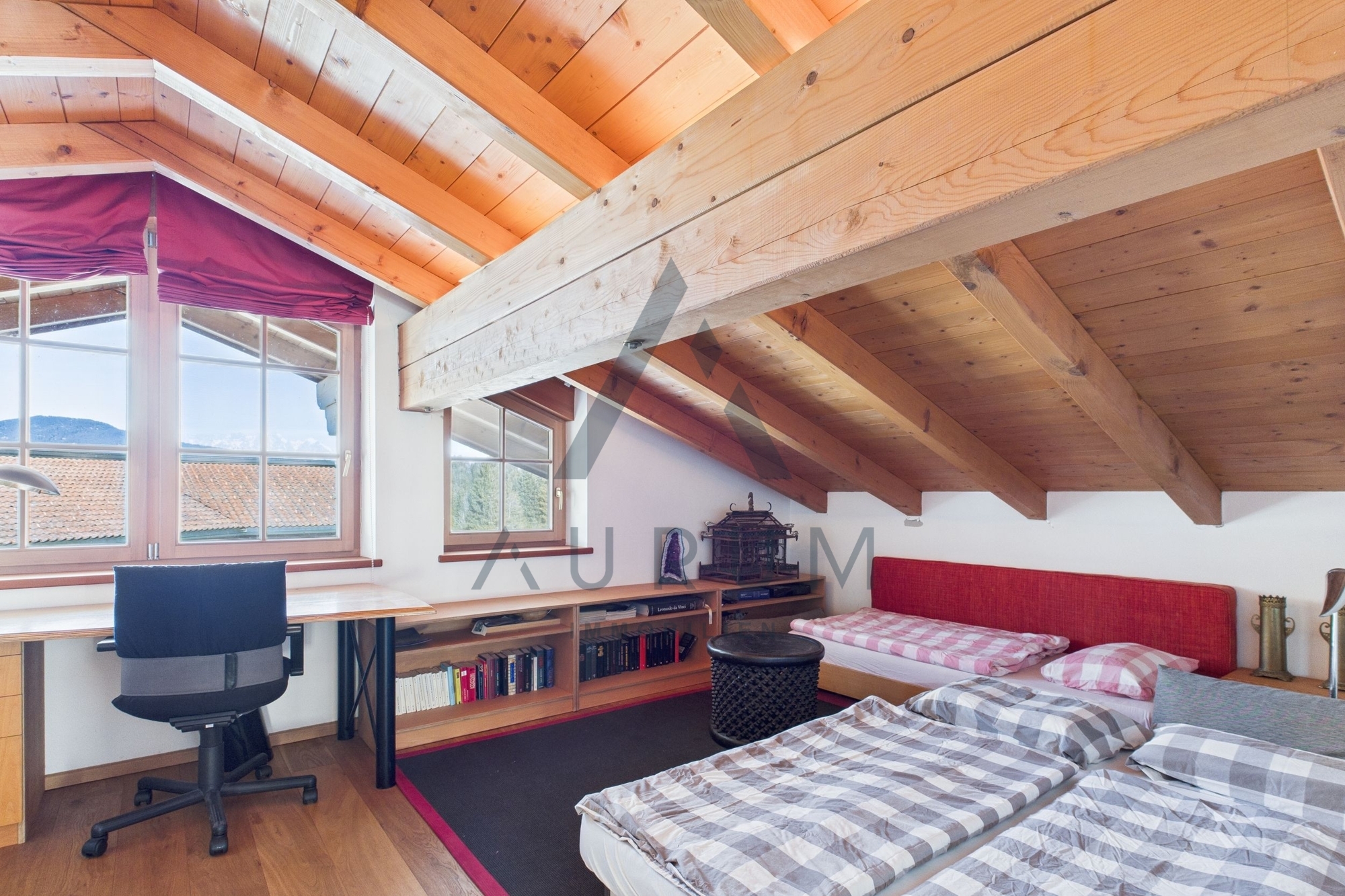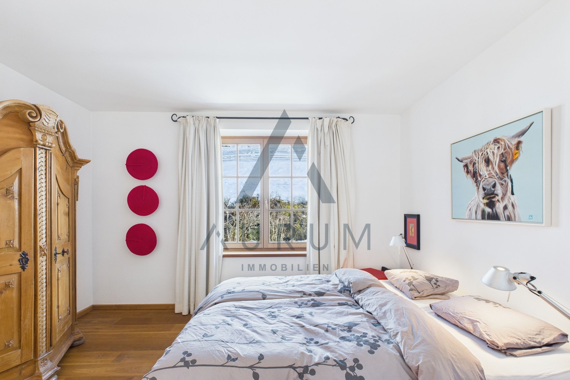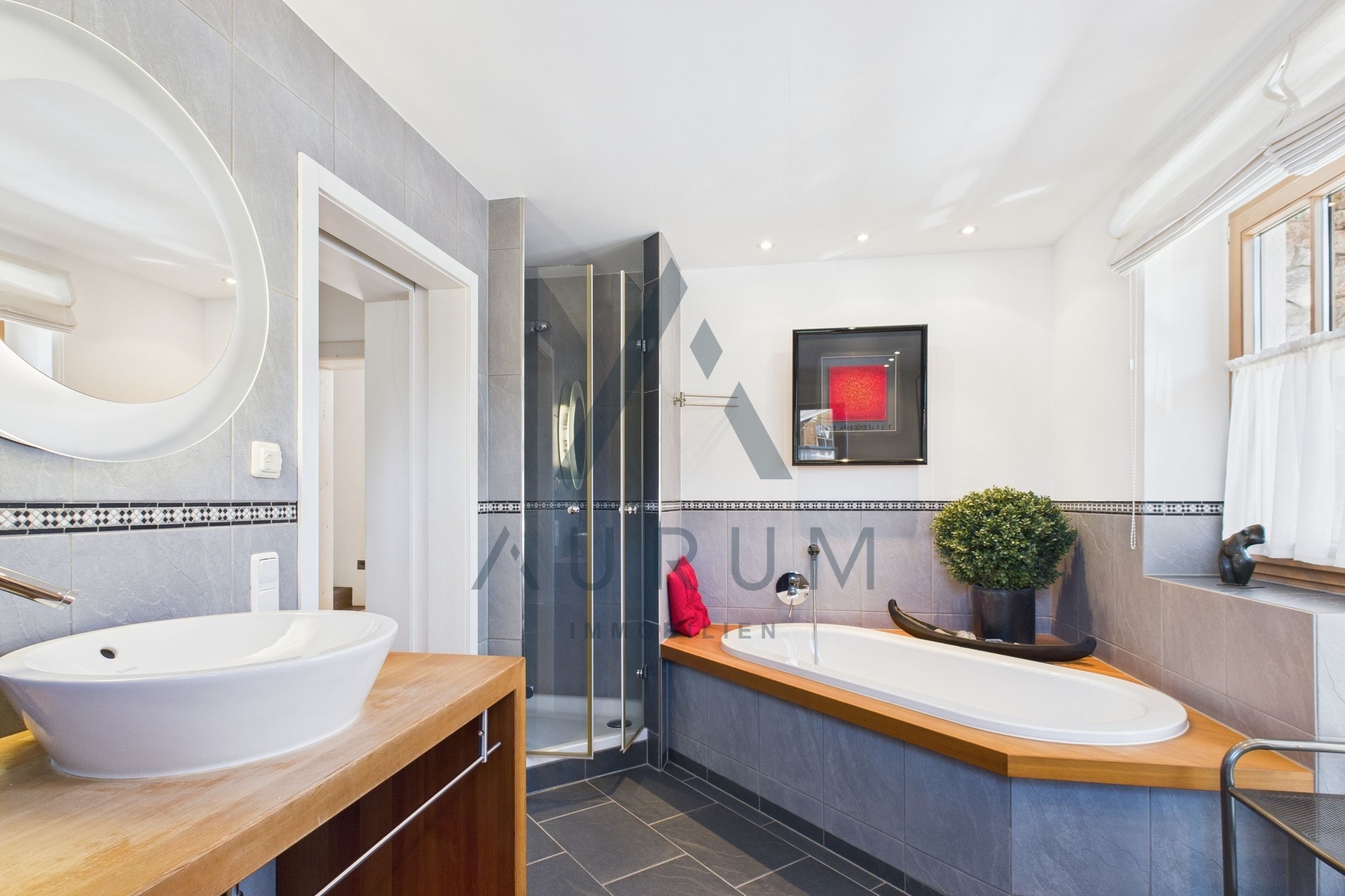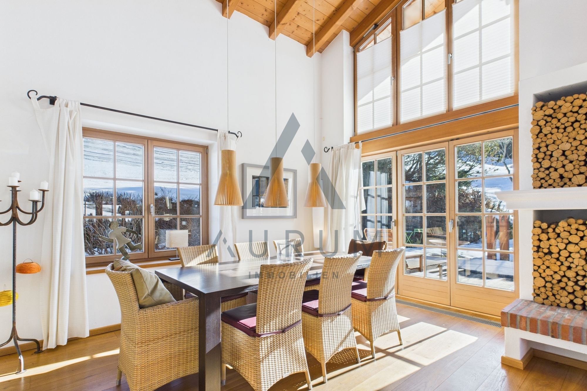 Einer der Highlights dieser Immobilie ist der über 5 Meter hohe Wohn-Essbereich mit offenem Kamin und großen Fensterfronten. Vom Wohnbereich gelangt man direkt auf die Südterrasse und in den Garten. Im Garten befindet sich neben einer Alholzhütte eine in Alholz gestaltete Hütte mit Saunaanschluss.