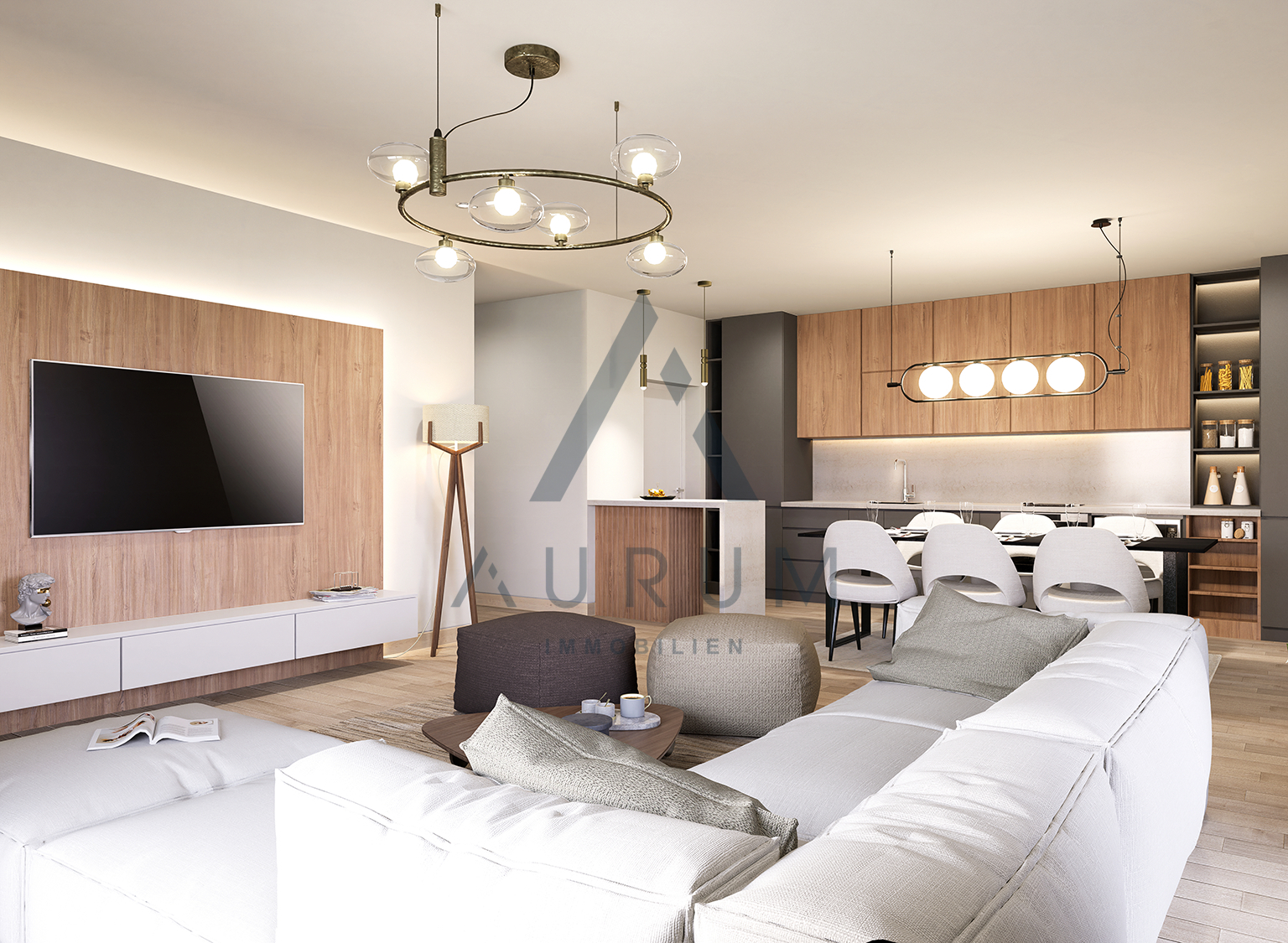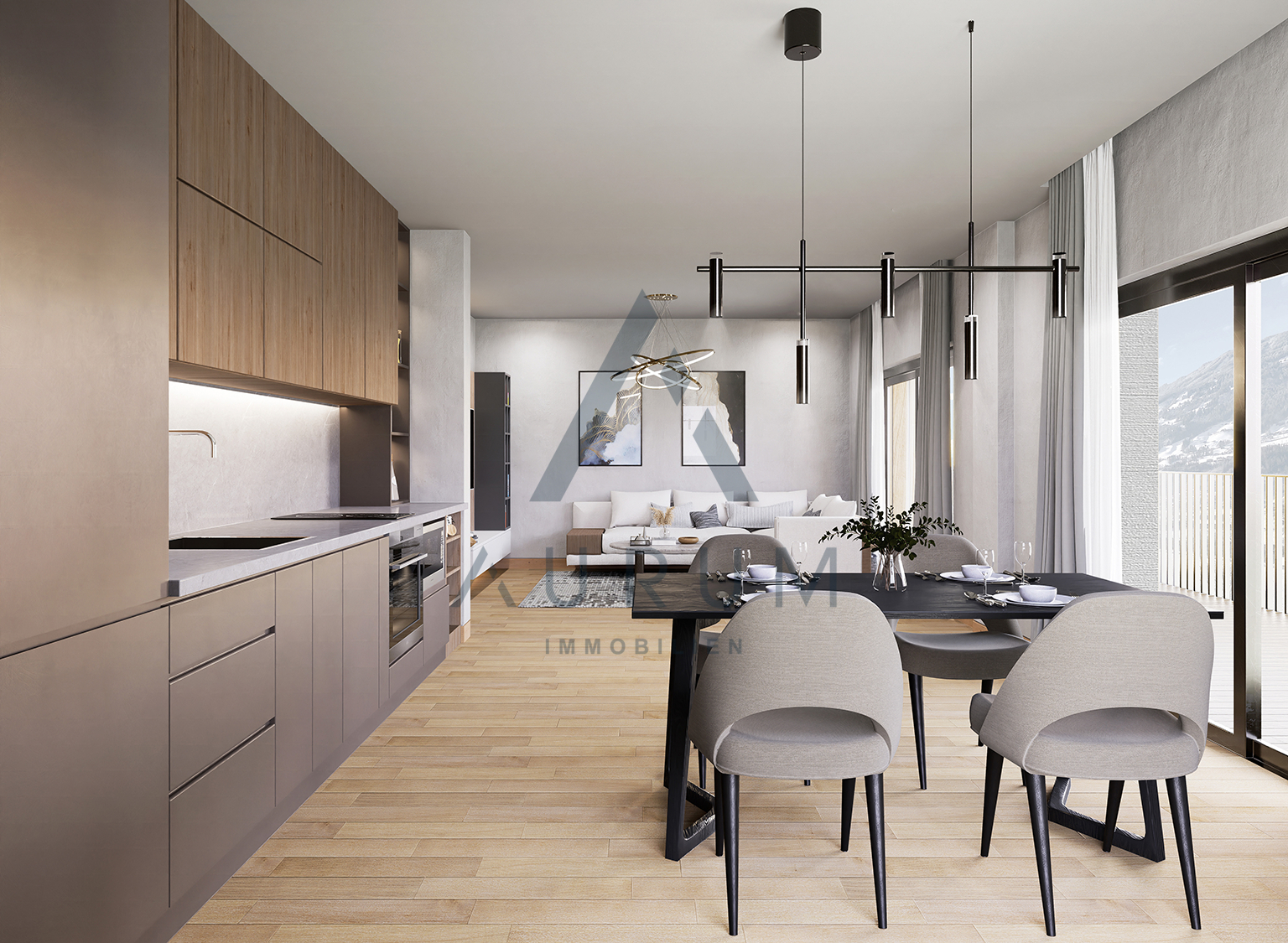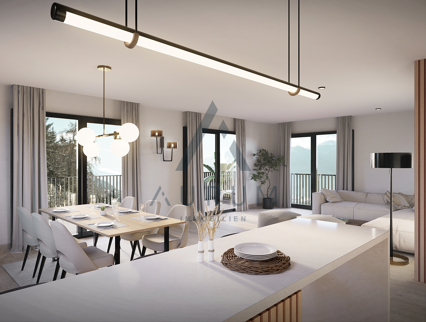 Die hochwertige Ausstattung umfasst Eichenparkett in Landhausdielenoptik, Fußbodenheizung, großformatige Fliesen in Bad und WC, elektrische Raffstores sowie große Fensterflächen für helle, freundliche Räume. Ergänzt wird das Angebot durch eine Tiefgarage, Fahrrad- und Skiräume sowie praktische Nebenflächen.