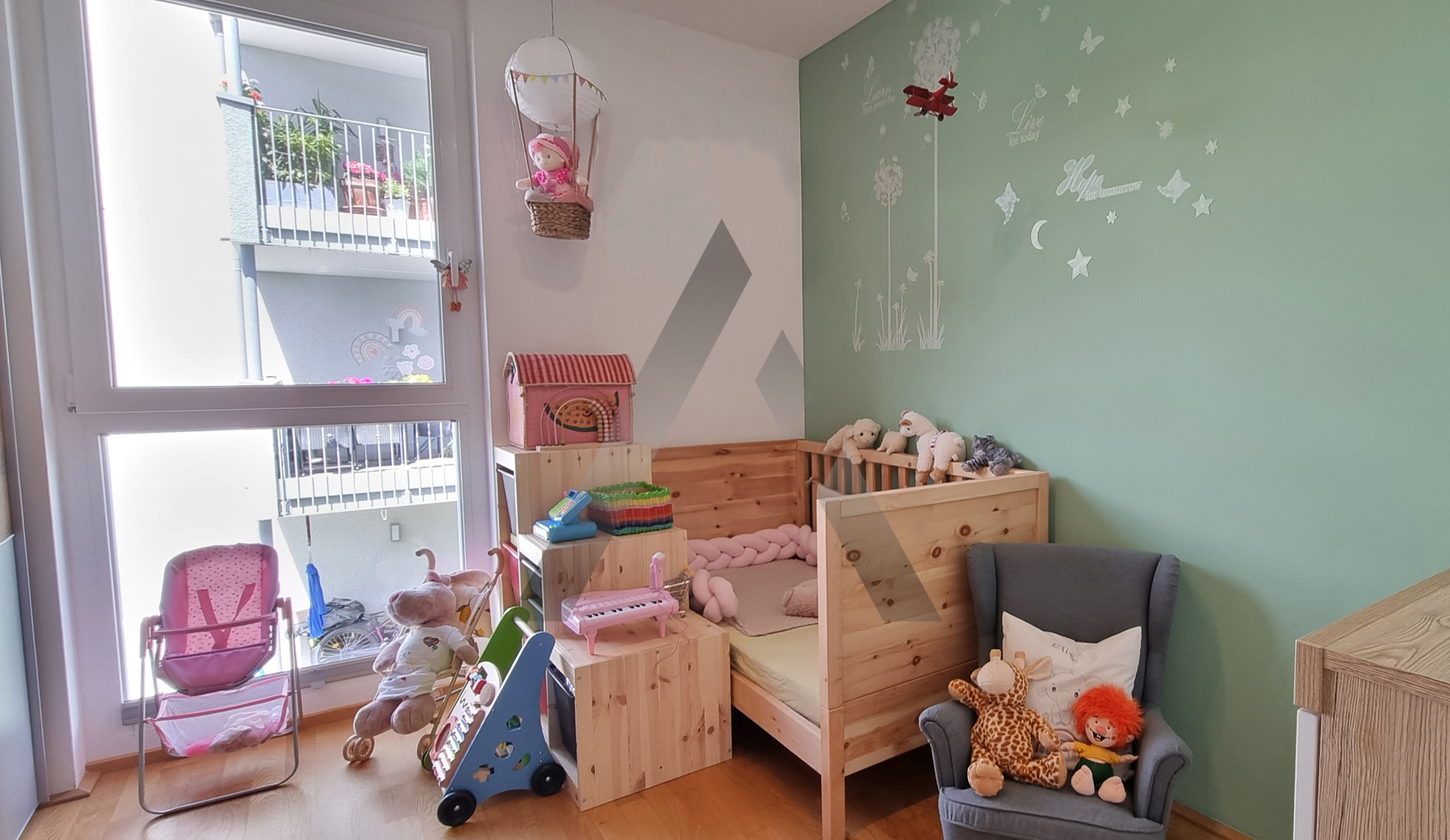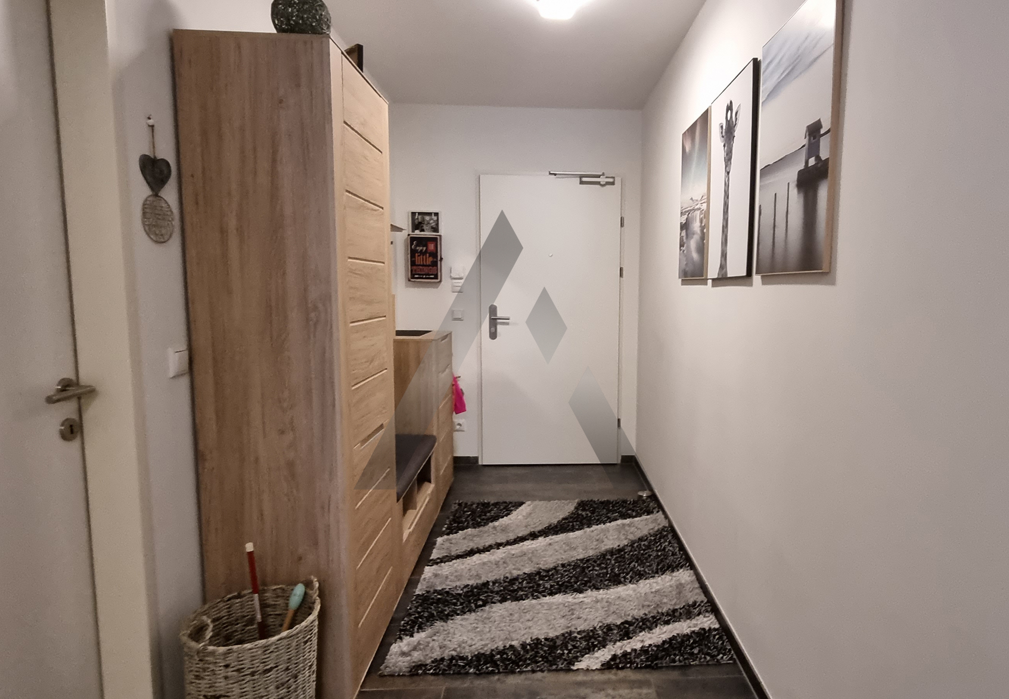Die Wohnung verfügt über eine Garderobe, zwei Schlafzimmer mit großen Fensterfronten, ein Gäste WC, ein Badezimmer mit Badewanne und Dusche, sowie einen gemütlichen und großzügigen Wohn-/Essraum mit Balkonzugang. Die Küche wurde mit modernen Geräten ausgestattet. Der Balkon, welcher südseitig ausgerichtet ist, bietet viel Platz zur Erholung.