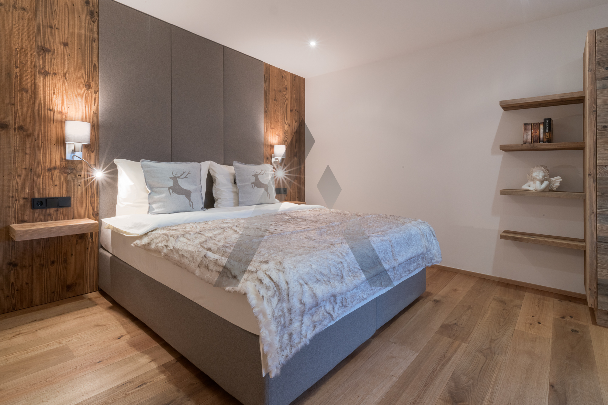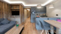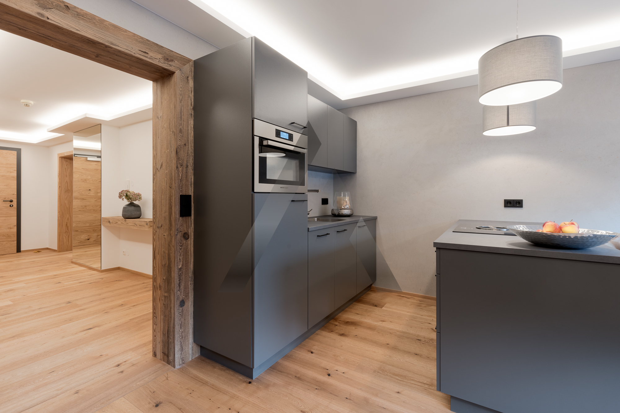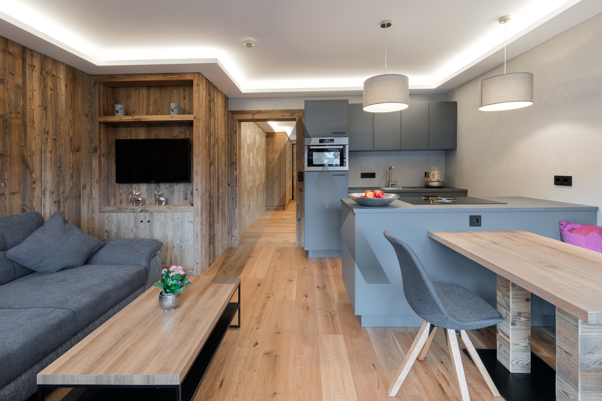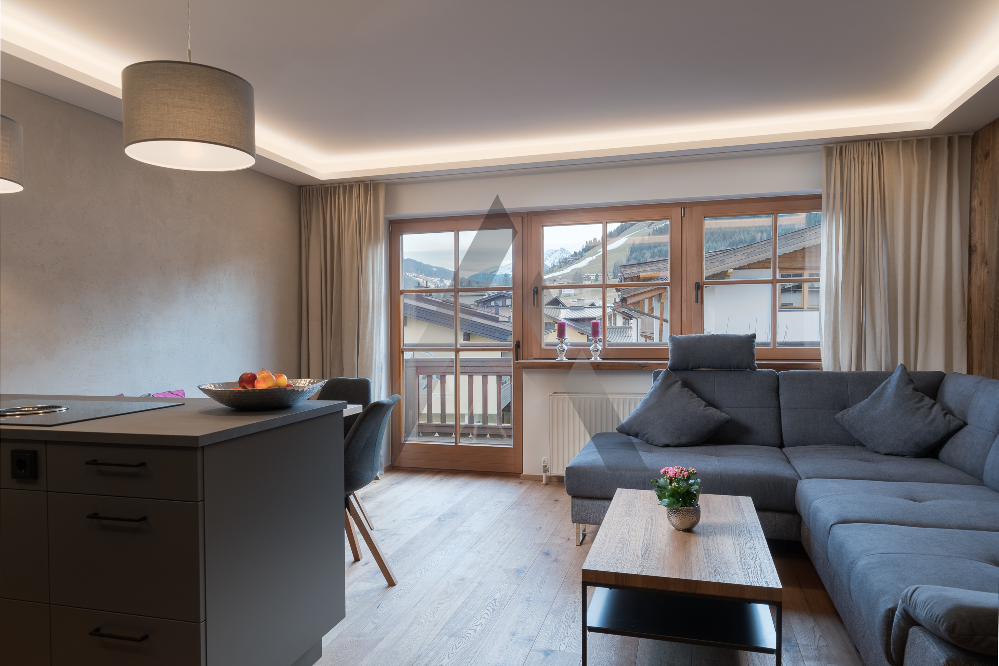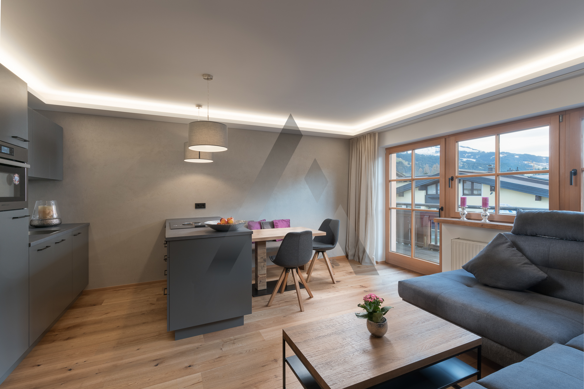 Die Wohnung wurde mit hochwertigen Materialien und komplett im modern-alpinen Stil ausgebaut und verfügt über einen perfekt ausgestatteten Wohn-/Essbereich mit moderner Küche, ein großes Schlafzimmer sowie ein Badezimmer.