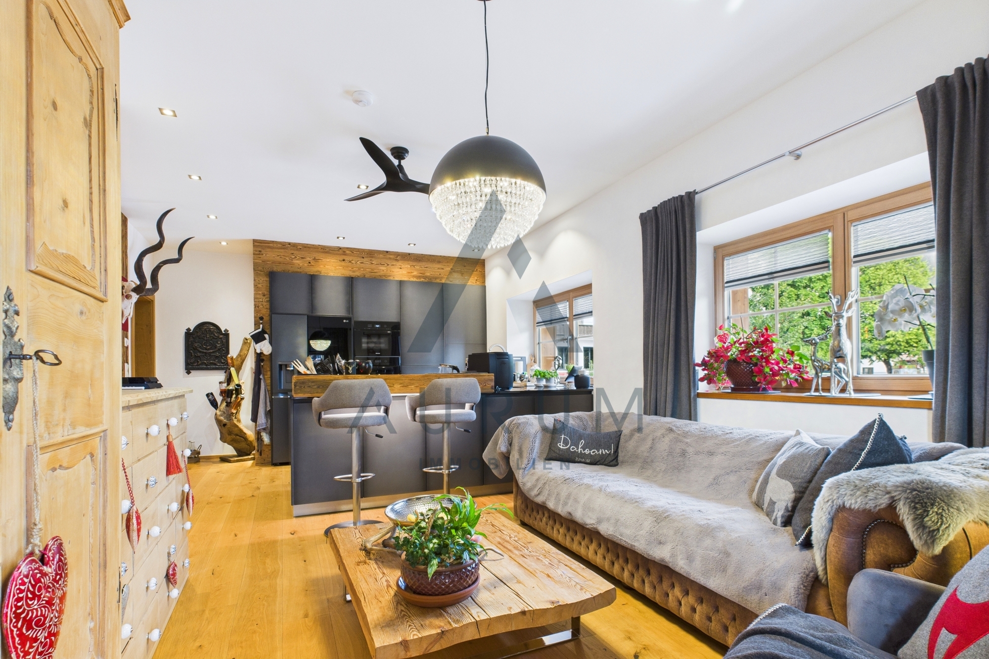 Die Wohnung überzeugt mit einer äußerst hochwertigen Ausstattung: Sämtliche Möbel und Einbauten sind aus edlem Echtholz gefertigt. Die stilvolle Einbauküche mit Geräten von Miele und Bora lässt keine Wünsche offen und begeistert mit Funktionalität und Design auf höchstem Niveau.