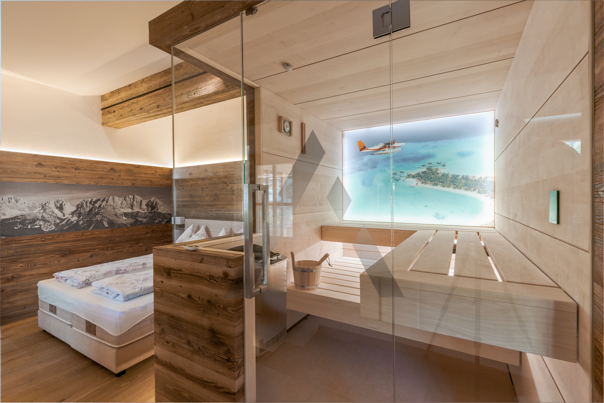 Über das Kaminzimmer gelangen Sie in das sehr gemütliche Schlafzimmer mit eigener Sauna und Badezimmer ensuite.