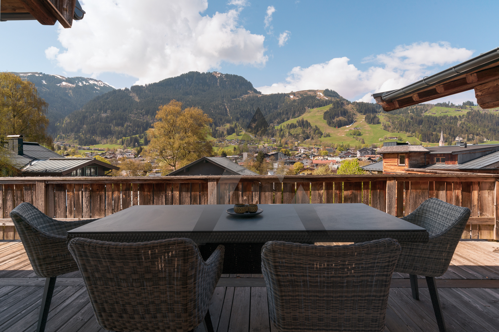 Das Highlight dieser Wohnung ist der über 100 m² große Wohn-/ Ess-/ Küchenbereich im Dachgeschoss mit Sichtdachstuhl. Die hochwertige Küche ist mit Mielegeräten und einem Boraherd ausgestattet und verfügt über eine Back-Kitchen (möblierter Vorbereitungs- und Vorratsraum). Vom Essbereich gelangen Sie auf die Westterrasse mit Blick auf Kitzbühel. Vom Wohnbereich und vom Kaminzimmer gelangen Sie auf den umlaufenden Balkon, von wo Sie Sonne und Ausblick in alle Himmelsrichtungen genießen können.