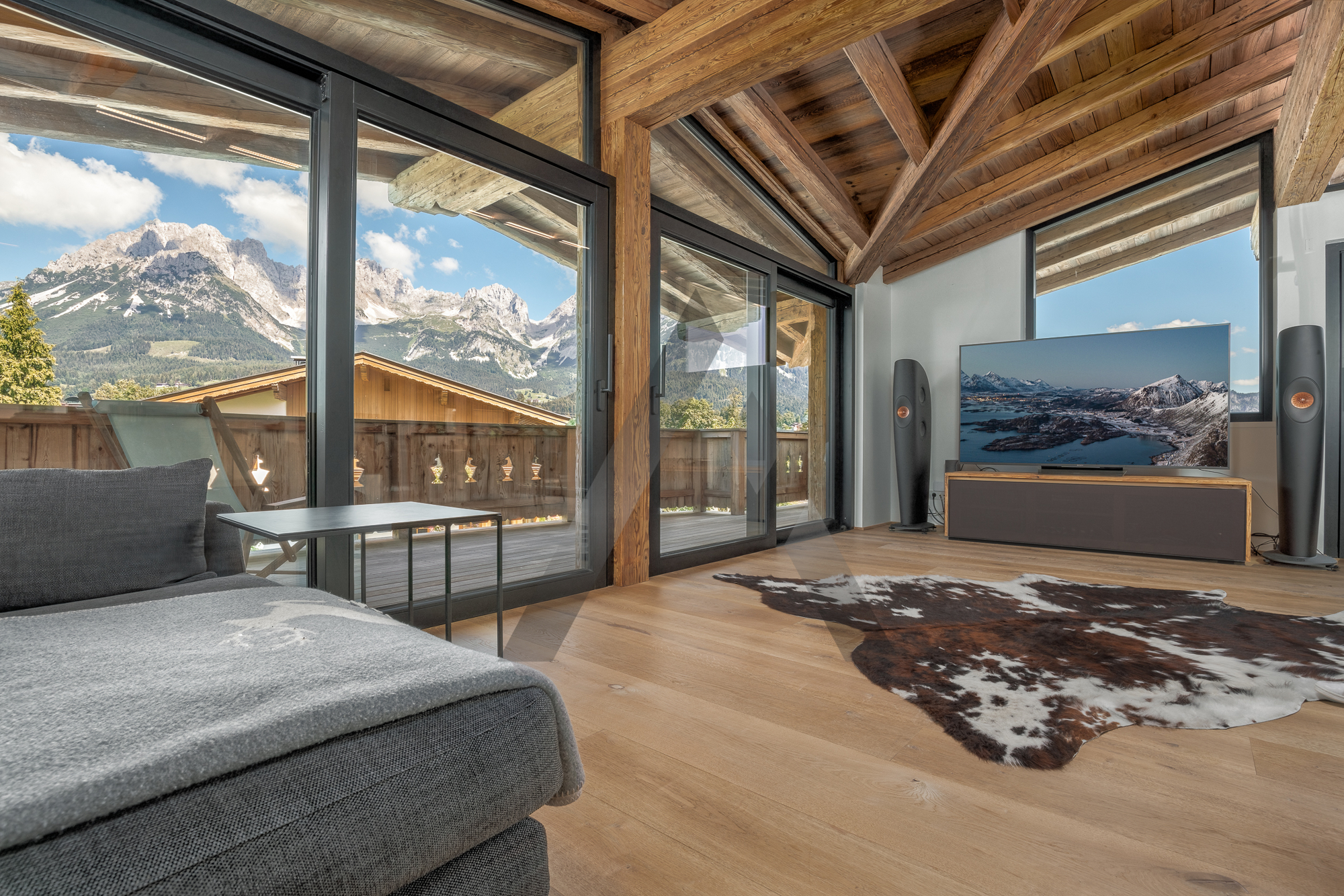 In ruhiger, sonniger leichter Hanglage in einer Sackgasse mit traumhaften Panoramablick und unmittelbarer Skipistenanbindung befindet sich dieses hochwertige Chalet mit atemberaubenden Ausblick auf den Wilden Kaiser.