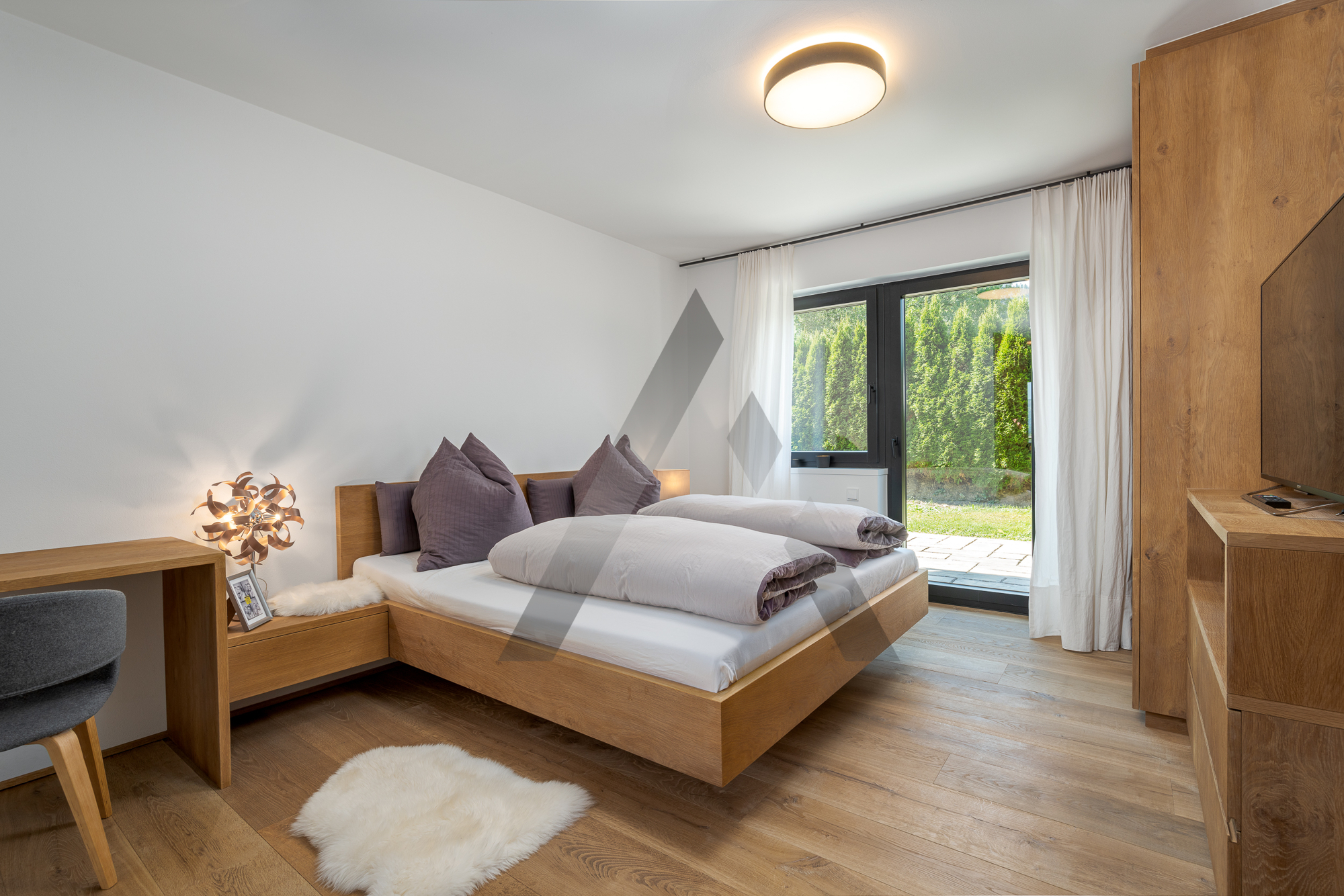 Im Erdgeschoss befinden sich zwei Schlafzimmer mit je Bad en suite und Terrassenzugang sowie der Eingangsbereich.