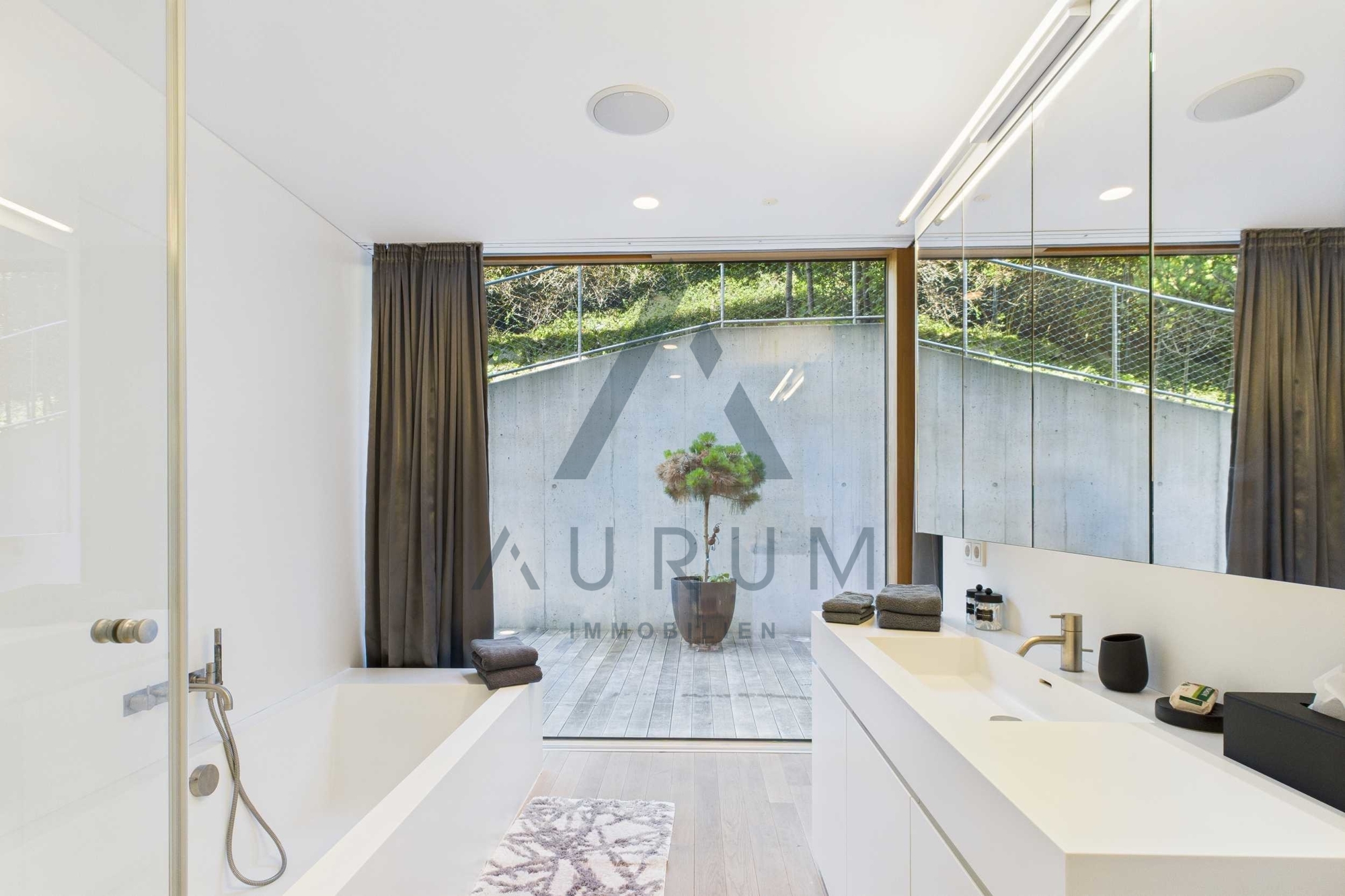 Das gesamte Gebäude ist durch großzügige Glasflächen sehr hell und offen gestaltet. Alle Fensterfronten sind mit elektrischen Raffstores ausgestattet und lassen sich über eine zentrale BUS-Steuerung regulieren. Beleuchtung, Beschattung, Heizung und weitere Funktionen können ebenfalls über dieses System gesteuert werden. Die Ausstattung umfasst hochwertige Materialien wie maßgefertigte Einbauschränke, Holz- und Feinsteinböden sowie moderne Sanitärausstattung.