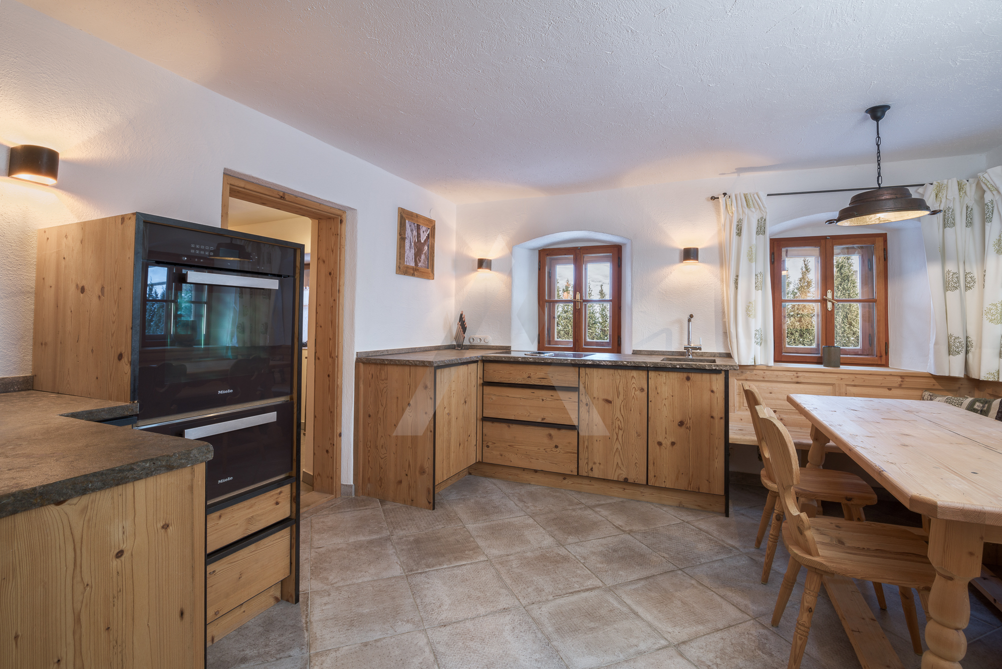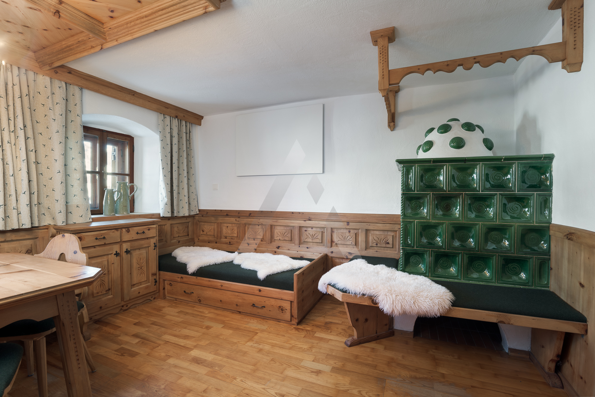 Im Erdgeschoss steht zusätzlich eine charmante, modernisierte Stubenküche mit Kachelofen zur Verfügung, die den ursprünglichen Charakter des Hauses bewahrt.