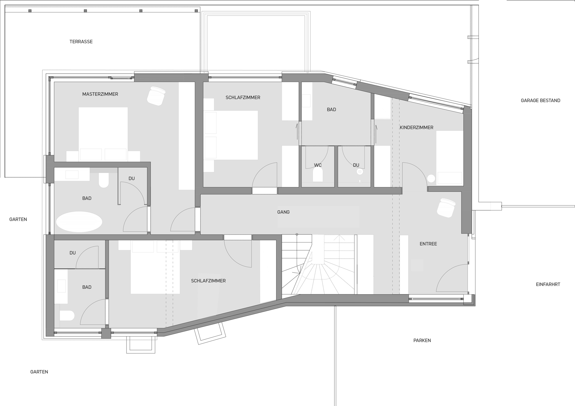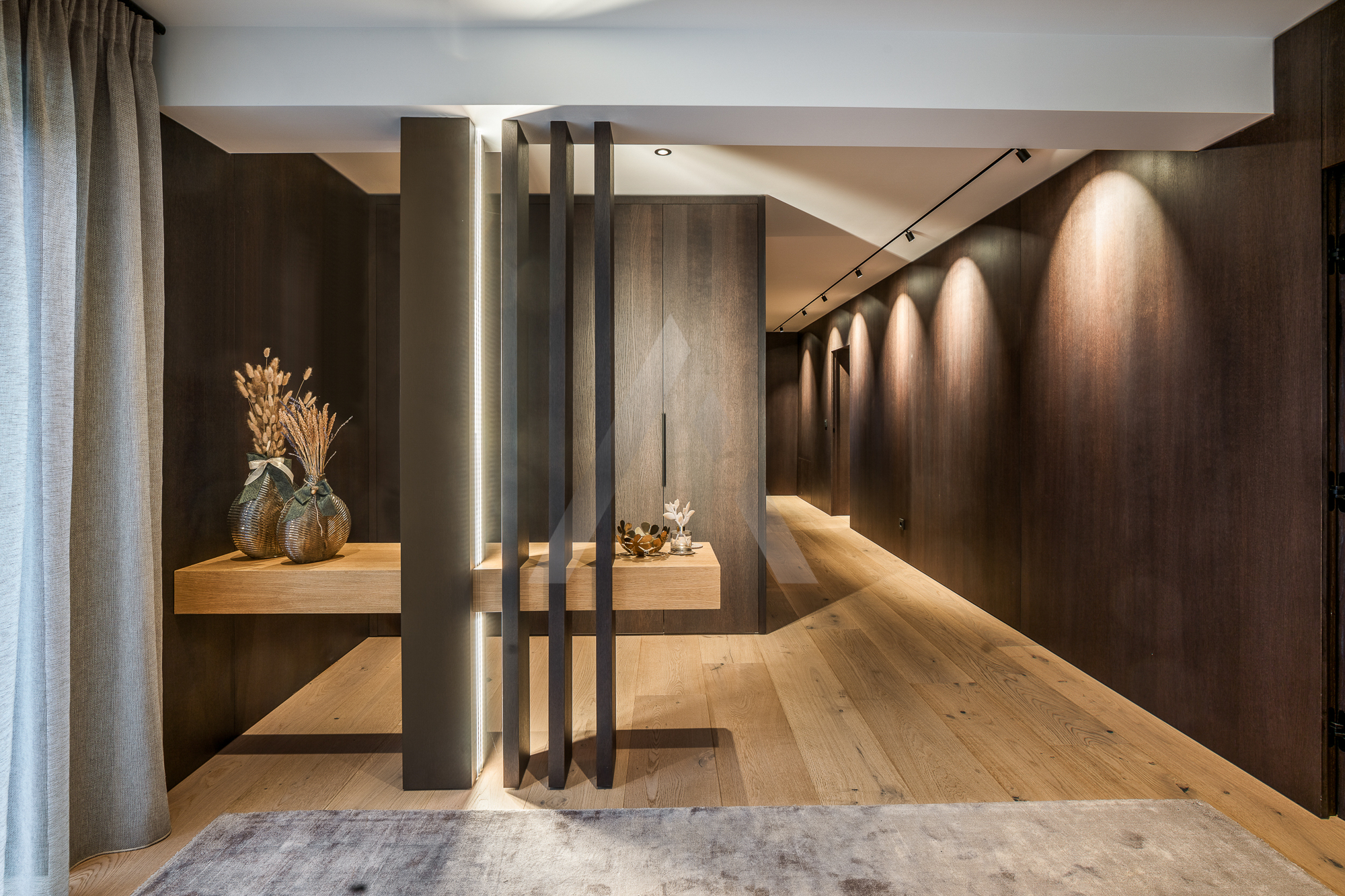 Die großzügig bemessene Diele mit Garderobe sorgt für den sehr stimmigen ersten Eindruck. Auf dieser Ebene befinden sich der Masterbereich mit Ankleide und einem lichtdurchflutendem Badezimmer, sowie zwei weitere Schlafzimmer mit gemeinsamen Badezimmer.