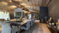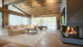 Eines der Highlights ist der großzügige Wohn-Ess-Küchenbereich mit Altholzsichtdachstuhl, bodentiefen Panoramaverglasungen und einem offenem Kamin mit Natursteinverkleidung.