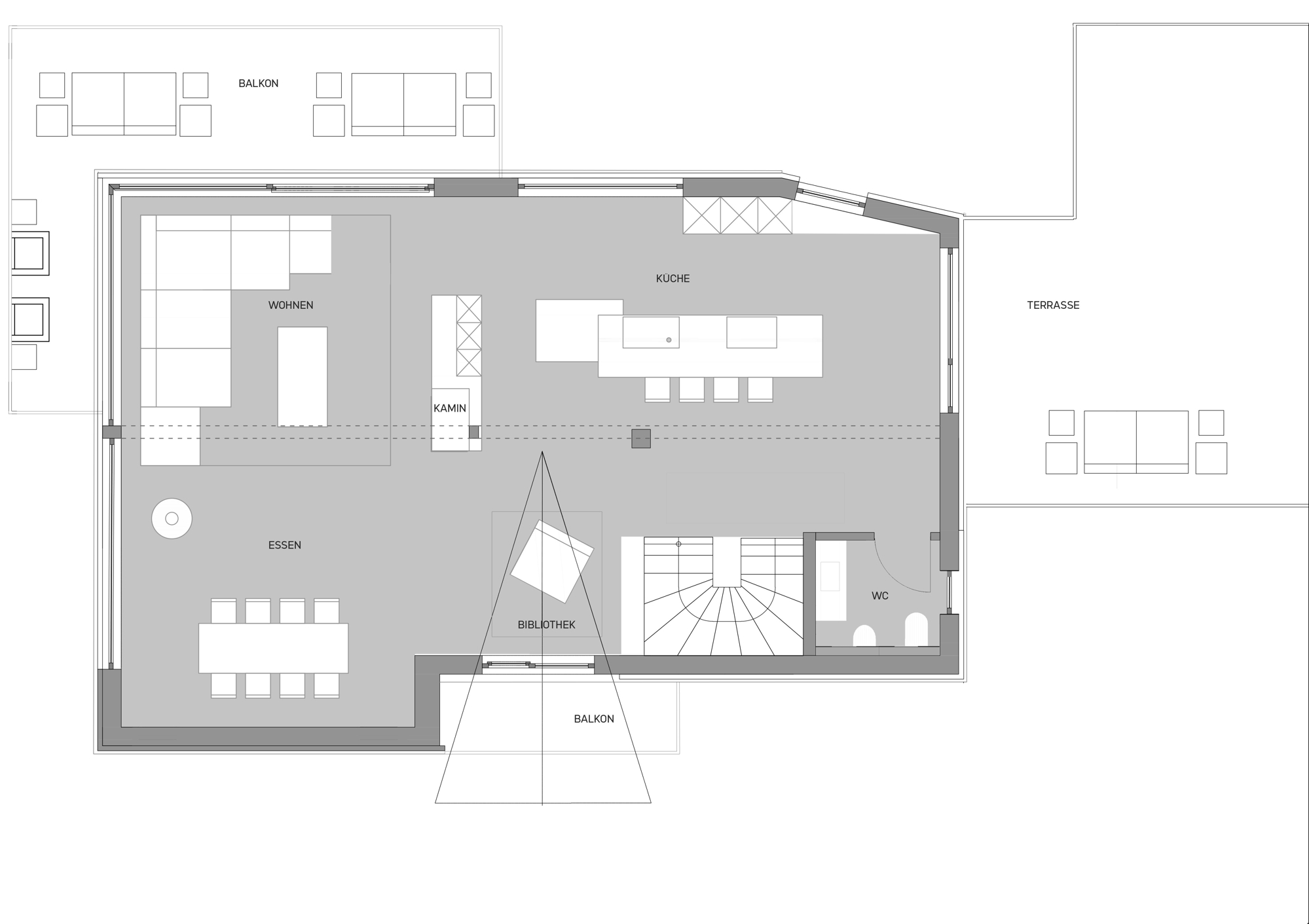 Die Profiküche in Keramik „LAPITEC Bianco Crema vesuvio und dune“ gefertigt, verfügt über die neuesten Miele und Gaggenau Geräte. Vom Küchenbereich gelangen Sie auf die Dachterrasse, welche teils überdacht und mit einem Grill, einer Feuerschale und einem Aussen-Loungebereich ausgestattet ist.