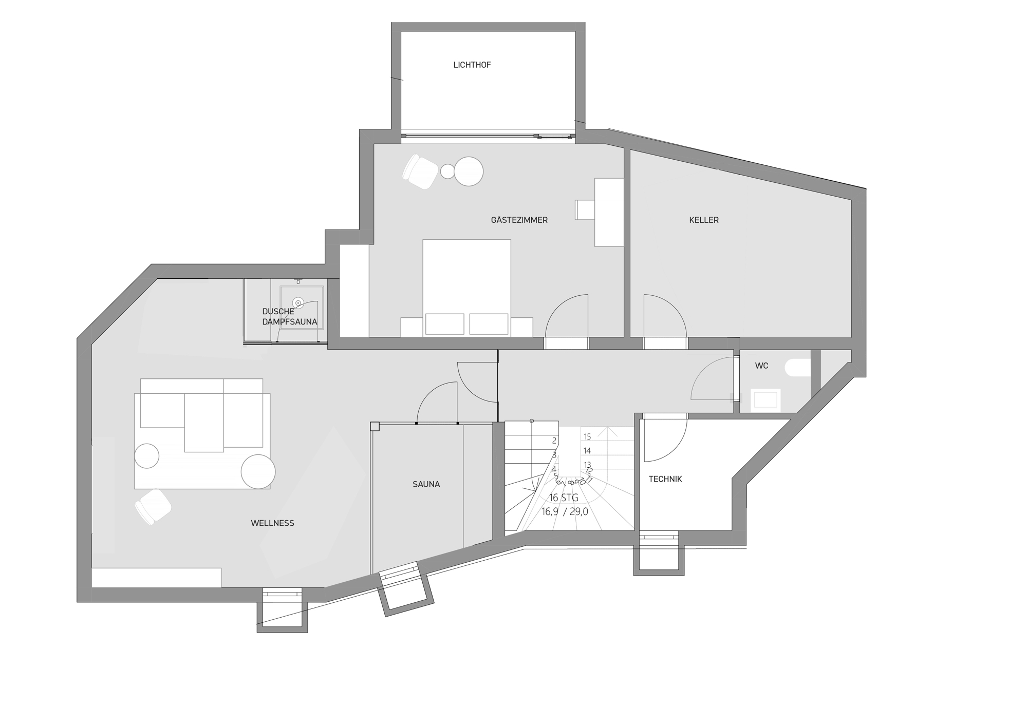 Als besonderes Highlight im Untergeschoss gilt sicherlich der Wellnessbereich mit Sauna, Dampfbad, Wellnessdusche, Toilette und Relaxzone. Weiters bietet diese Ebene ein Gästeschlafzimmer mit Badezimmer ensuite, sowie genügend Technik-, Wirtschafts- und Lagerräume.