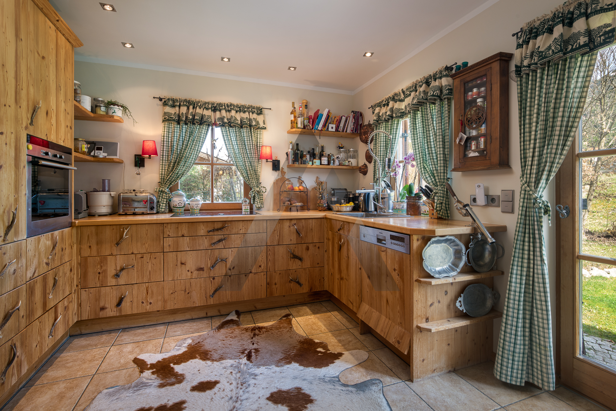 Im Erdgeschoss befindet sich in Zirbe und Altholz der optisch getrennte Wohn-, Ess- und Küchenbereich mit einem traditionellen Tiroler Kachelofen und direkten Zugang in den Garten und auf die großzügige Terrasse. Der Garten wurde liebevoll mit Rosenbeeten, Bäumen und Sträuchern gestaltet.