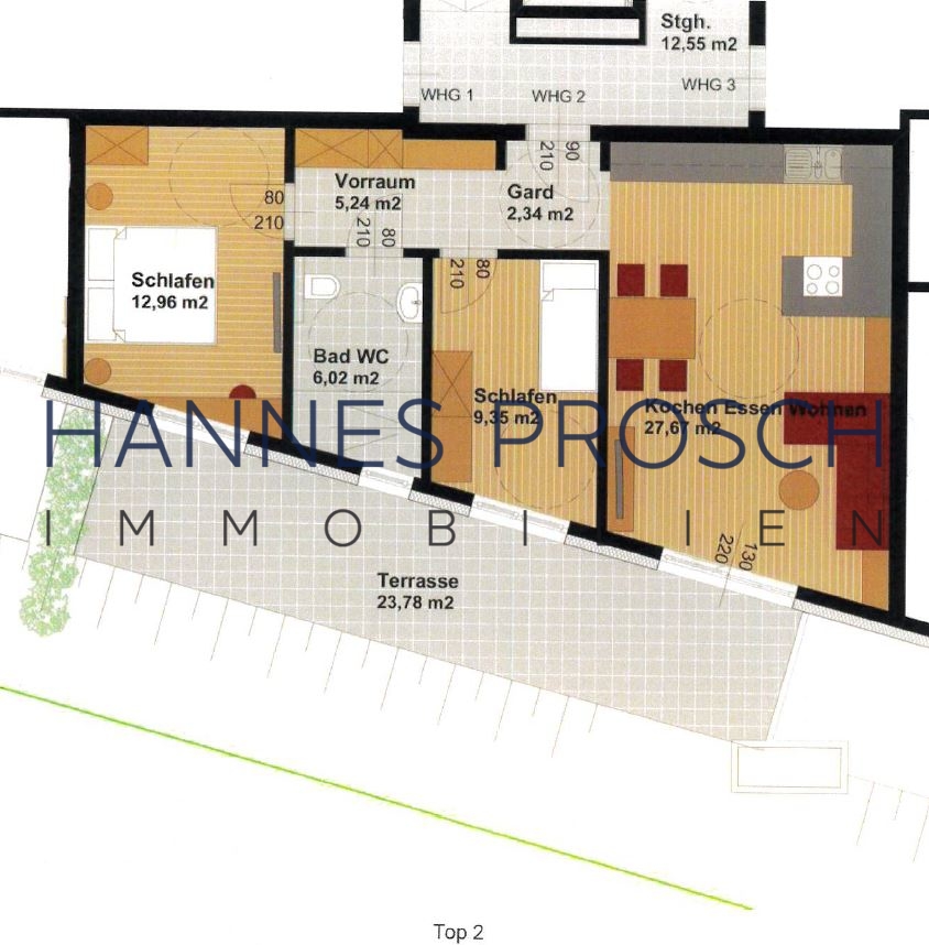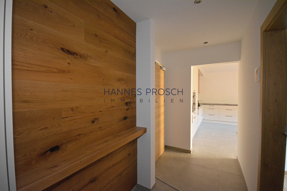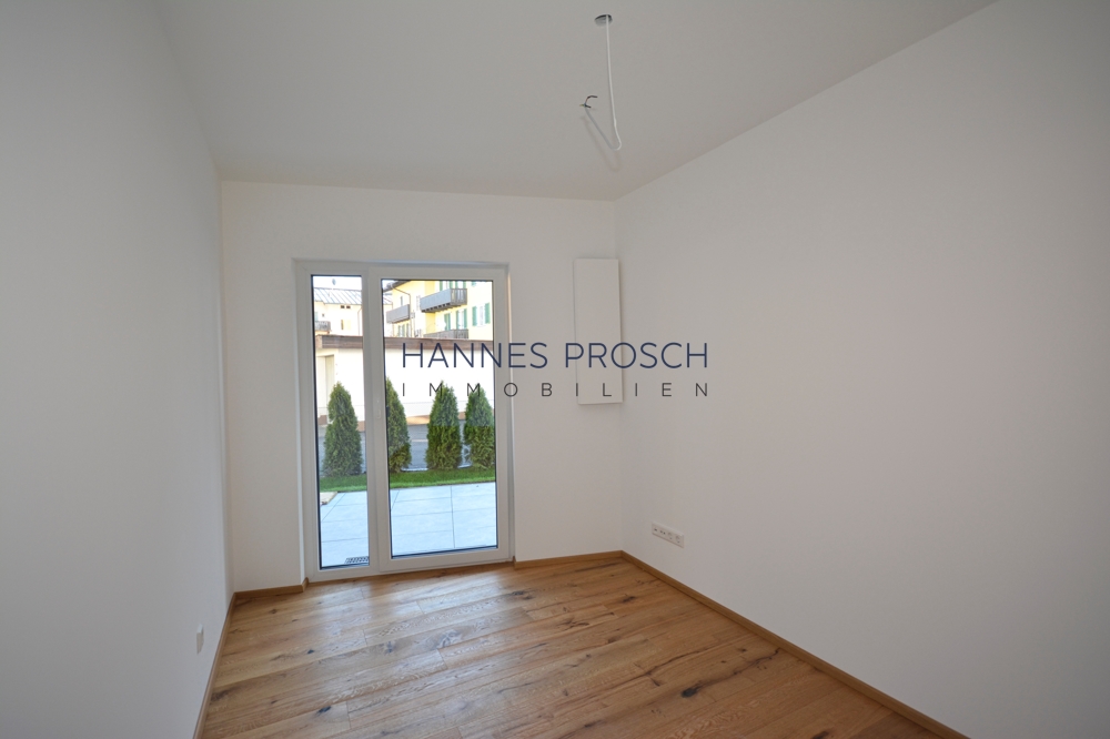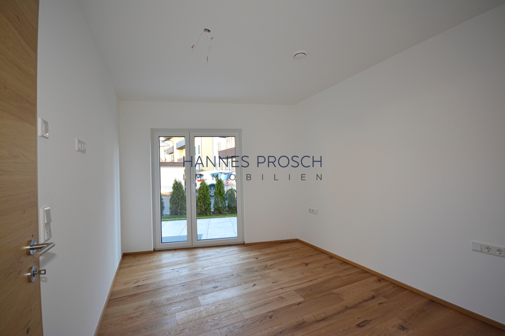 Über das Stiegenhaus mit Lift gelangt man in die Einheit. Vom Garderobenbereich sind beide Schlafzimmer mit direktem Terrassenzugang zu erreichen. Auch das Wohnzimmer mit offener Küche hat Zugang zum Garten. Das Bad mit großer Eckdusche verfügt über ein Fenster und einen Handtuchtrockner.